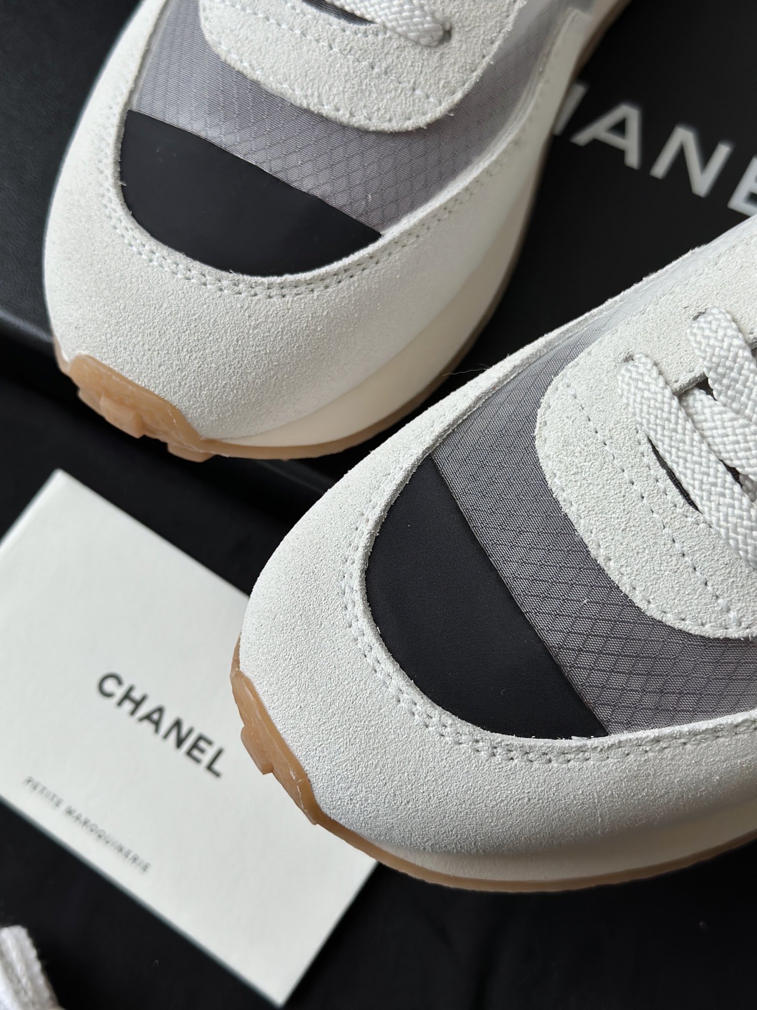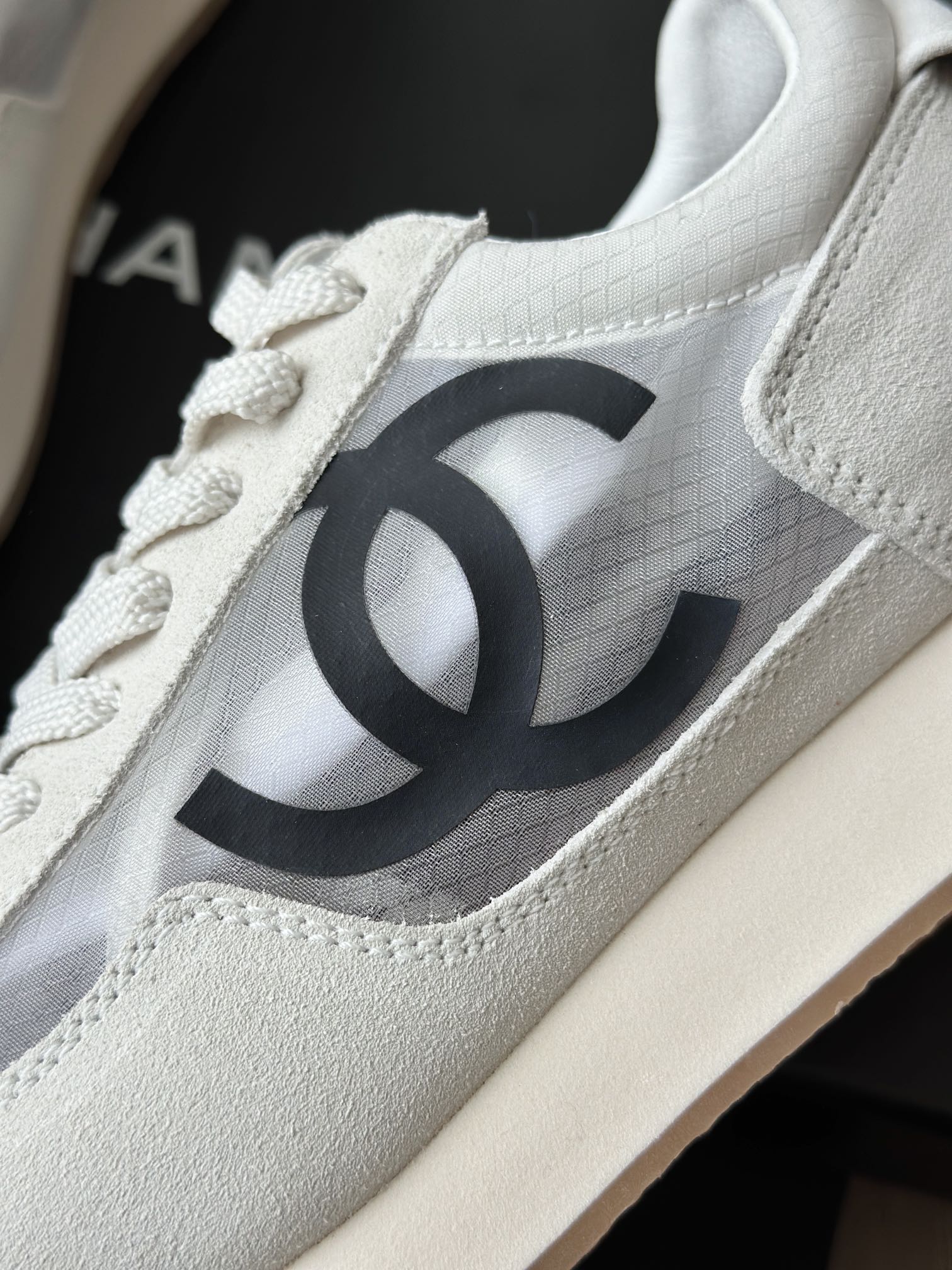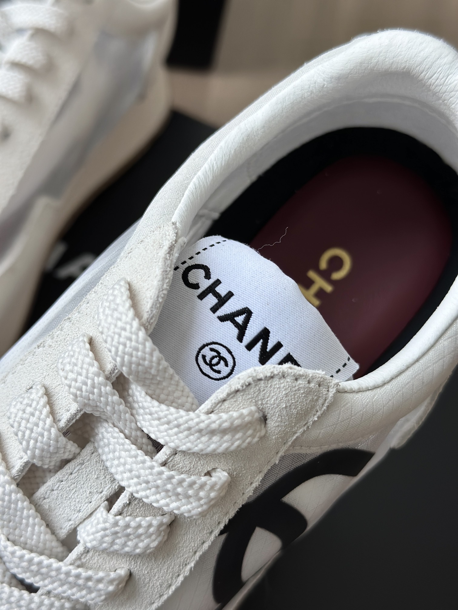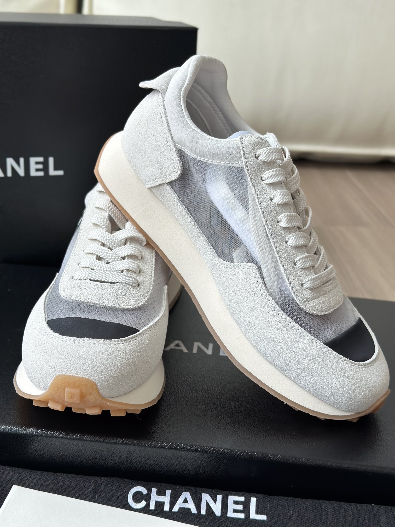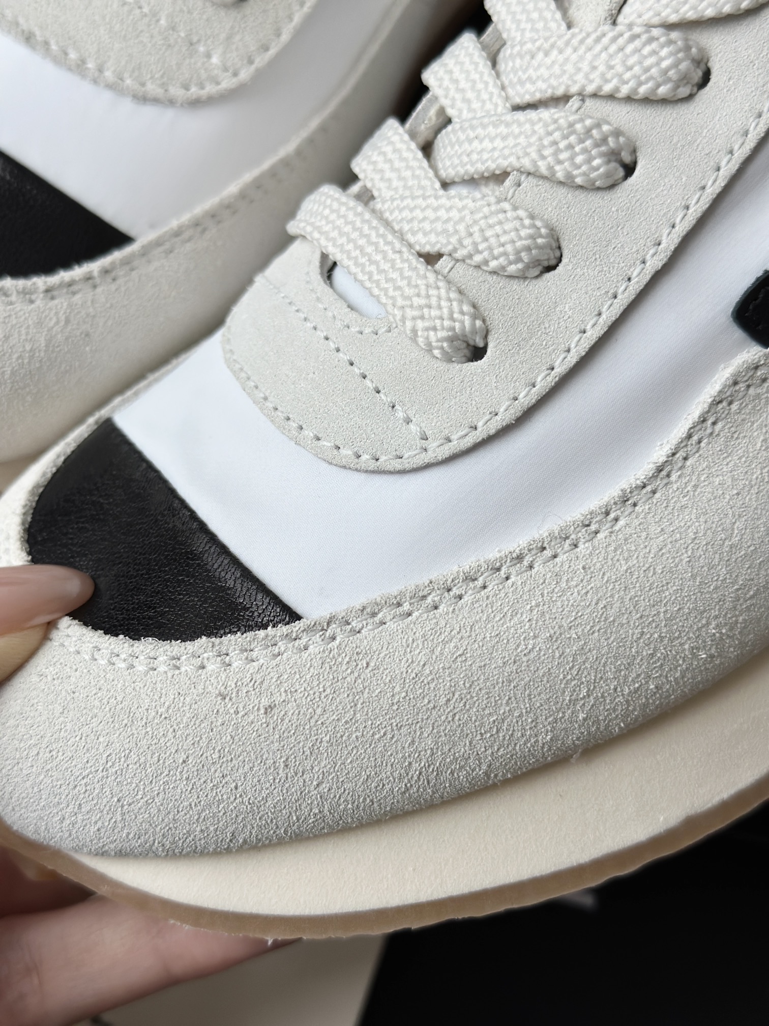 26P|休闲运动鞋 米白阿甘鞋|春日氛围感天花板✨ ▪️ 配色绝了:经典米白拼接网纱,搭配低调的黑色双C Logo,温柔又显贵,自带柔光滤镜,怎么搭都不出错✨ ▪️ 细节拉满:麂皮绒鞋面质感超棒,网面设计透气不闷脚,春夏穿再合适不过!鞋型超秀气,显脚小的同时还很修饰脚型,宽脚姐妹也能闭眼冲👍 舒适度&小心机双在线 ▪️ 厚底增高buff:4cm左右的厚底设计,悄悄拉长腿部线条,小个子姐妹直接拿捏黄金比例👯♀️ ▪️ 暴走不累:乳胶鞋垫+柔软内里,上脚就是“踩屎感”般的舒适,通勤逛街暴走2万步都毫无压力,打工人狂喜!😌 💃 万能穿搭公式 ▪️ 通勤风:搭配西装直筒裤,利落又专业,下班直接去约会无压力 ▪️ 休闲风:牛仔裤+针织衫,松弛感拉满,妥妥的法式富家既视感 ▪️ 甜妹风:碎花连衣裙/百褶裙,温柔又灵动,春日出街回头率拉满。 • 鞋面:采用织物(网眼/尼龙类面料) 鞋侧及后跟:拼接了麂皮效果小牛皮 • 内里:为小羊皮, • 大底:采用橡胶材质,部分款式加入PU缓震层 码数35---40