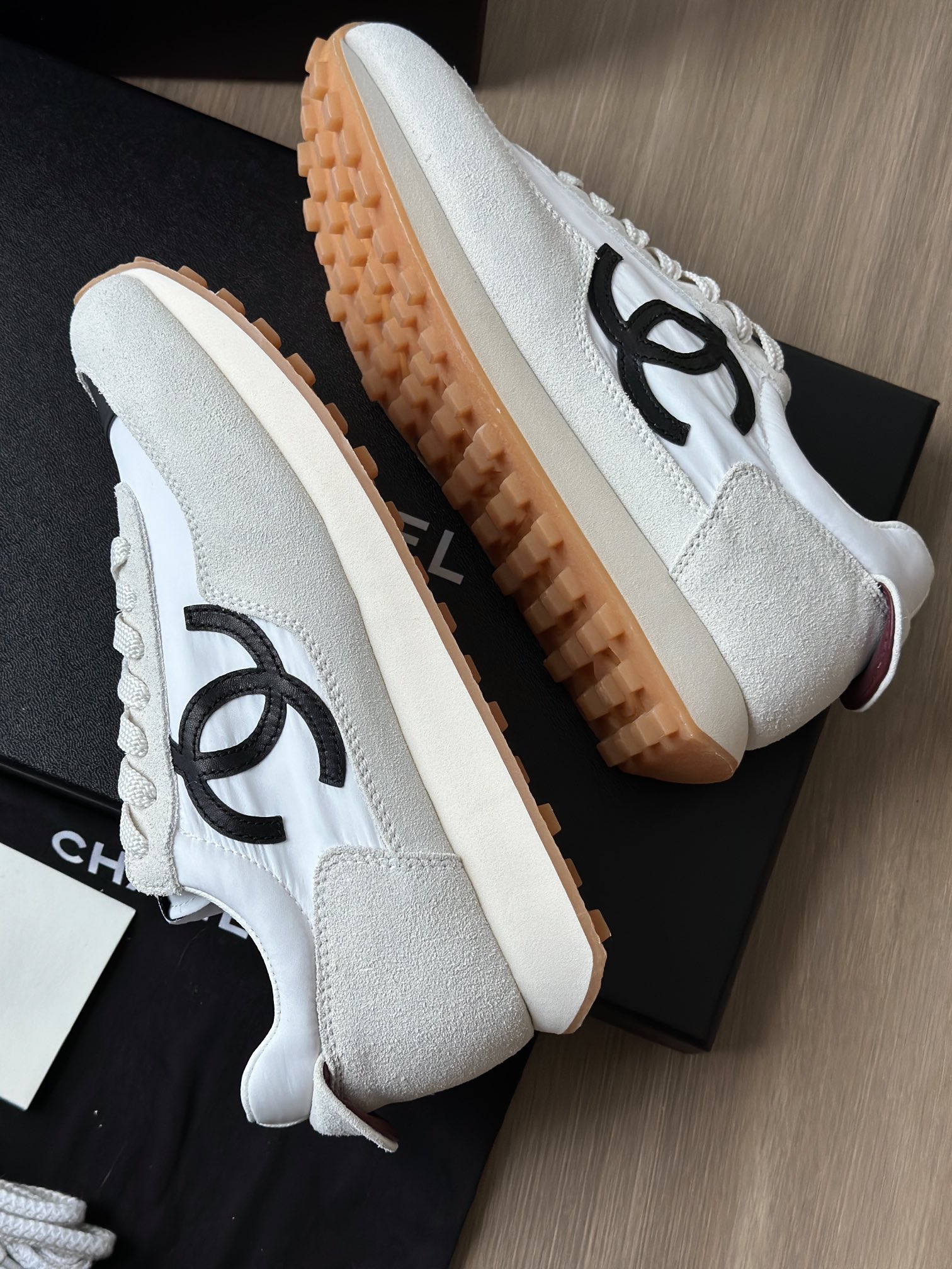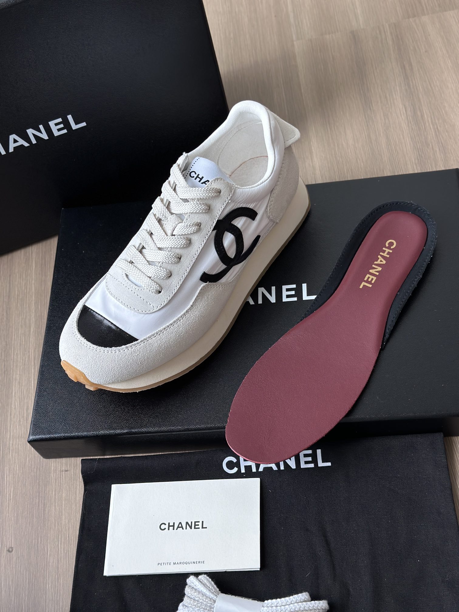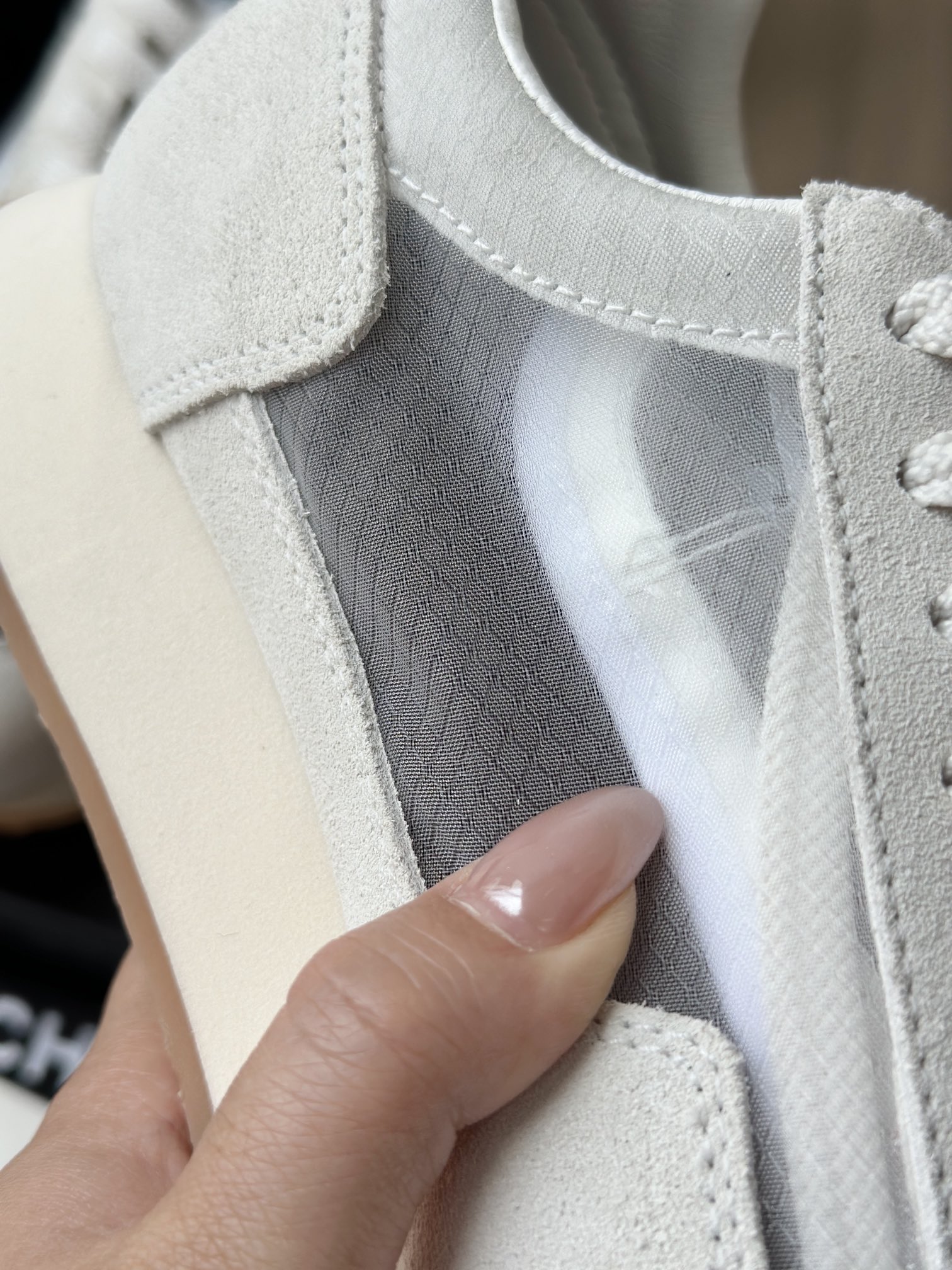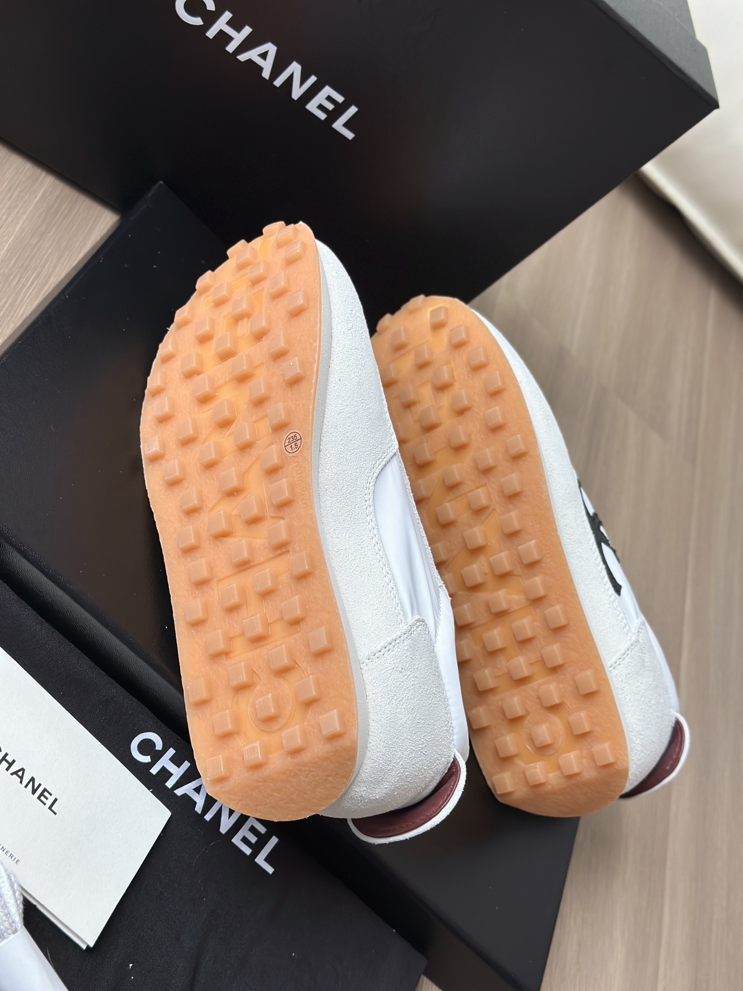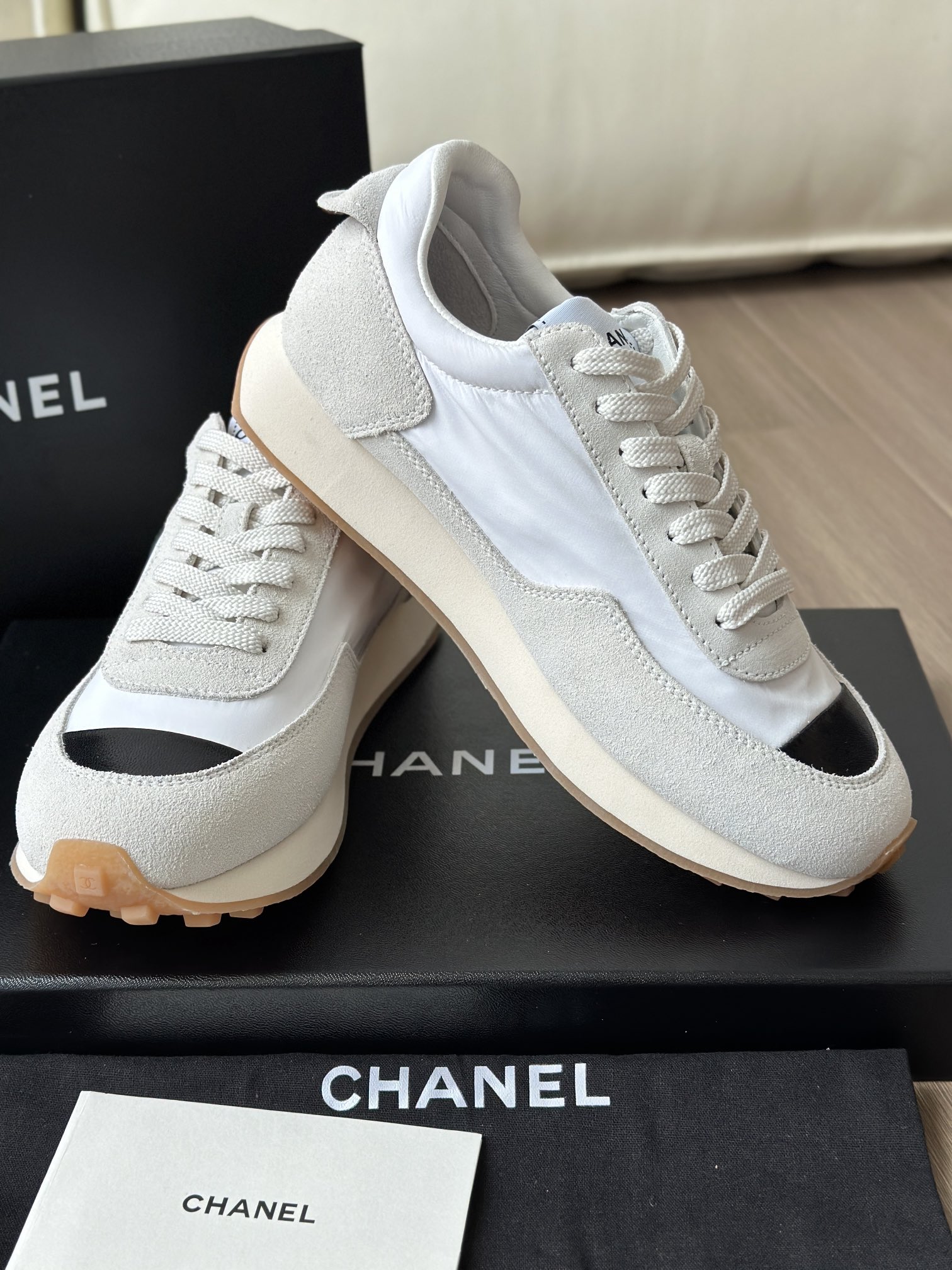 26P|休闲运动鞋 米白阿甘鞋|春日氛围感天花板✨ ▪️ 配色绝了:经典米白拼接网纱,搭配低调的黑色双C Logo,温柔又显贵,自带柔光滤镜,怎么搭都不出错✨ ▪️ 细节拉满:麂皮绒鞋面质感超棒,网面设计透气不闷脚,春夏穿再合适不过!鞋型超秀气,显脚小的同时还很修饰脚型,宽脚姐妹也能闭眼冲👍 舒适度&小心机双在线 ▪️ 厚底增高buff:4cm左右的厚底设计,悄悄拉长腿部线条,小个子姐妹直接拿捏黄金比例👯♀️ ▪️ 暴走不累:乳胶鞋垫+柔软内里,上脚就是“踩屎感”般的舒适,通勤逛街暴走2万步都毫无压力,打工人狂喜!😌 💃 万能穿搭公式 ▪️ 通勤风:搭配西装直筒裤,利落又专业,下班直接去约会无压力 ▪️ 休闲风:牛仔裤+针织衫,松弛感拉满,妥妥的法式富家既视感 ▪️ 甜妹风:碎花连衣裙/百褶裙,温柔又灵动,春日出街回头率拉满。 • 鞋面:采用织物(网眼/尼龙类面料) 鞋侧及后跟:拼接了麂皮效果小牛皮 • 内里:为小羊皮, • 大底:采用橡胶材质,部分款式加入PU缓震层 码数35---40