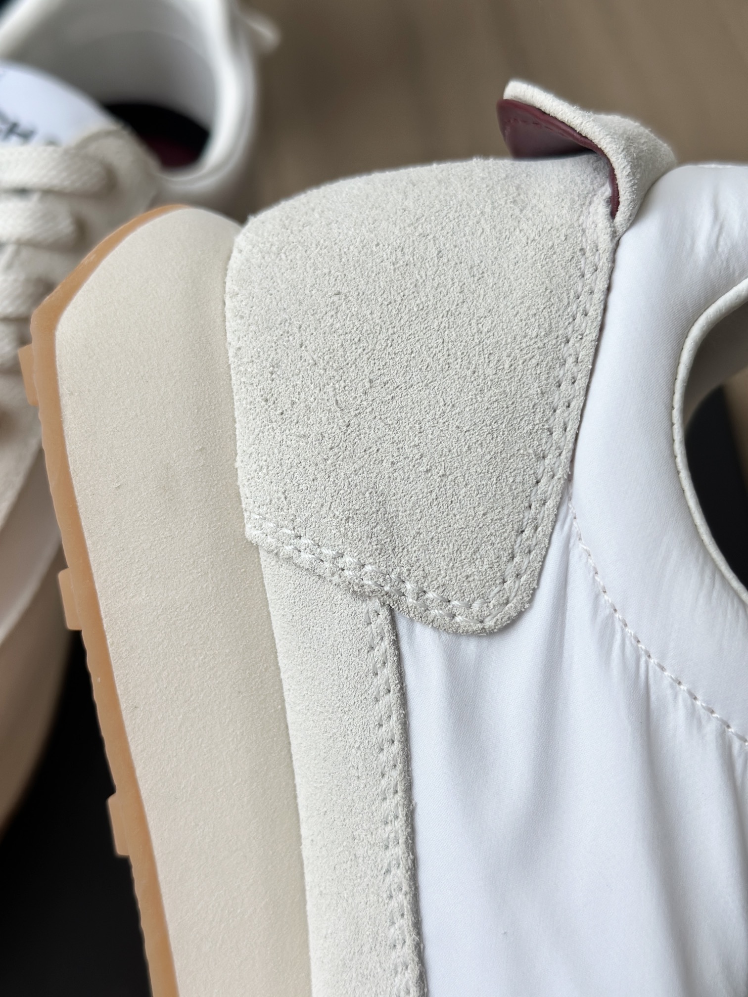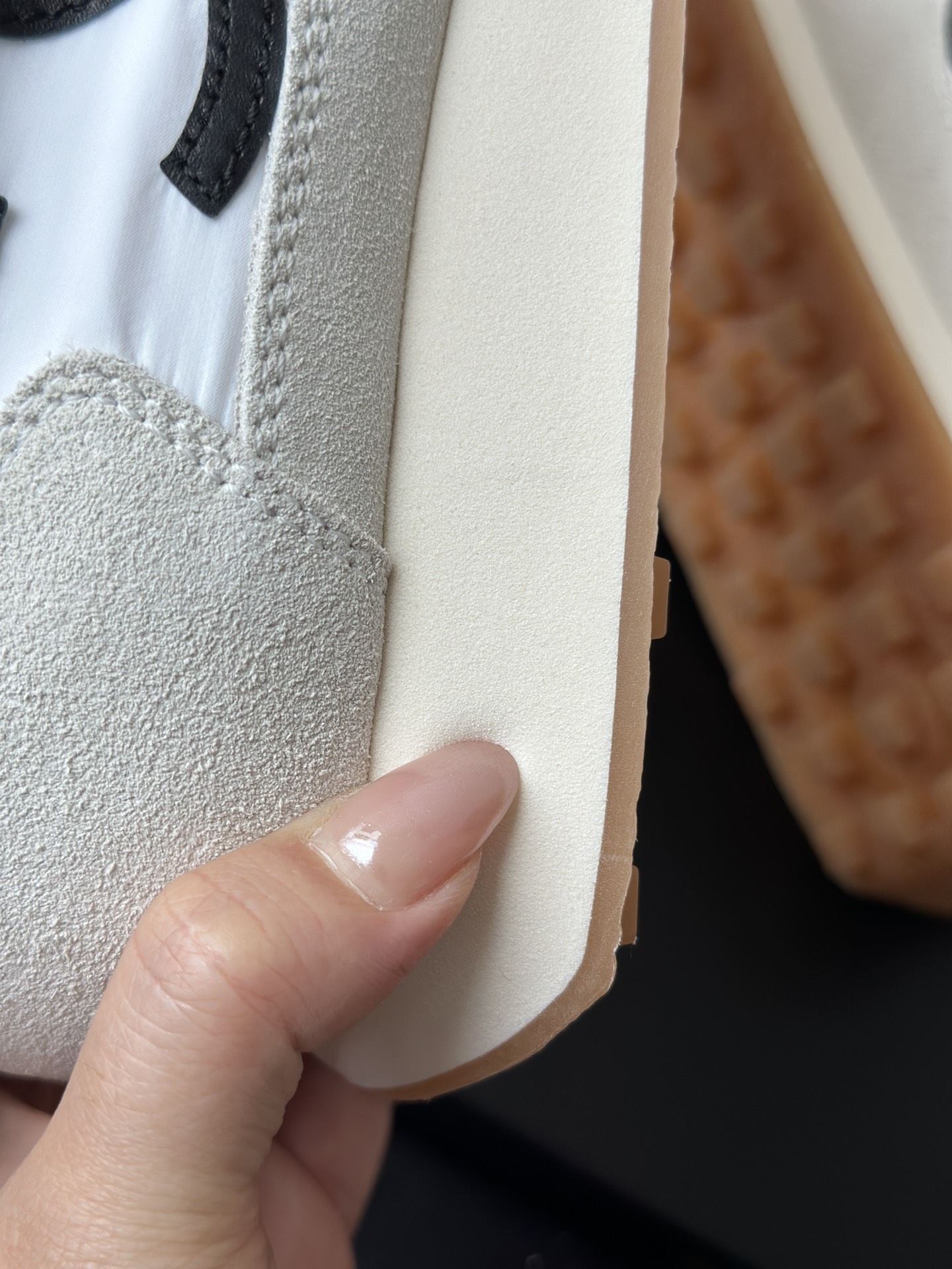 鞋面是麂皮绒+尼龙科技布拼接而成! 各种面料的拼接传承了香家运动鞋的经典~ 繁琐的拼接走线 呈现出出色的层感! 并不会特别单调
