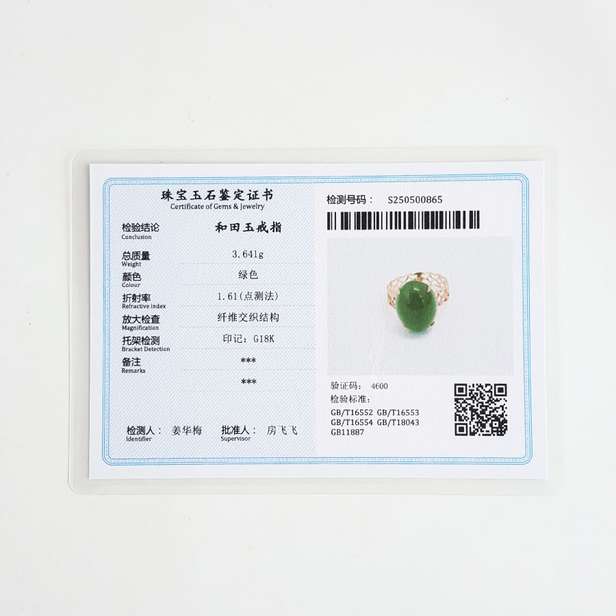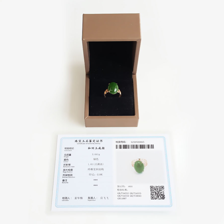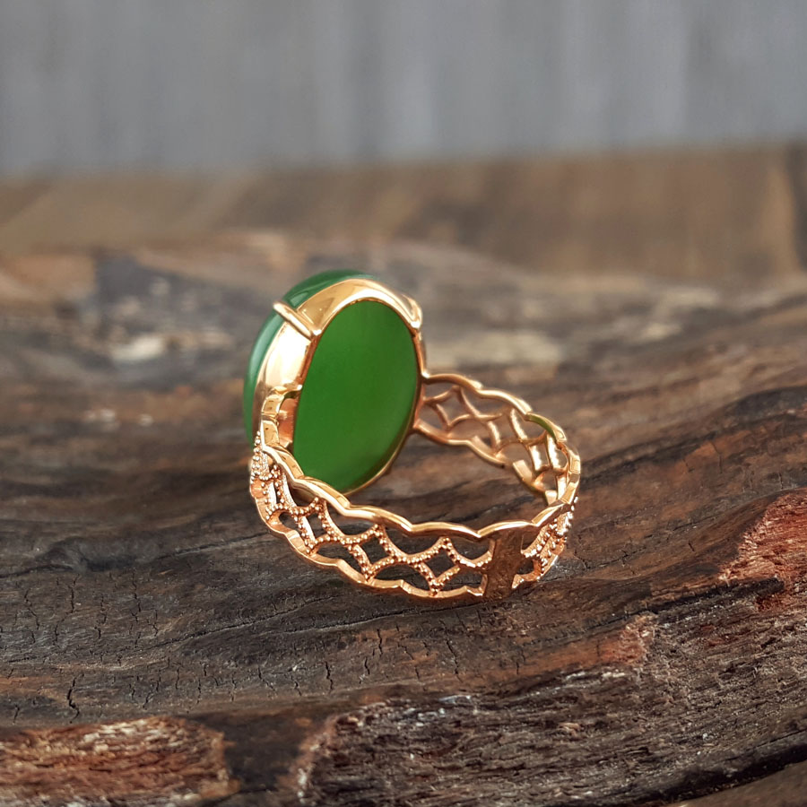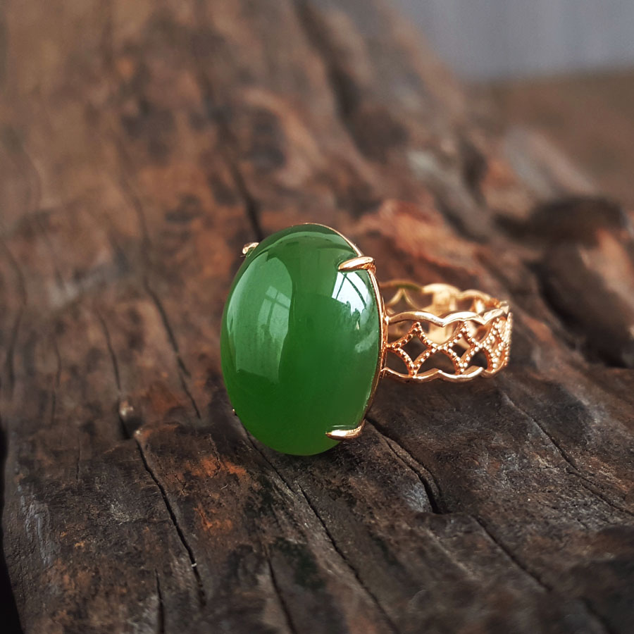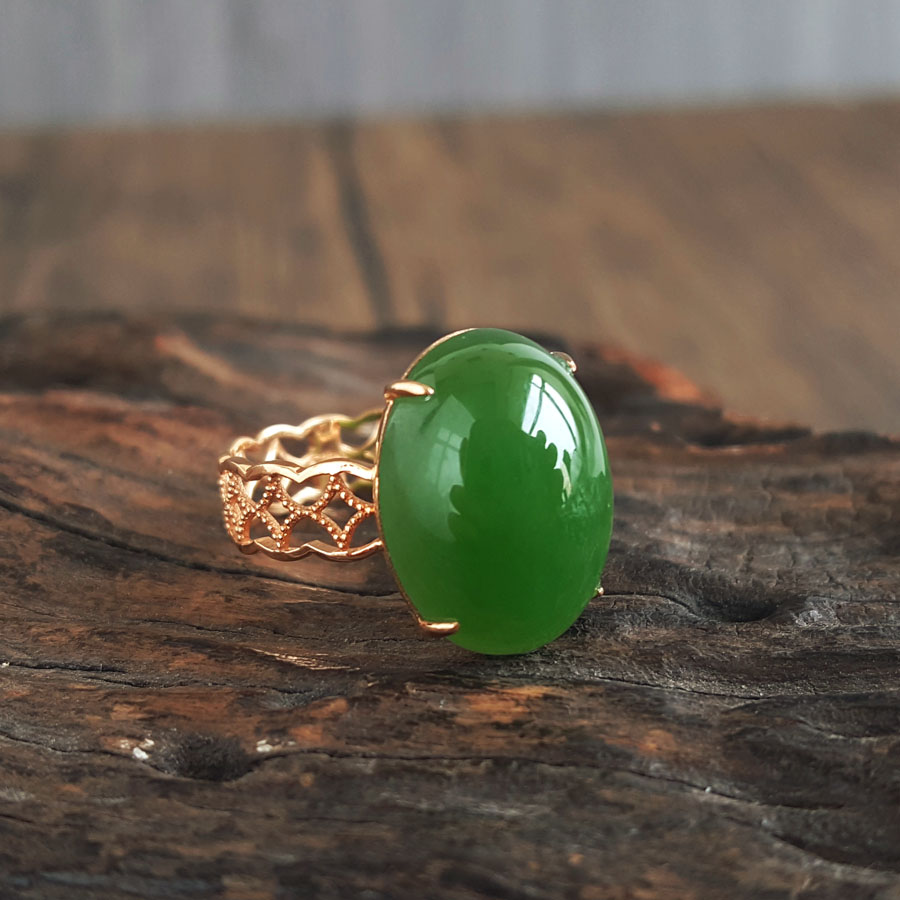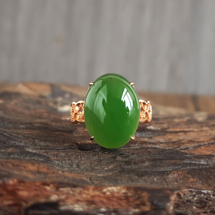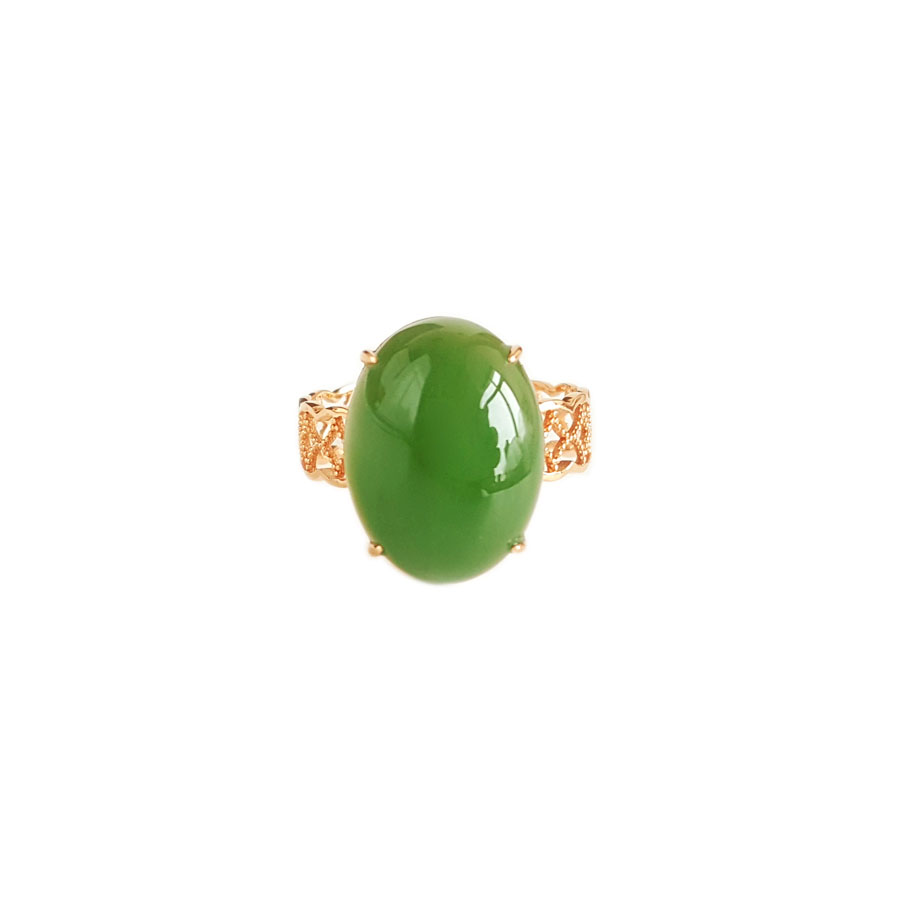 名称 | AU750玫瑰金镶天然菠菜绿无黑点蛋面和田玉碧玉戒指 |