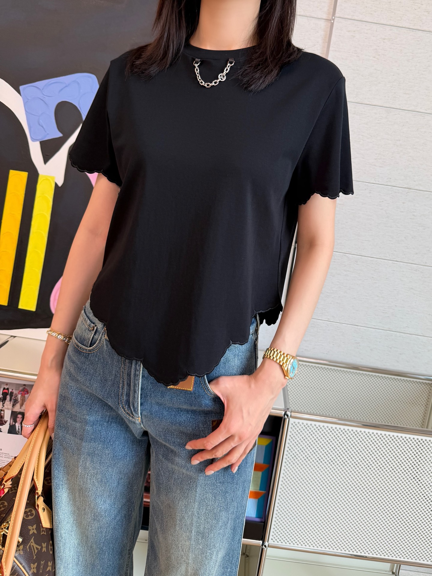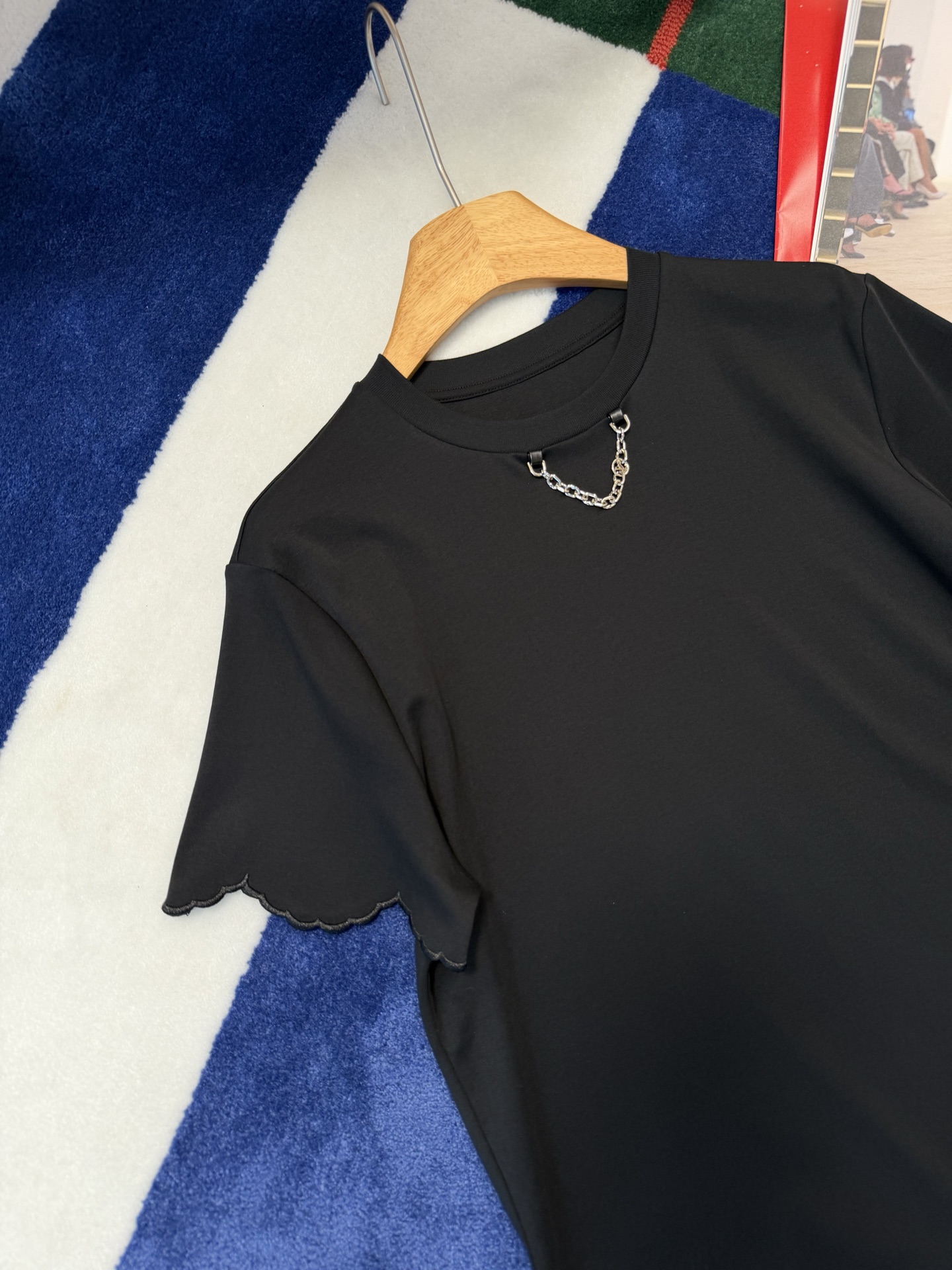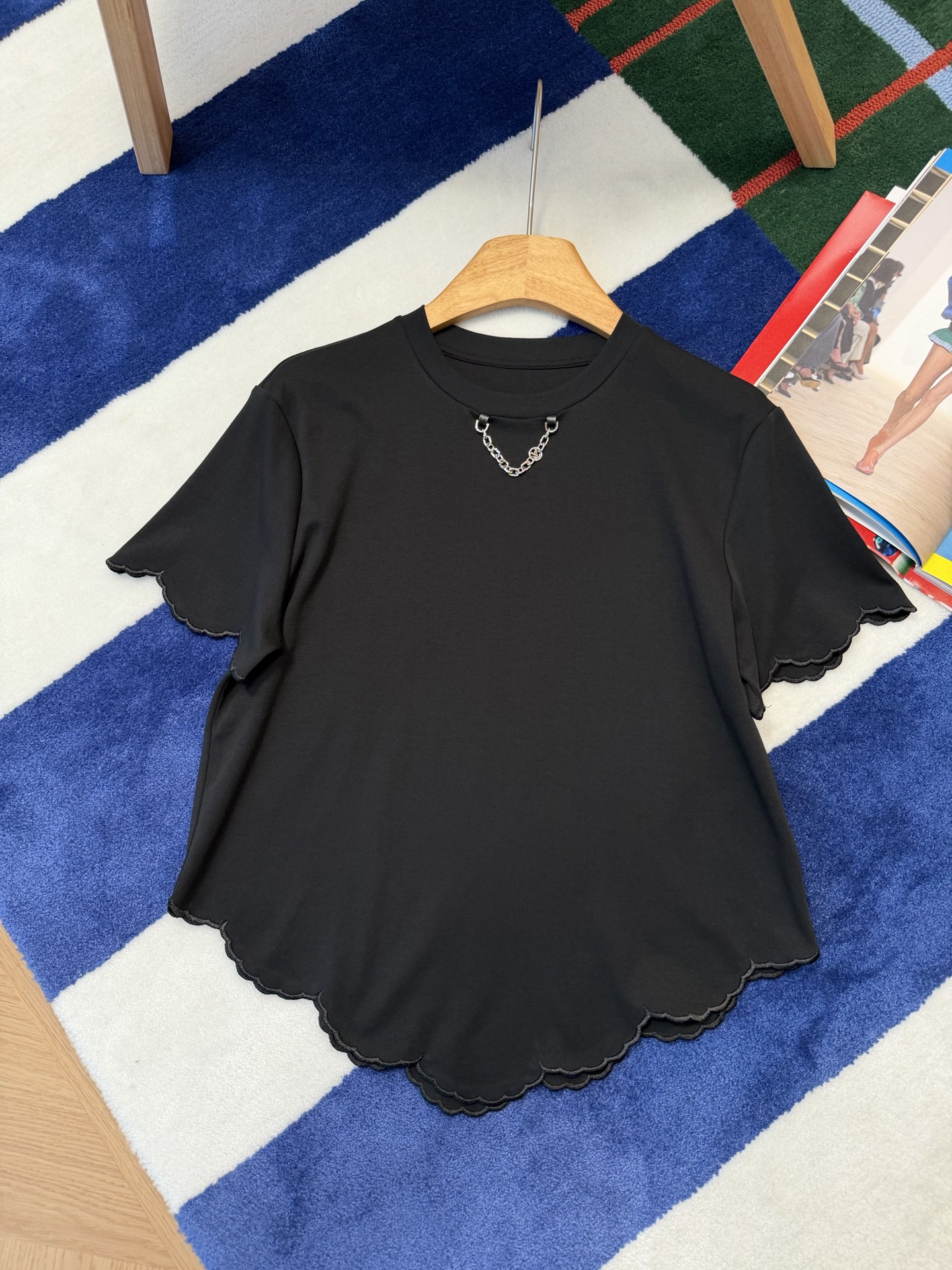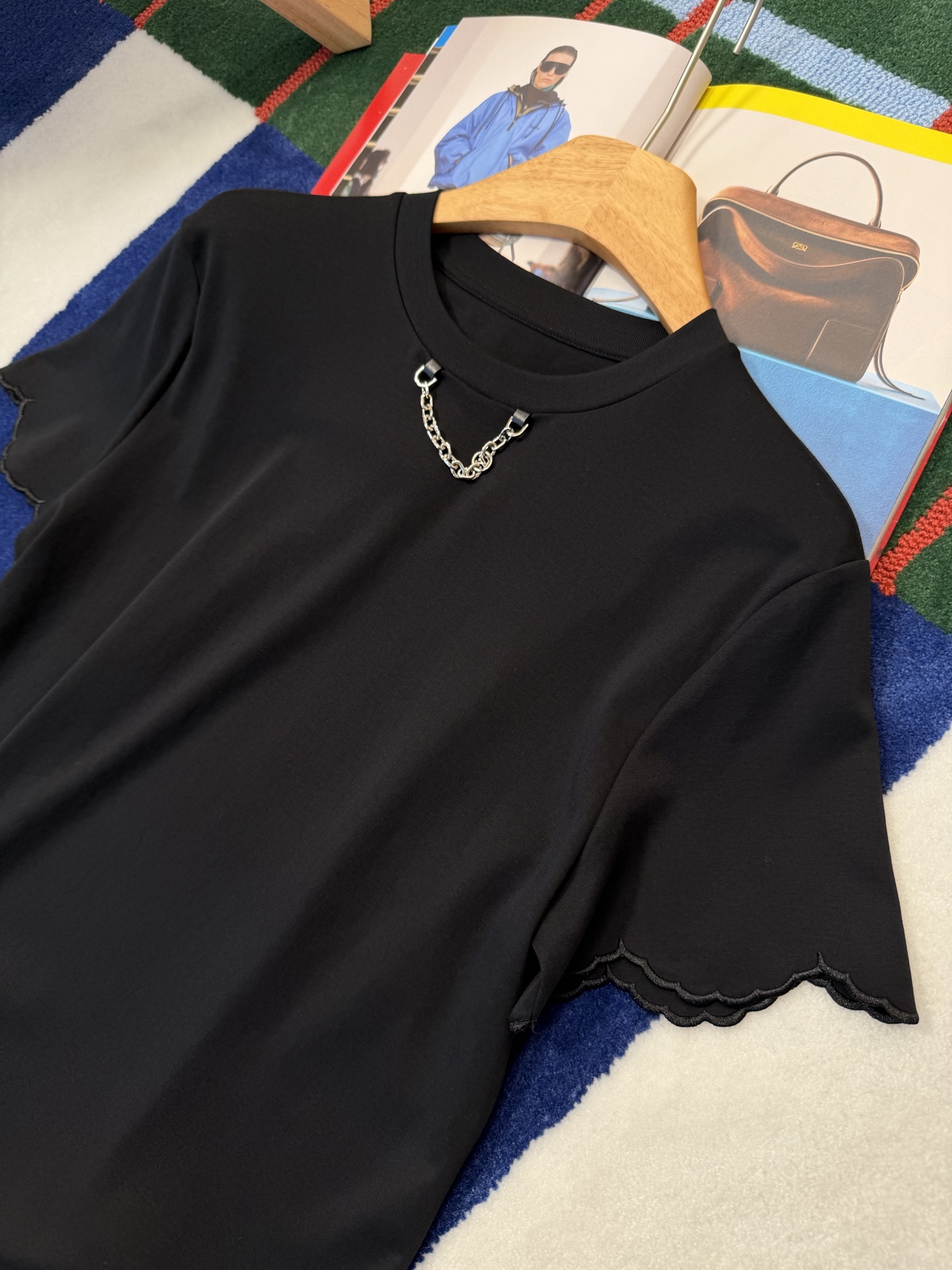 【新款现货发售】2026春夏最新款🆕软糯垂顺的高定面料🥰上身亲肤又透气,下摆的波浪边剪裁自带柔焦感,悄悄藏住小肚腩还超显比例‼️领口的金属链设计更是点睛之笔,告别单调,把基础款穿出了精致松弛感🉑