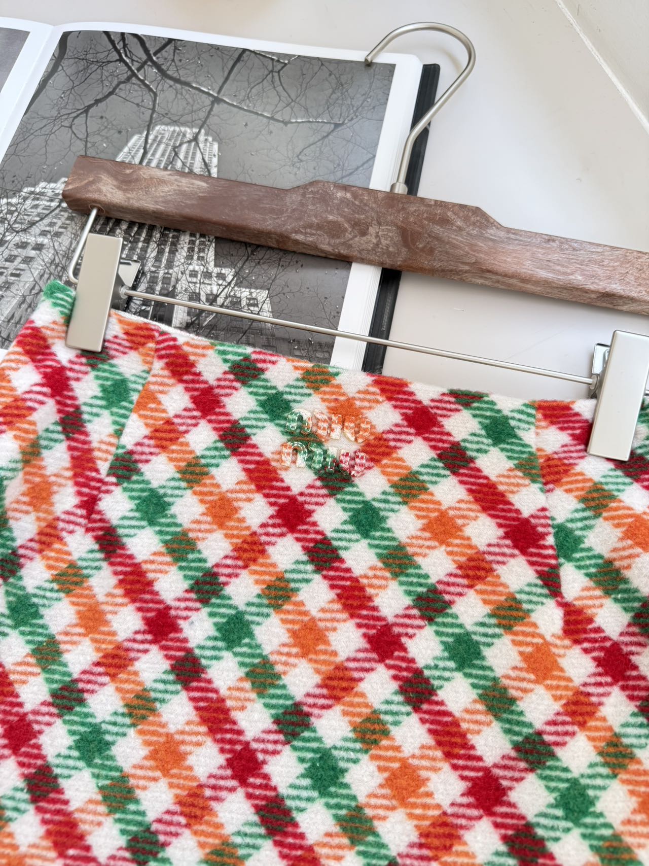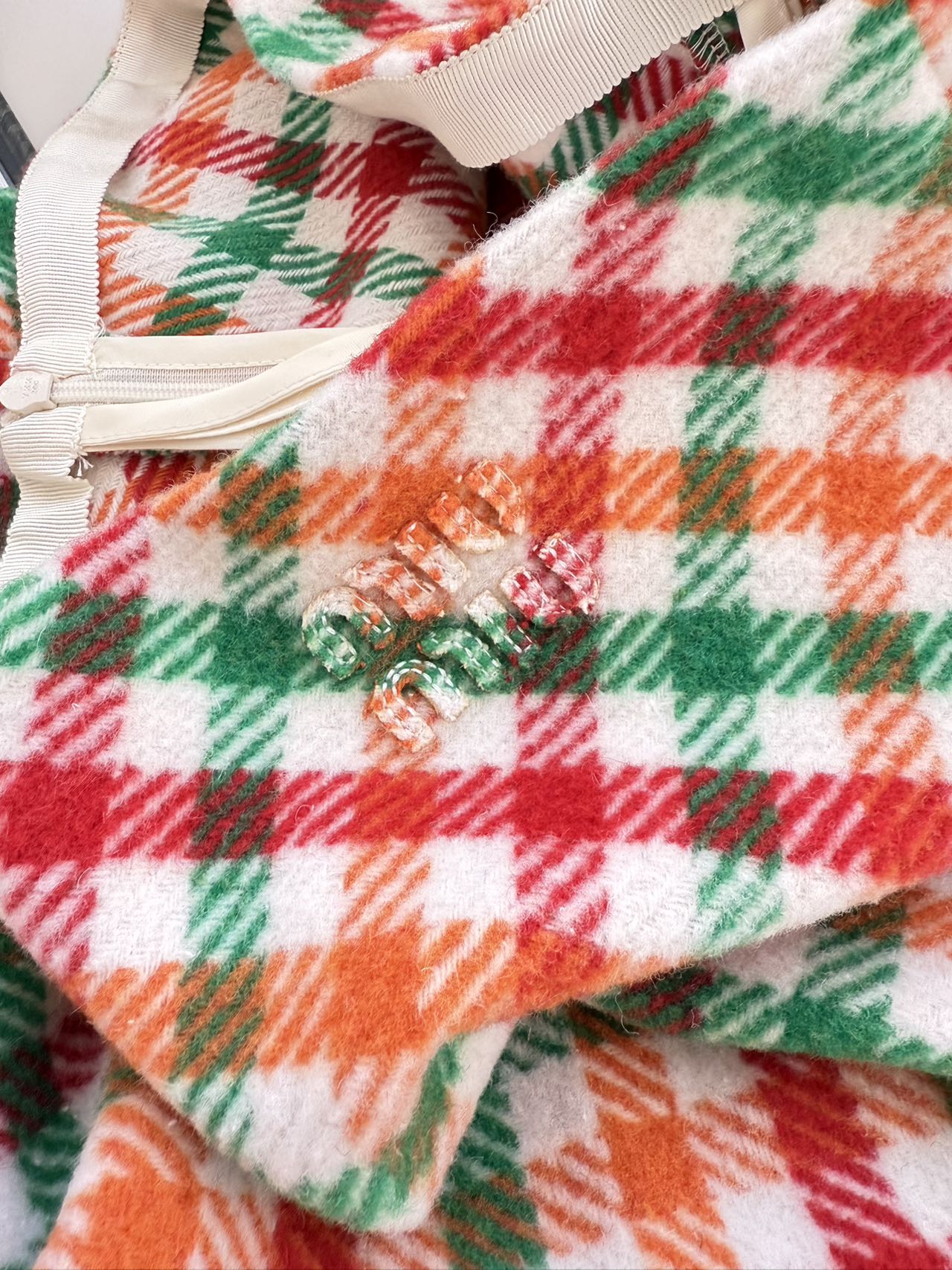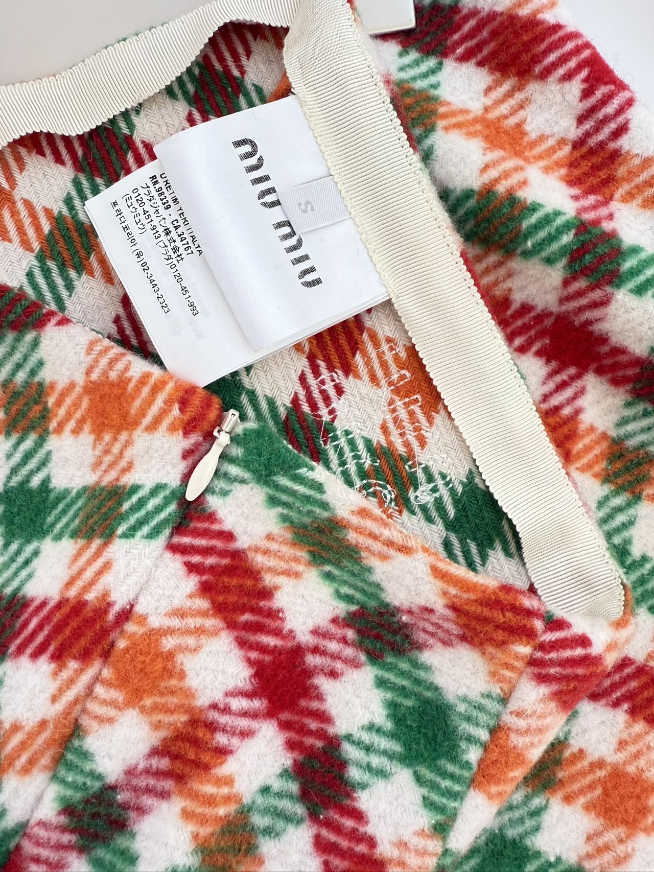 侧拉链设计:定制Miu Miu哑光金属拉链,隐藏式侧缝布局,拉合后不破坏格纹整体美感;