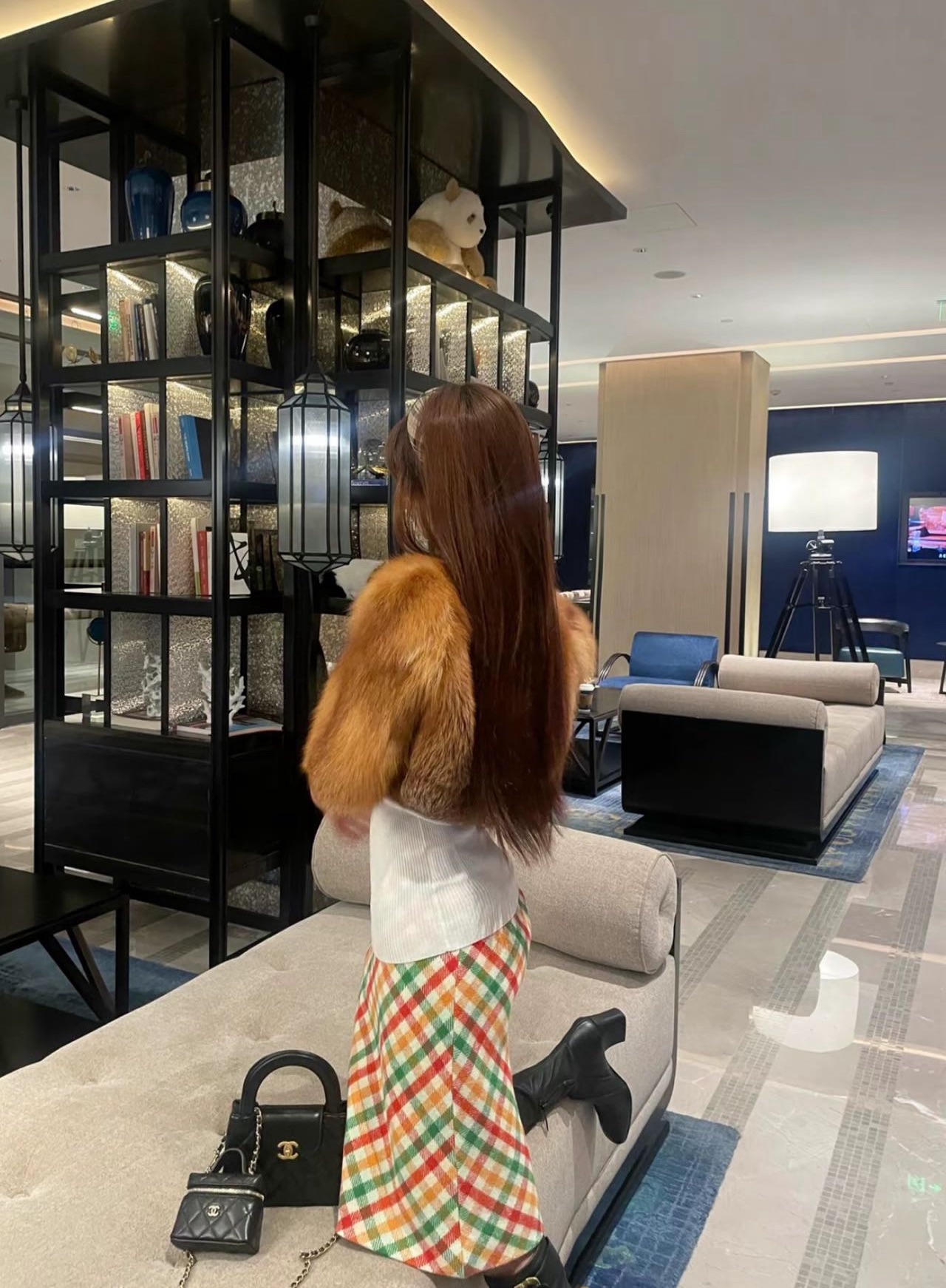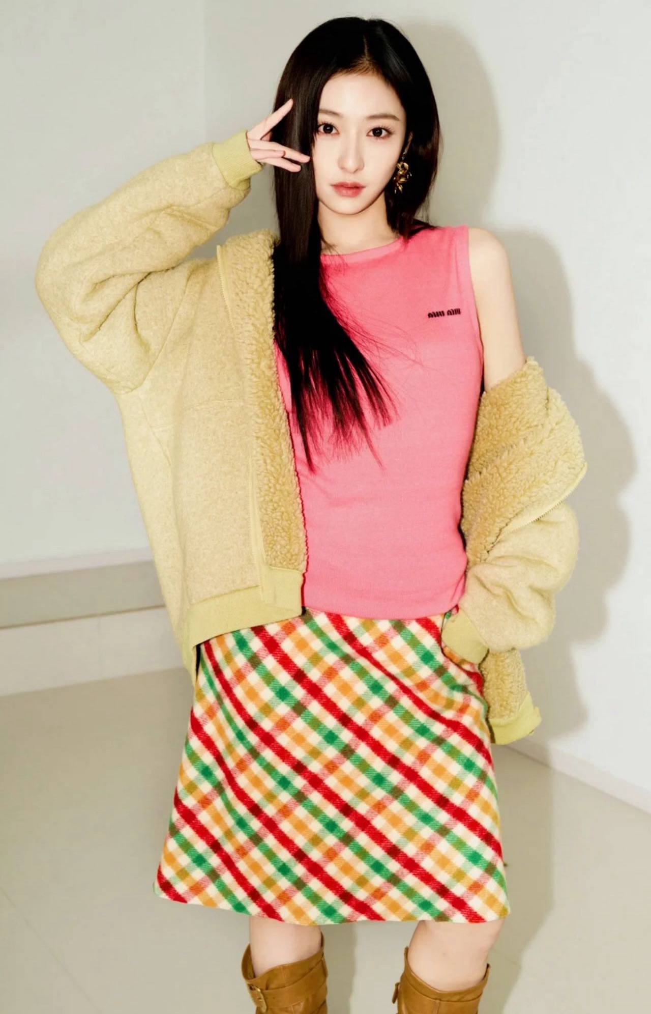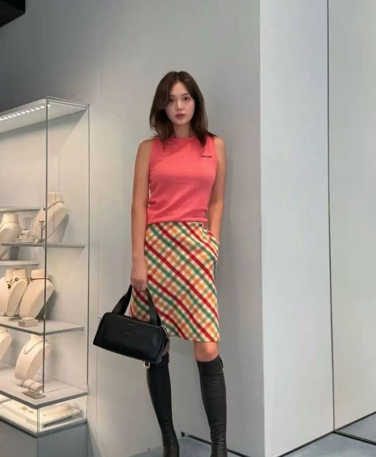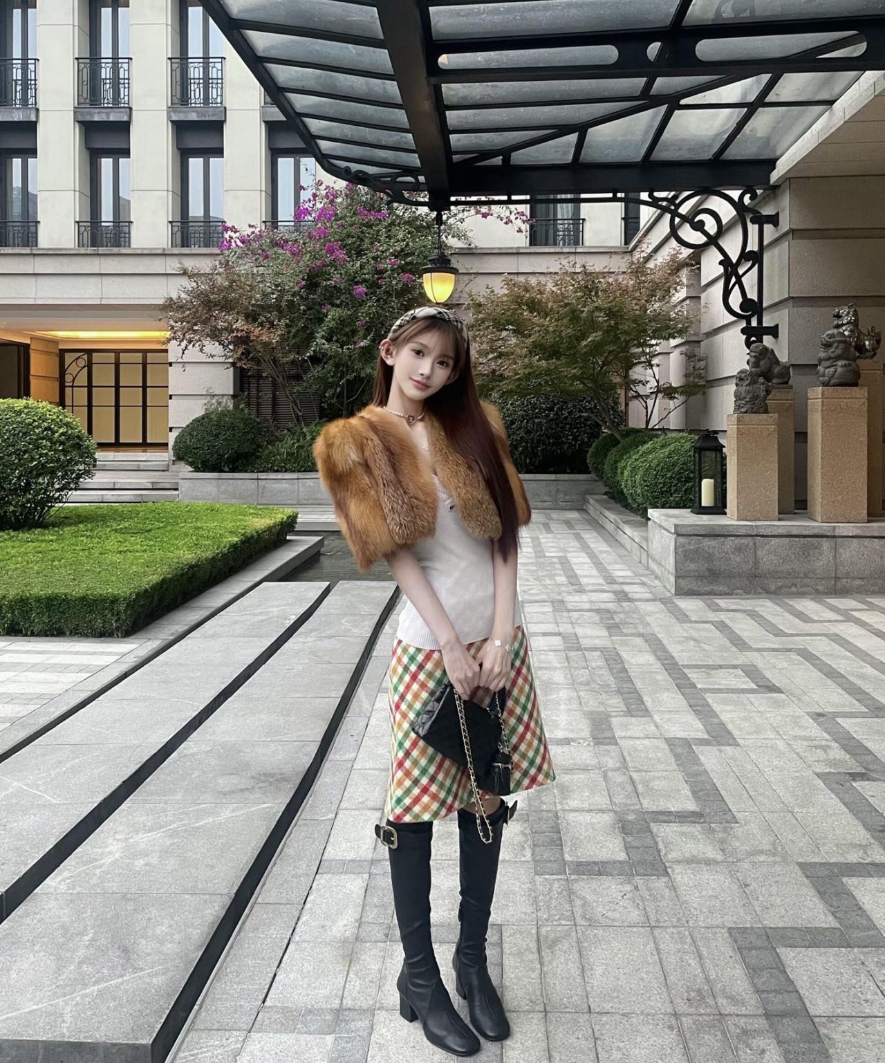 秋冬叠穿:外搭长款羊毛大衣,搭配过膝长靴,露出格纹短裙下摆,增加造型层次。