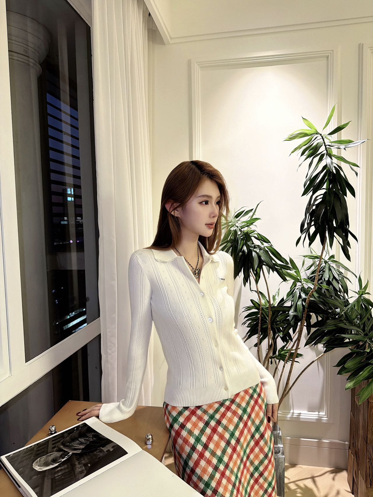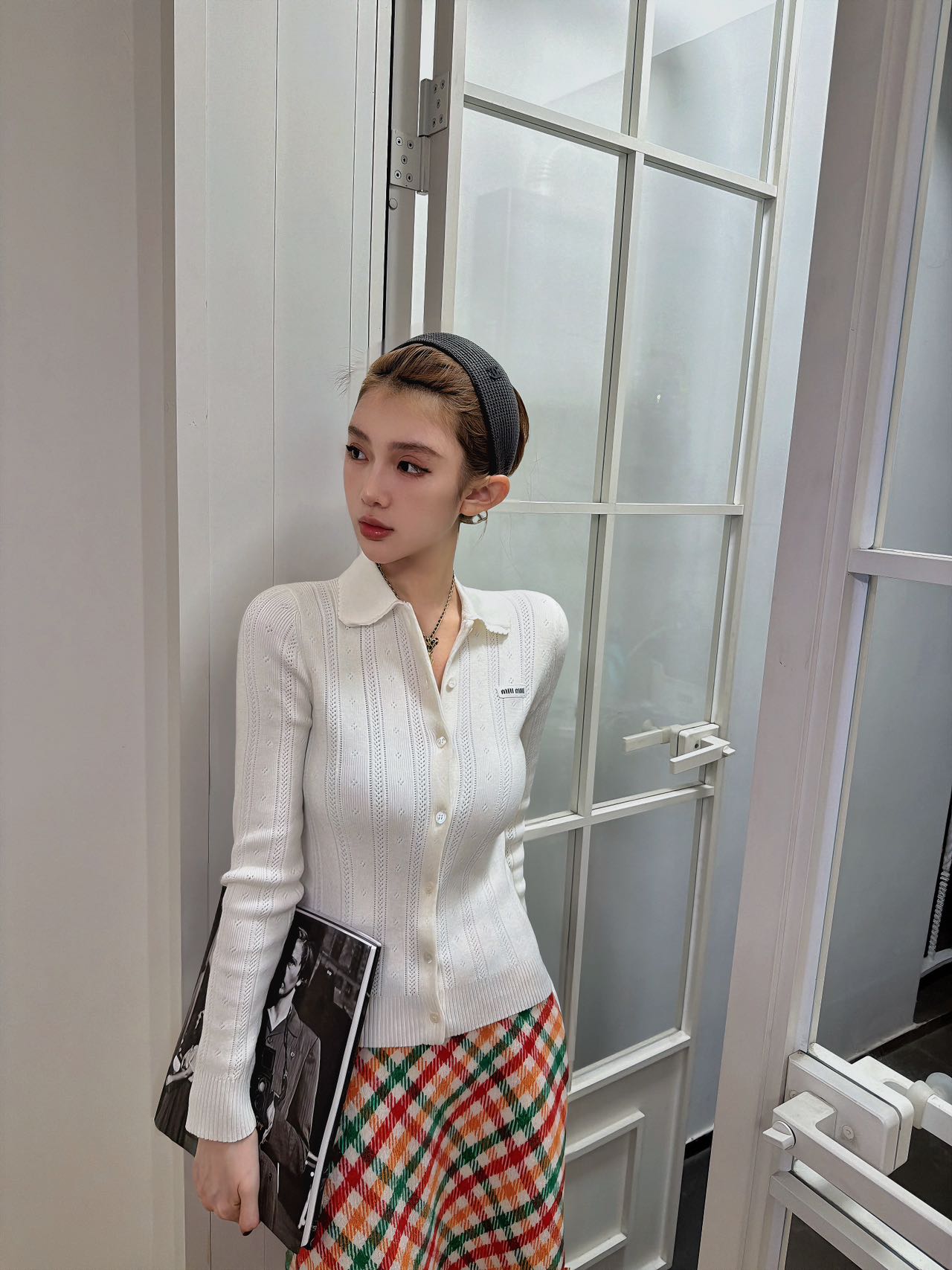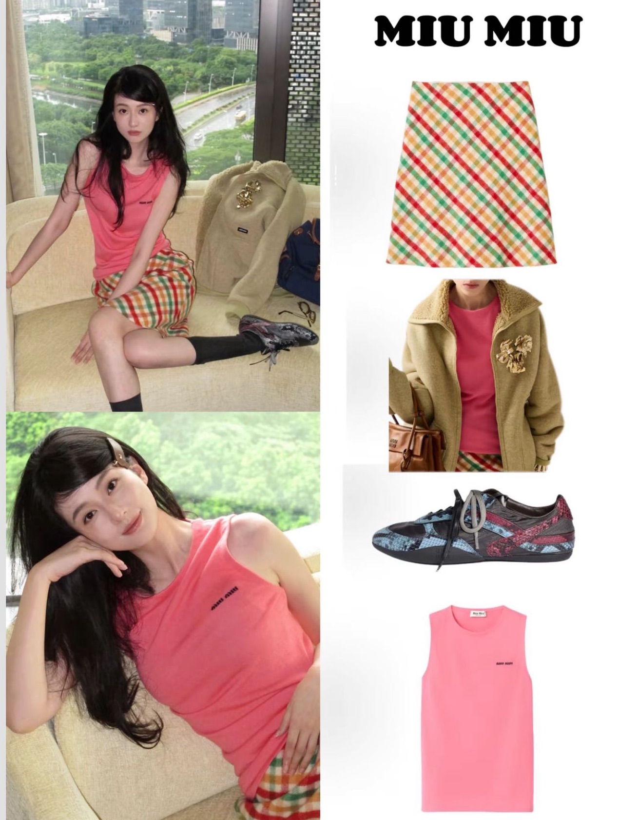 轻社交:搭配Miu Miu针织开衫+玛丽珍鞋,格纹配色呼应复古甜妹风;