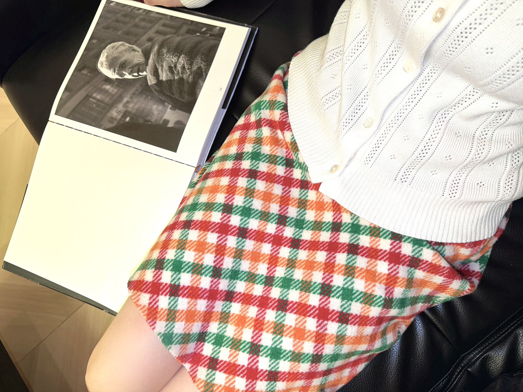 日常通勤:内搭白色羊绒打底衫+黑色短款皮衣,搭配这条格纹短裙,甜酷兼具;