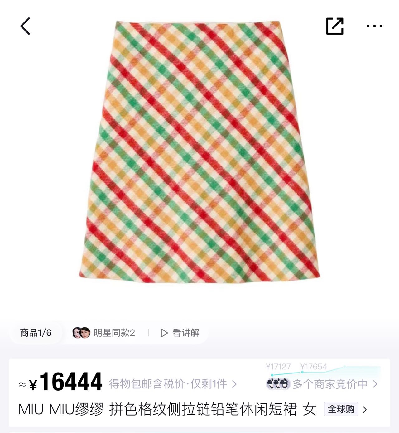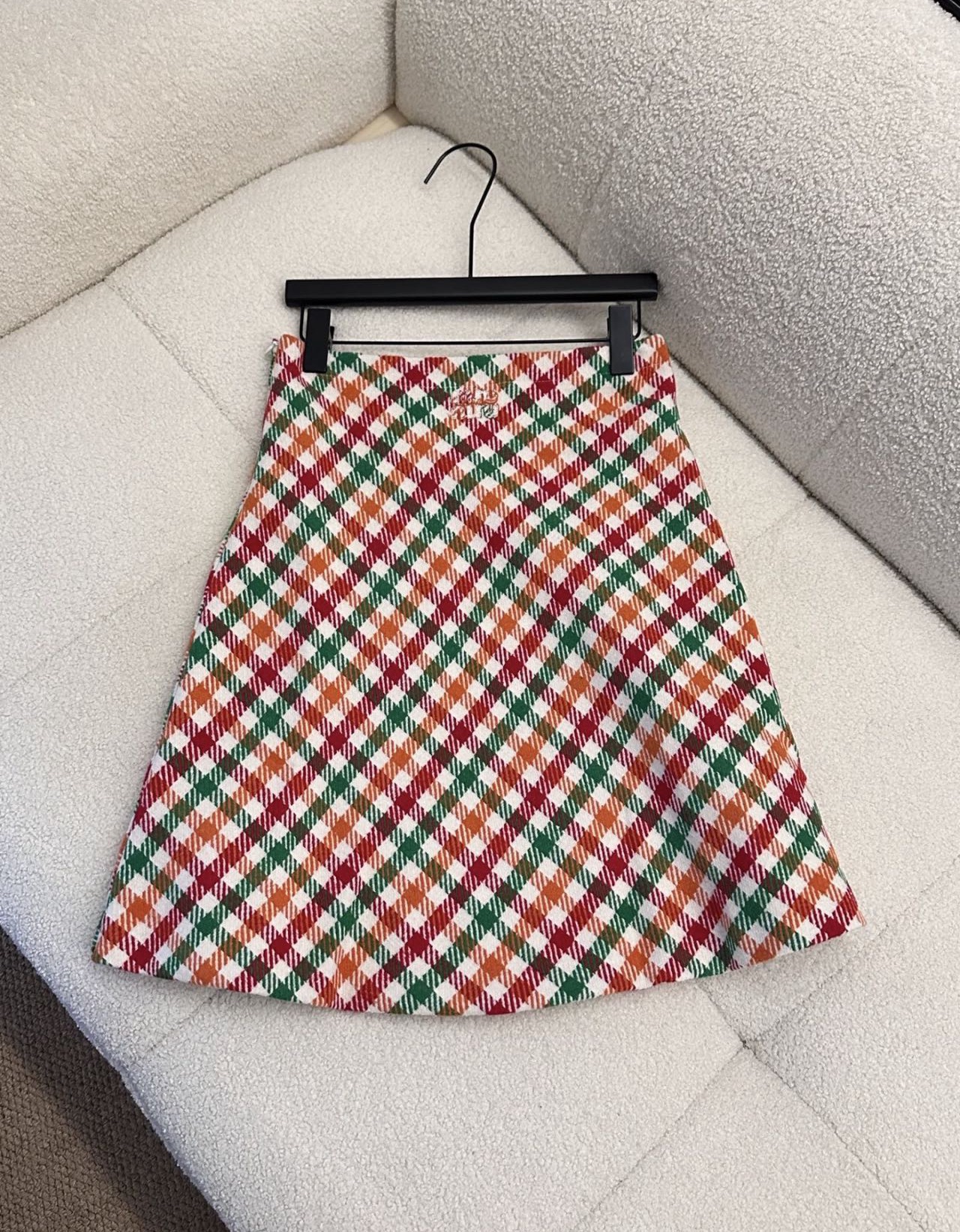 Miu Miu 2025秋冬系列拼色格纹侧拉链羊毛铅笔短裙(货号MG2558),为明星同款热门款。