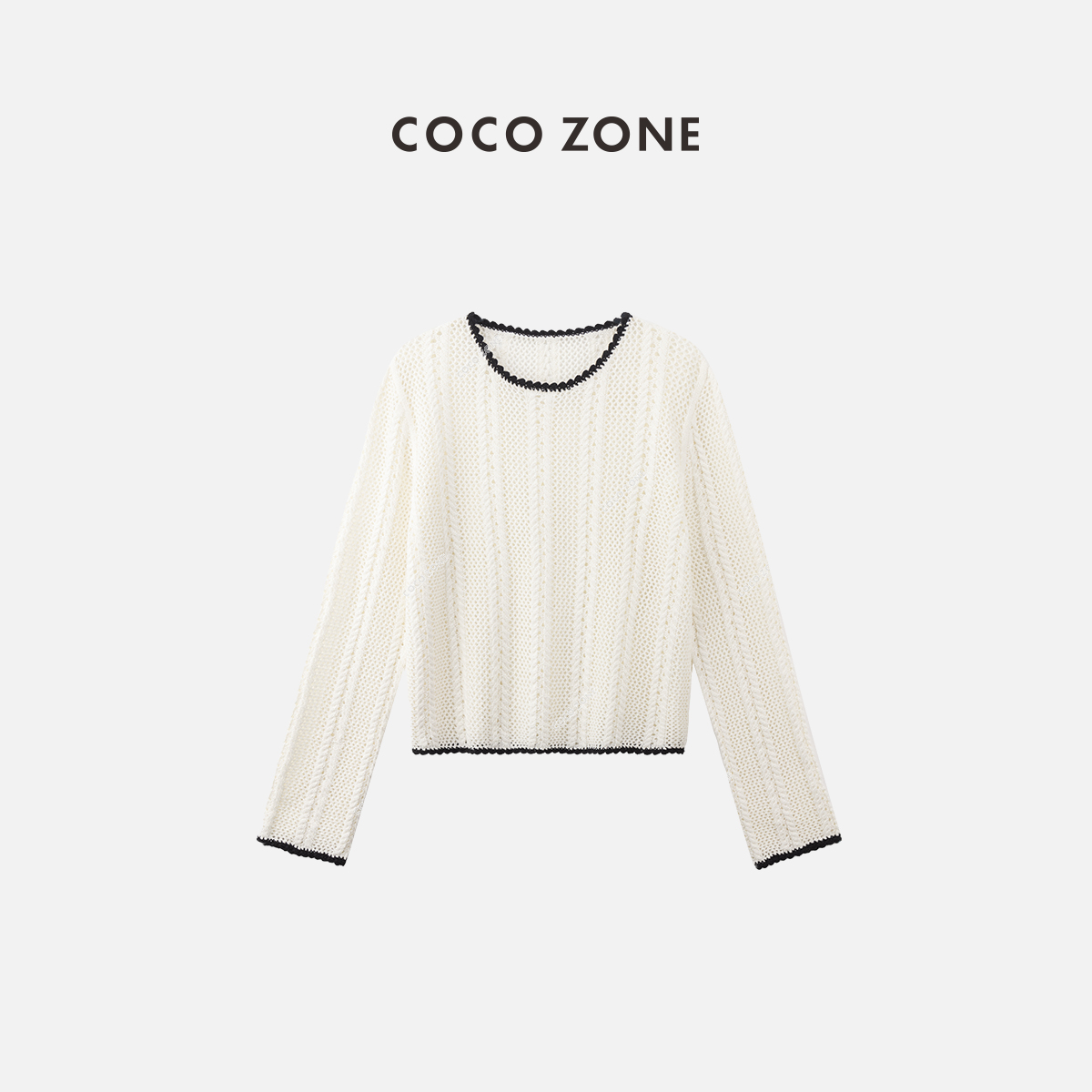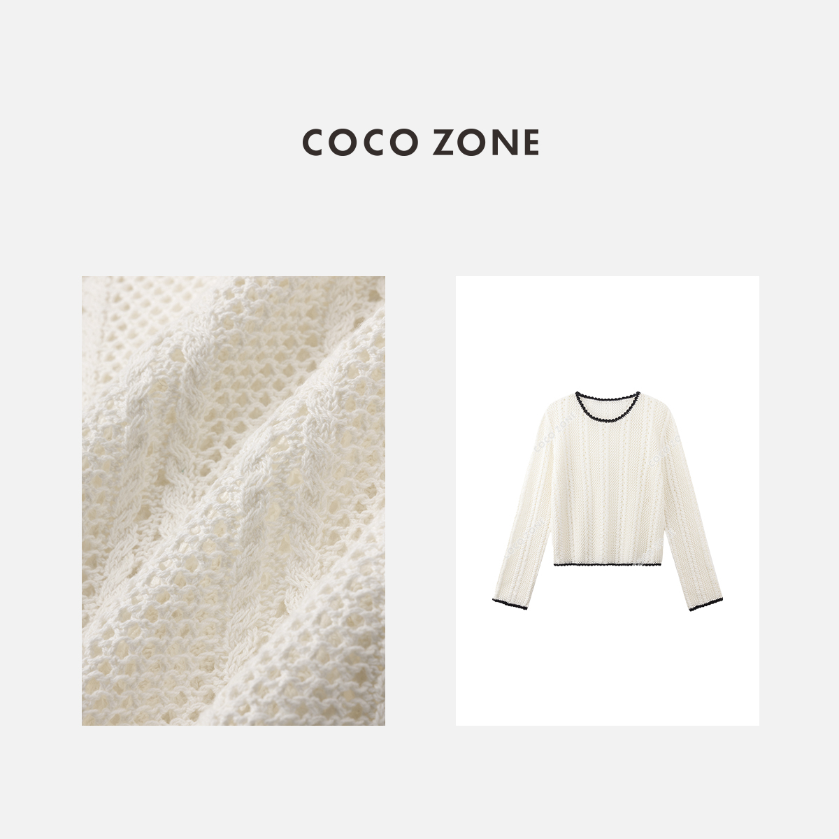 COCO ZONE 2024"米妮"春季复古纯色圆领针织衫镂空长袖上衣CC1A0605