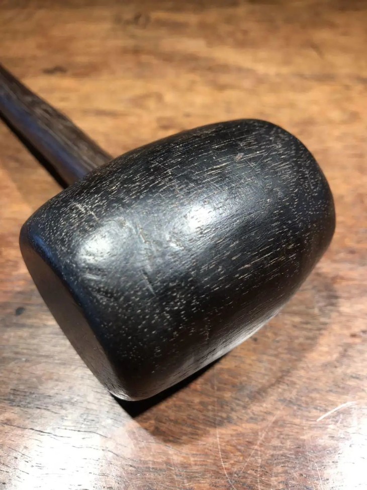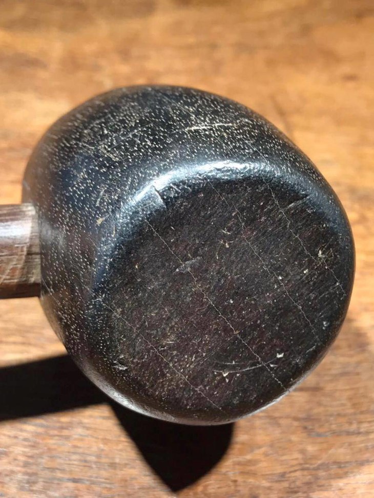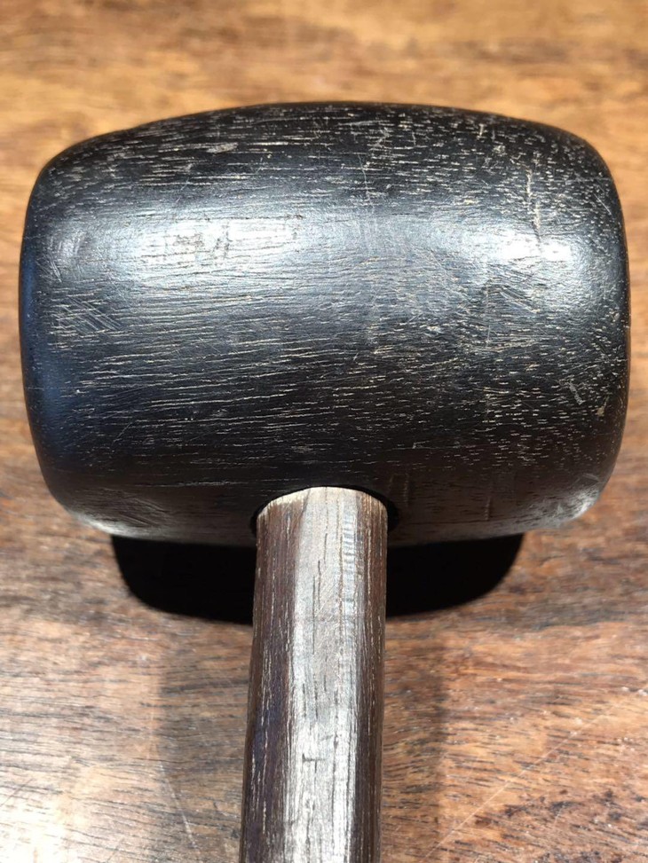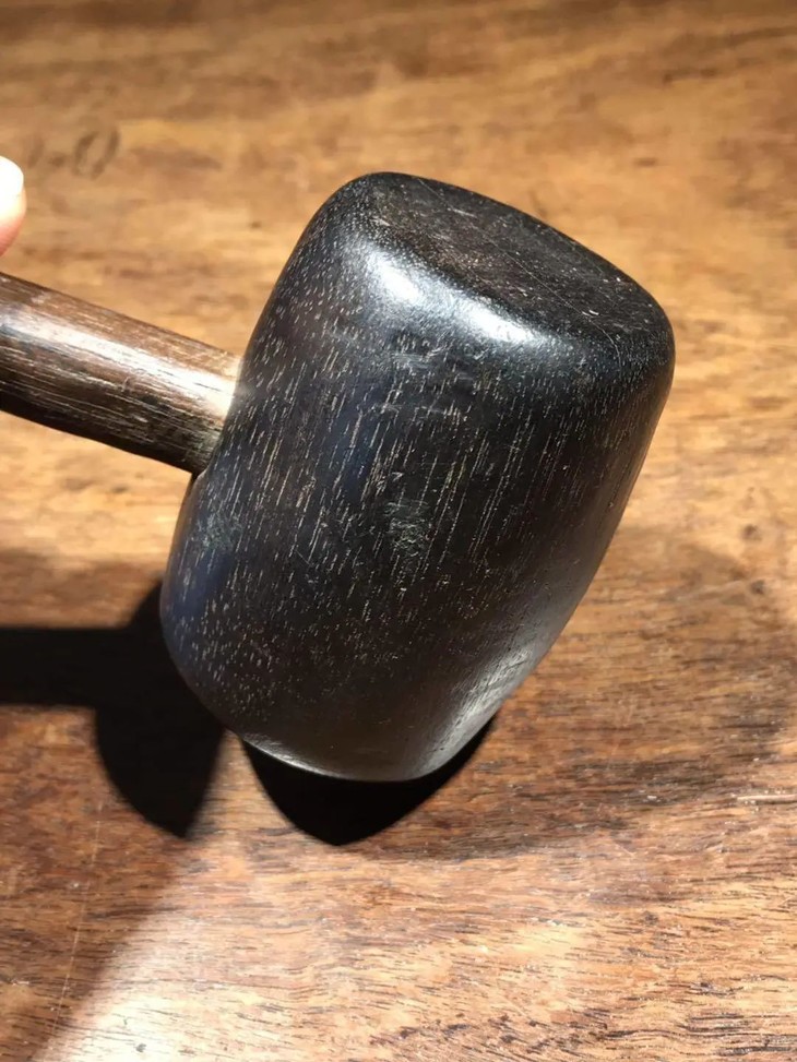 槌体以质地坚硬、色泽乌黑的檀木琢磨成圆鼓型,槌柄取材坚硬油润的酸枝或花梨木削磨成柄,器型比例恰当,規矩饱满,简约大气,经历逾百年之历史,木头皮壳圆润,包浆厚重,入手置于案头美观典雅,或可实用为坚果槌或养生捶背之利器。