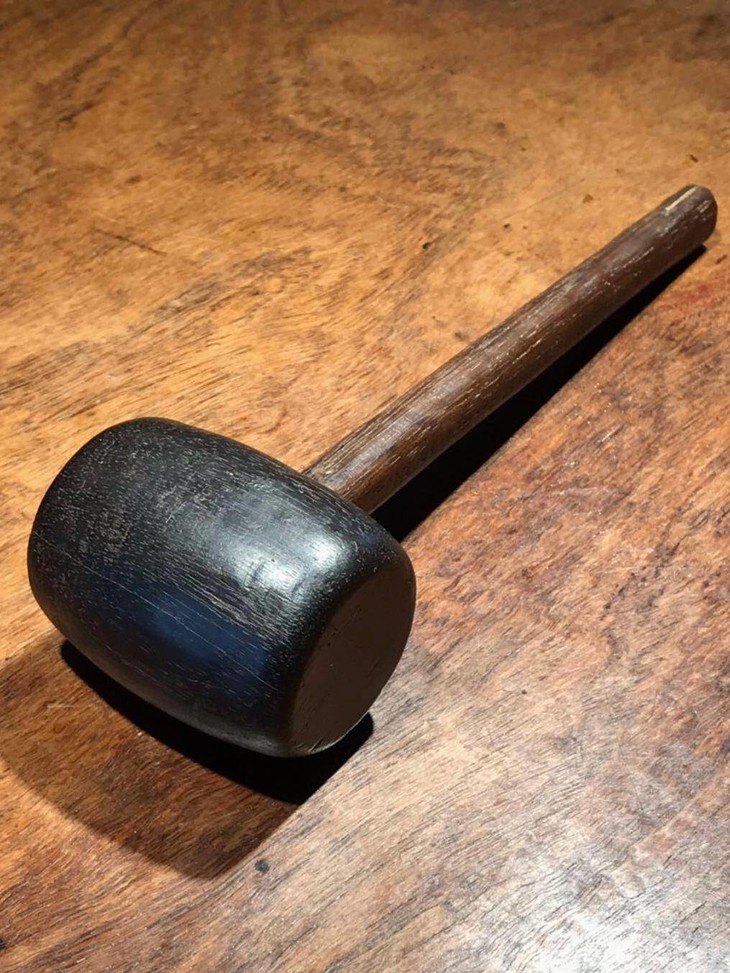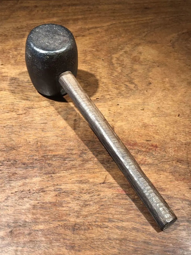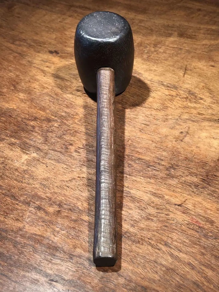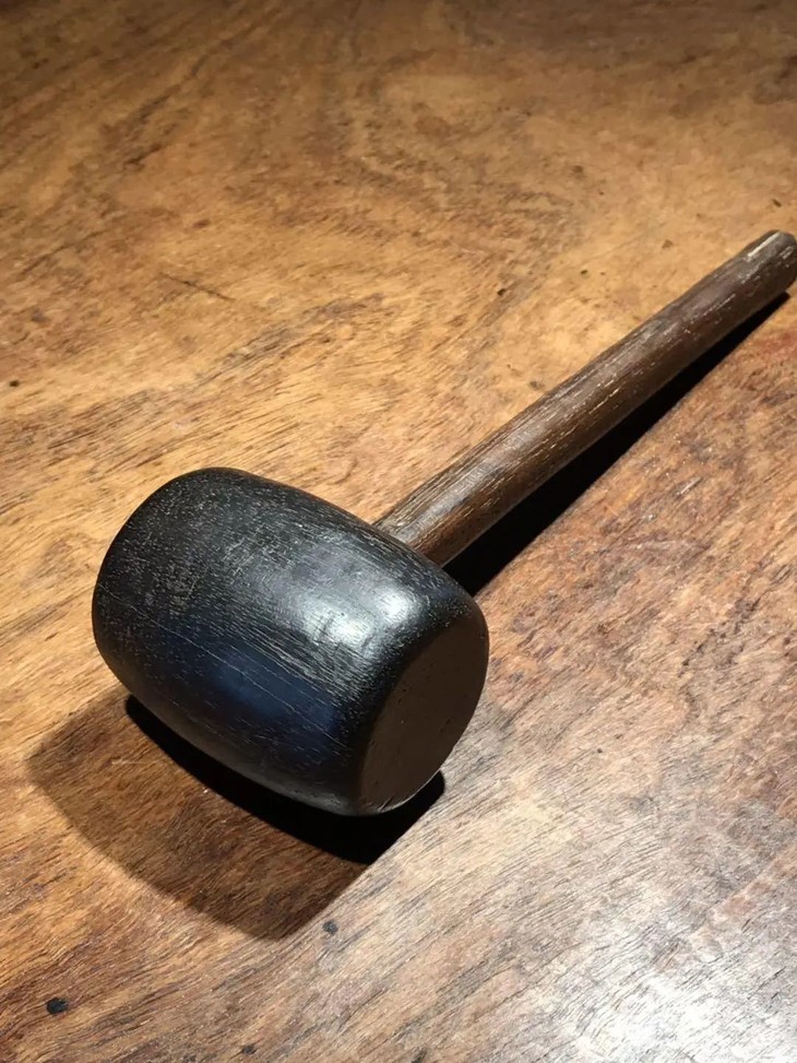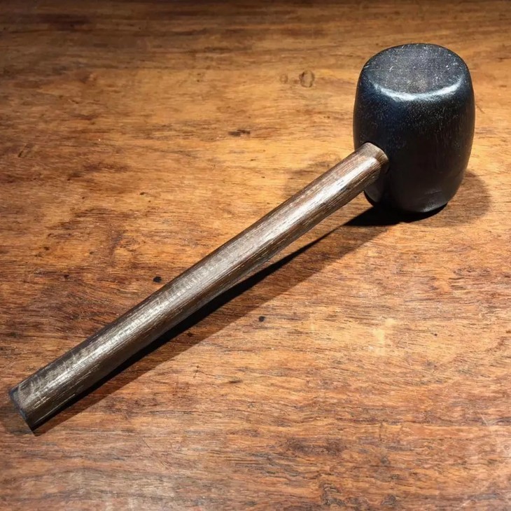 槌体以质地坚硬、色泽乌黑的檀木琢磨成圆鼓型,槌柄取材坚硬油润的酸枝或花梨木削磨成柄,器型比例恰当,規矩饱满,简约大气,经历逾百年之历史,木头皮壳圆润,包浆厚重,入手置于案头美观典雅,或可实用为坚果槌或养生捶背之利器。