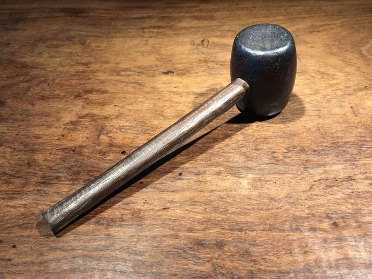 这是一只古代敲击乐器“磬“的木制击槌,磬是一种以玉石或石板雕琢而成的敲击乐器,此磬槌以黑檀木及酸枝两种硬木雕琢而成。