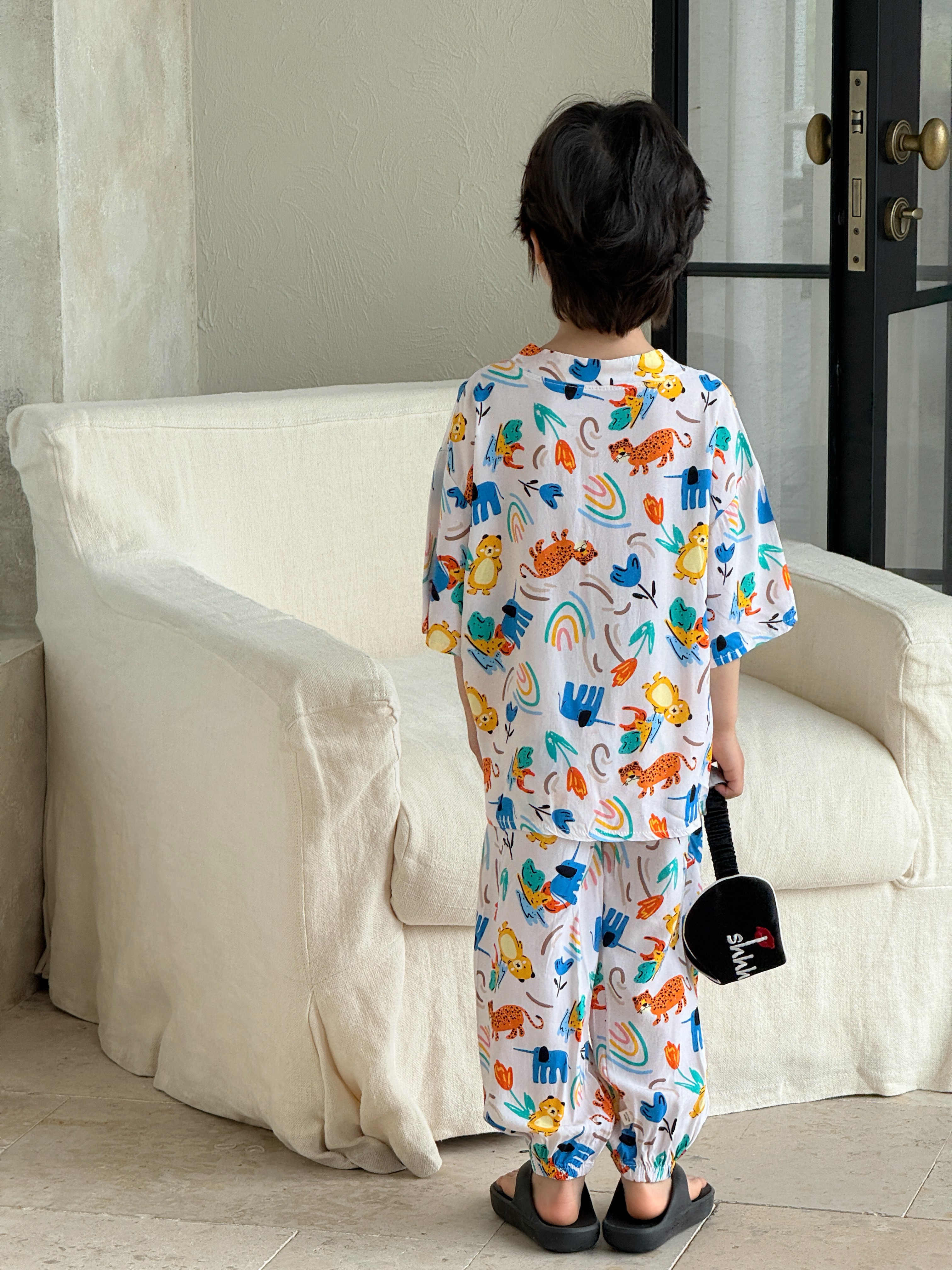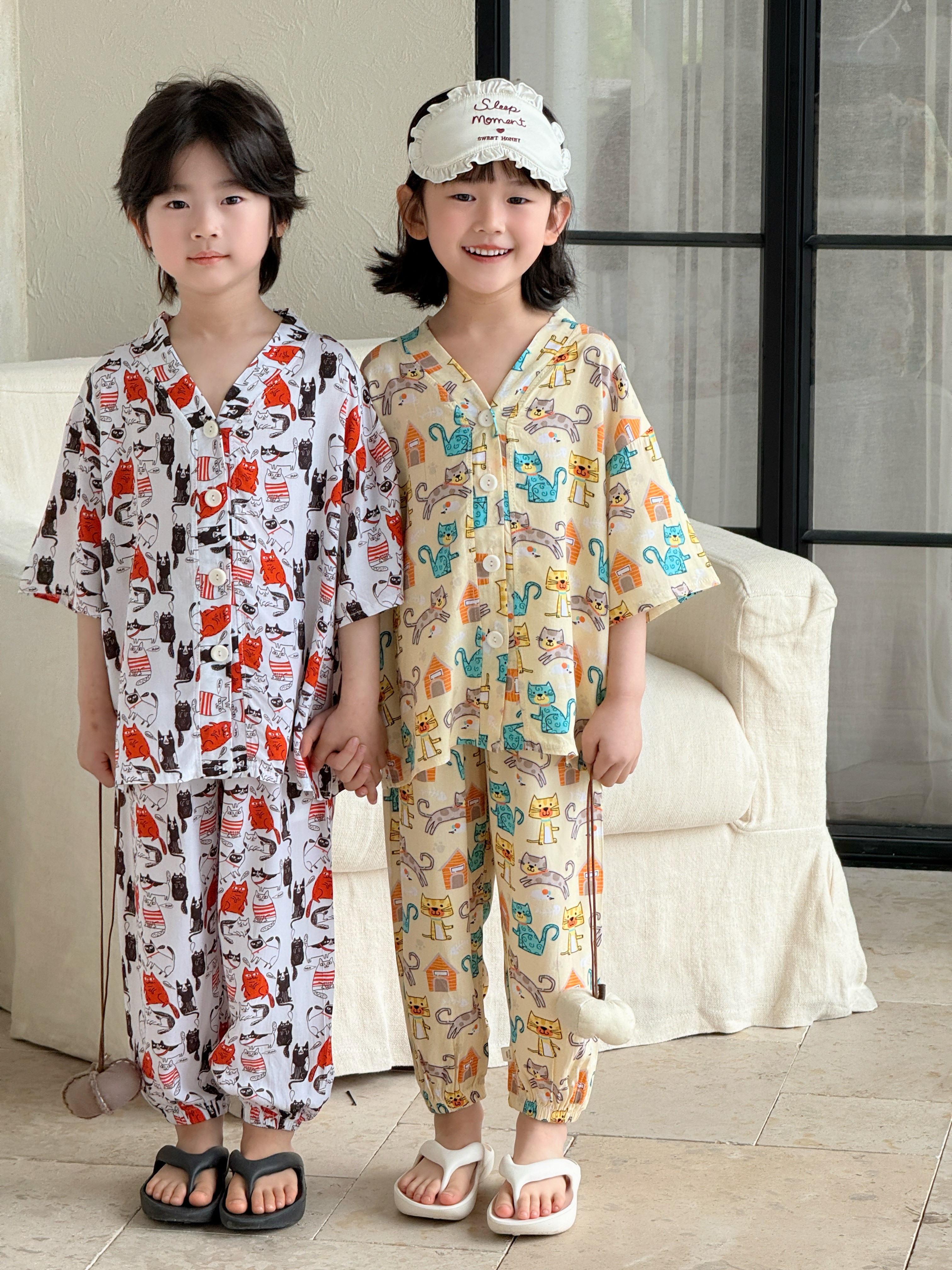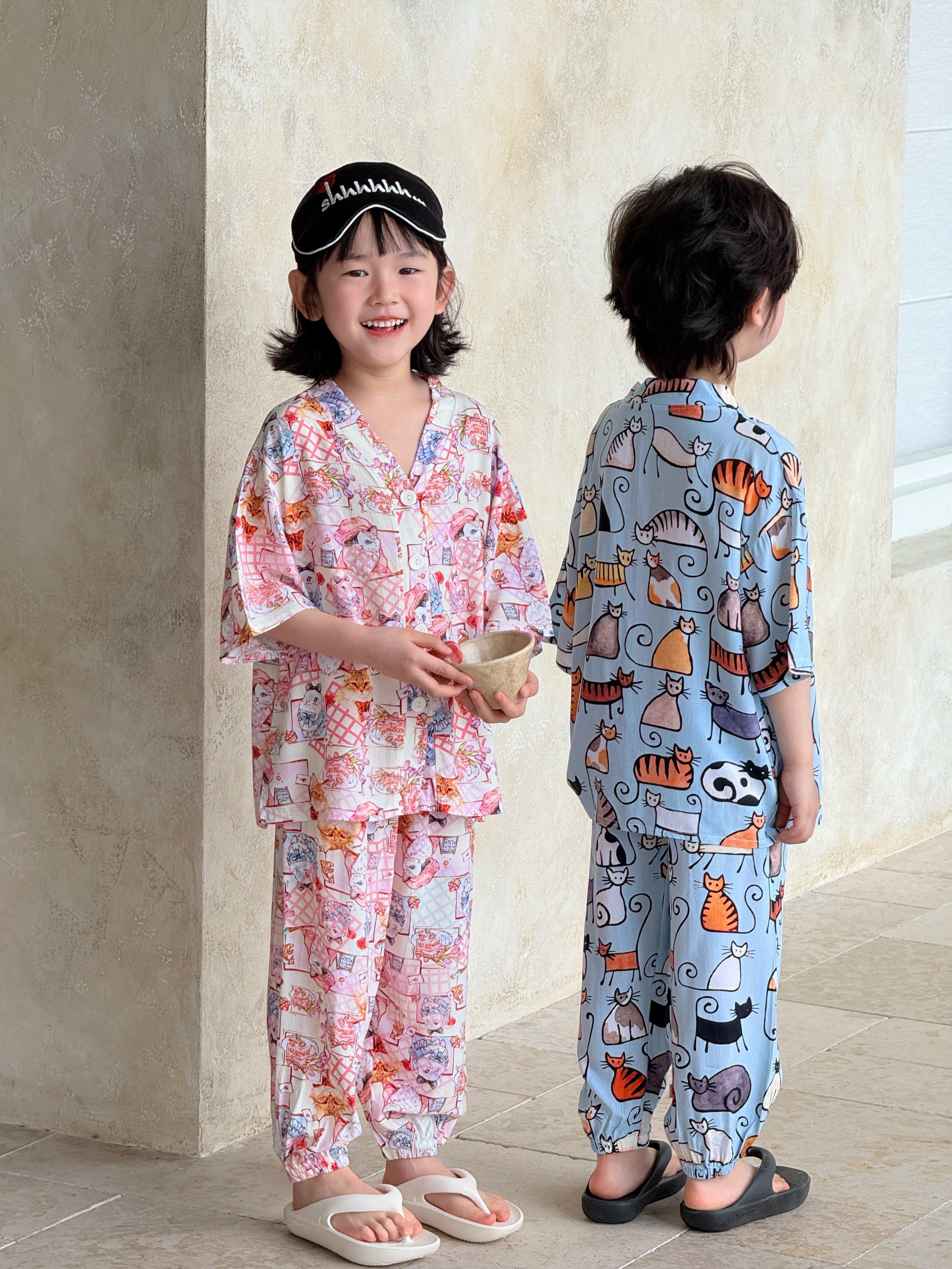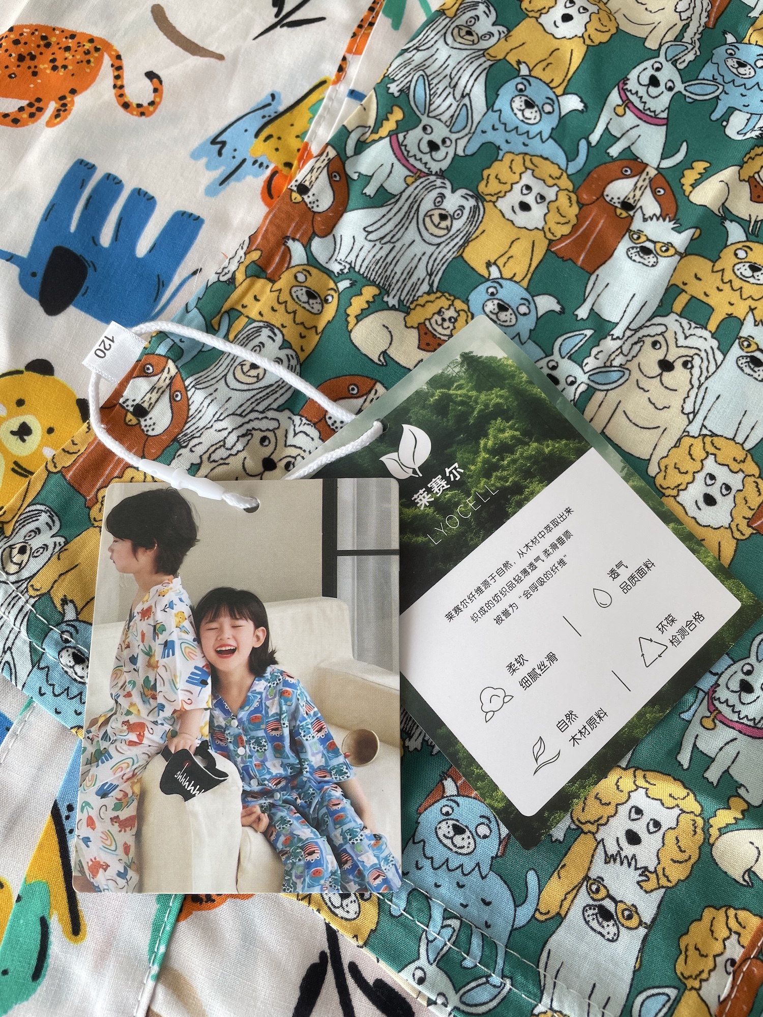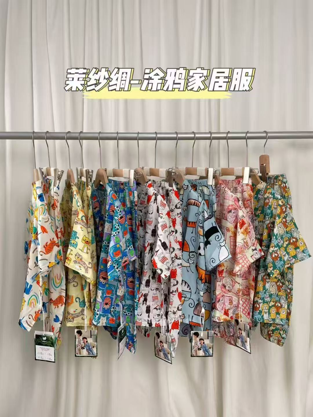 「59.9元2套 短袖➕长裤」喜林贝尔 莱纱绸儿童涂鸦家居服 居家遛弯不惧空调风,不怕蚊子咬