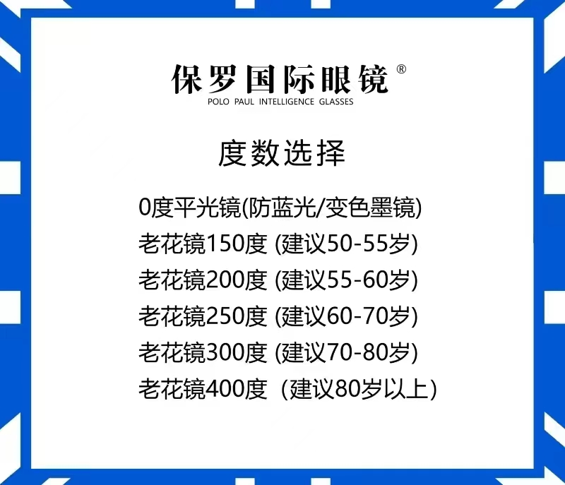 【品名】POLO PAUL 保罗暴龙款 变色功能性眼镜 平光镜/老花镜 【规格】 0度平光镜(防蓝光+变色墨镜) 老花镜150度(建议50-55岁) 老花镜200度(建议55-60岁) 老花镜250度(建议60-70岁) 老花镜300度(建议70-80岁) 老花镜400度(建议80岁以上) 【产地】国内 【发货包装】独立包装 【发货地】浙江 【发货快递】中通、圆通、申通、韵达、极兔随机发 【不发货区域】新疆、西藏、港澳台 【发货时效】48-72小时,周末节假日顺延 |