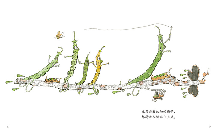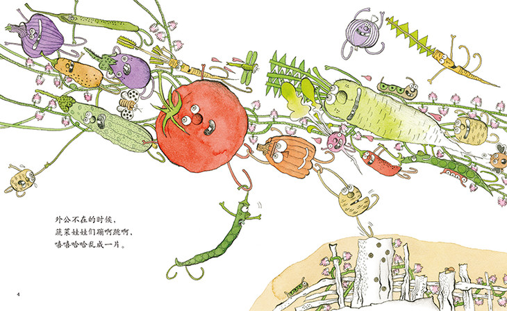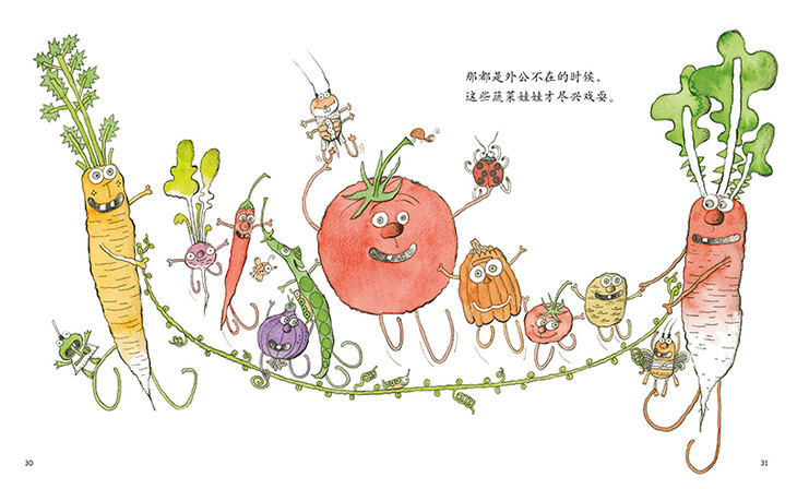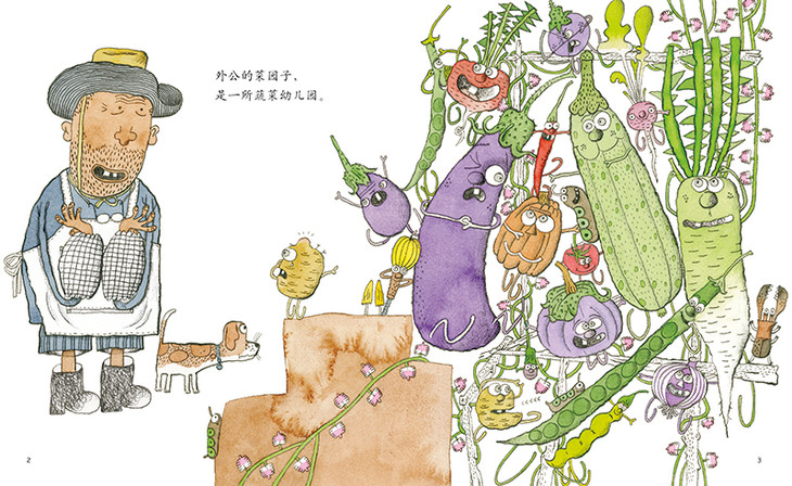 《外公的菜园子》里外公最喜欢的事情就是每天打理自己的菜园子。这片菜园子对“我”来说,是一片神奇的所在,我在外公的菜园子里看到了挥舞着鞭子的豆角,看到了挺着肚皮的西葫芦,看到了装着辣椒水的柿子椒,看到了双手叉腰的洋葱……外公不在的时候,这片菜园子里的蔬菜娃娃们,各个张牙舞爪,尽情玩耍,但只要外公走进这片菜园子,这些蔬菜娃娃们就都乖乖听话了。