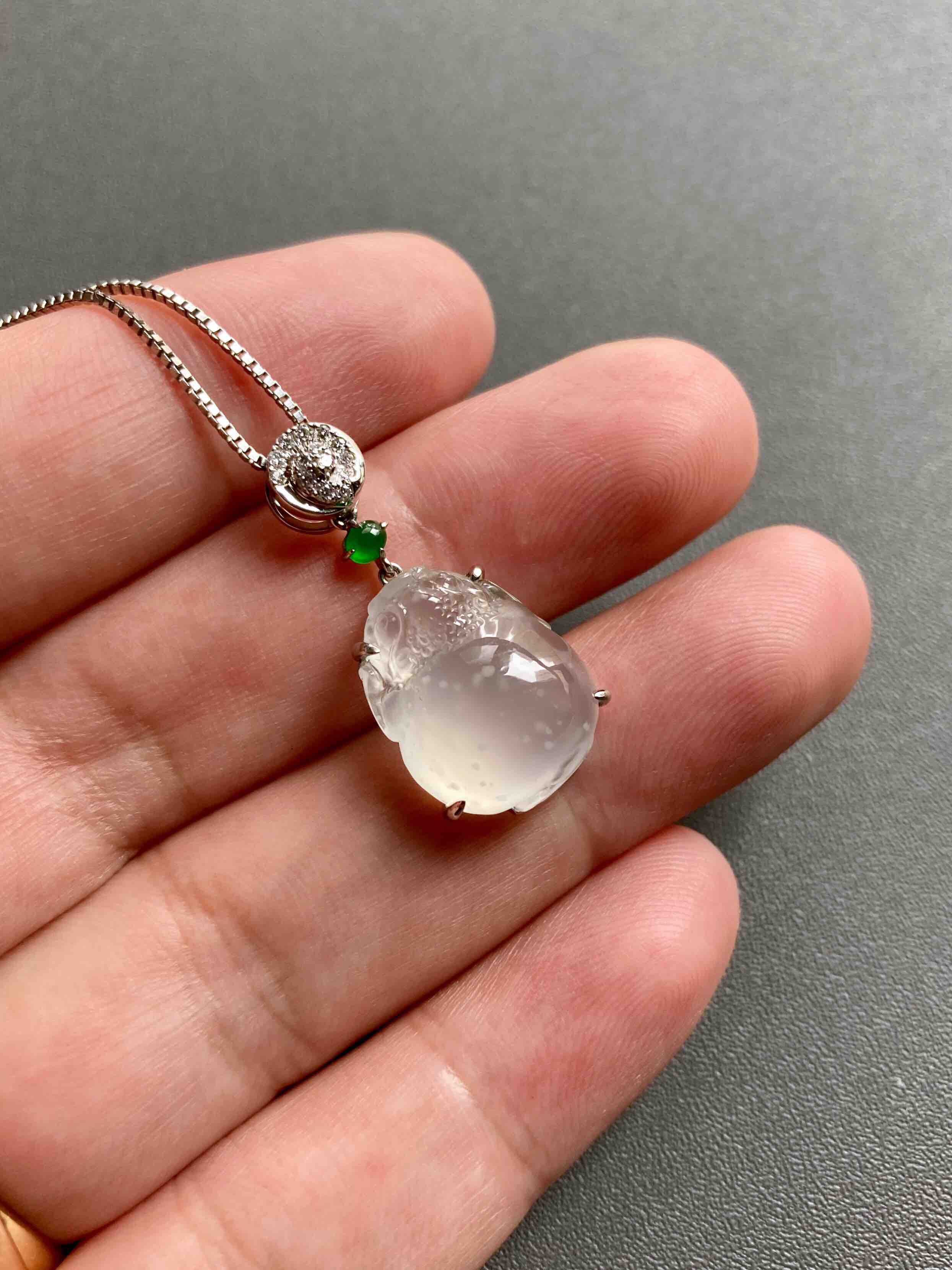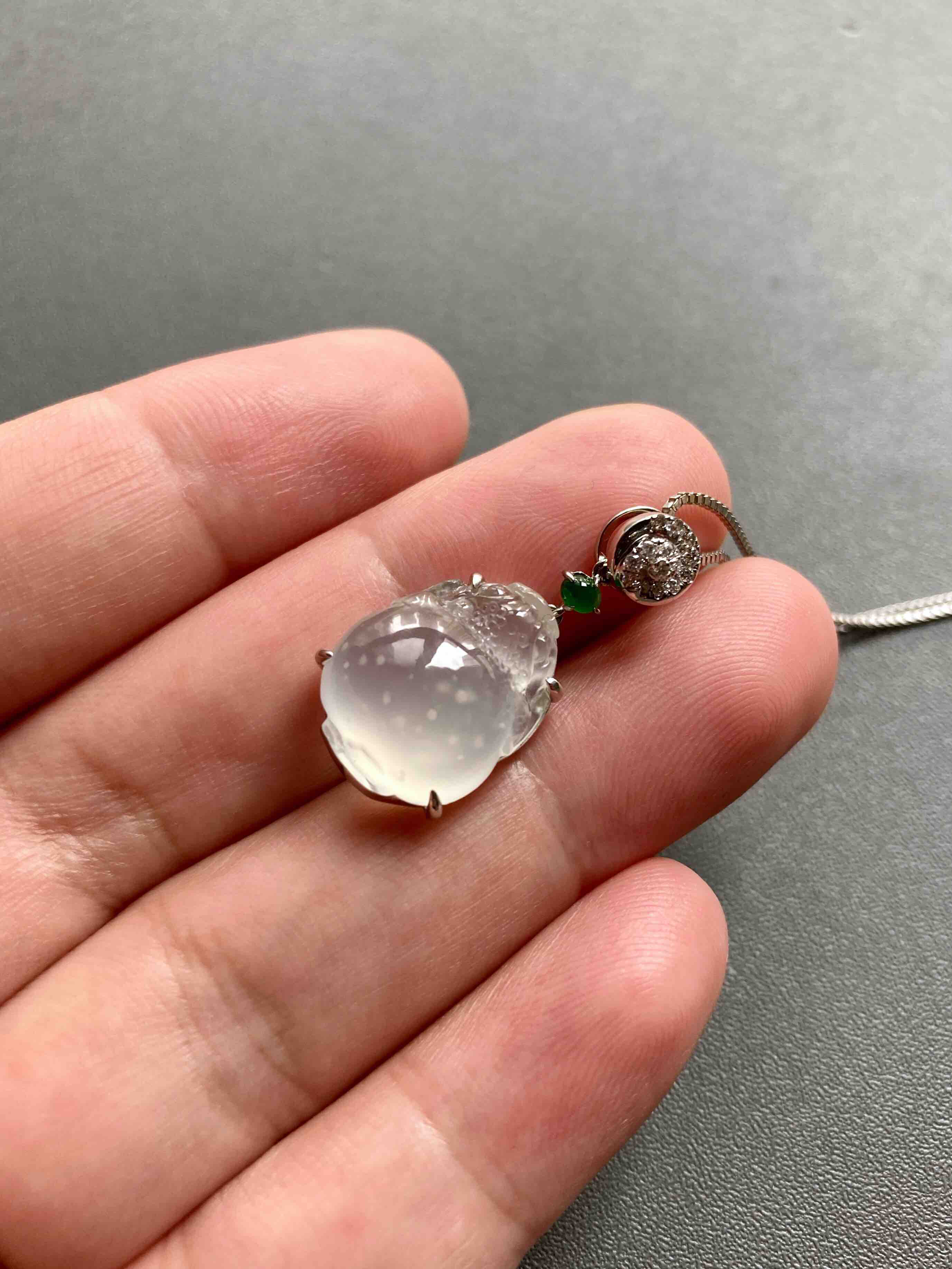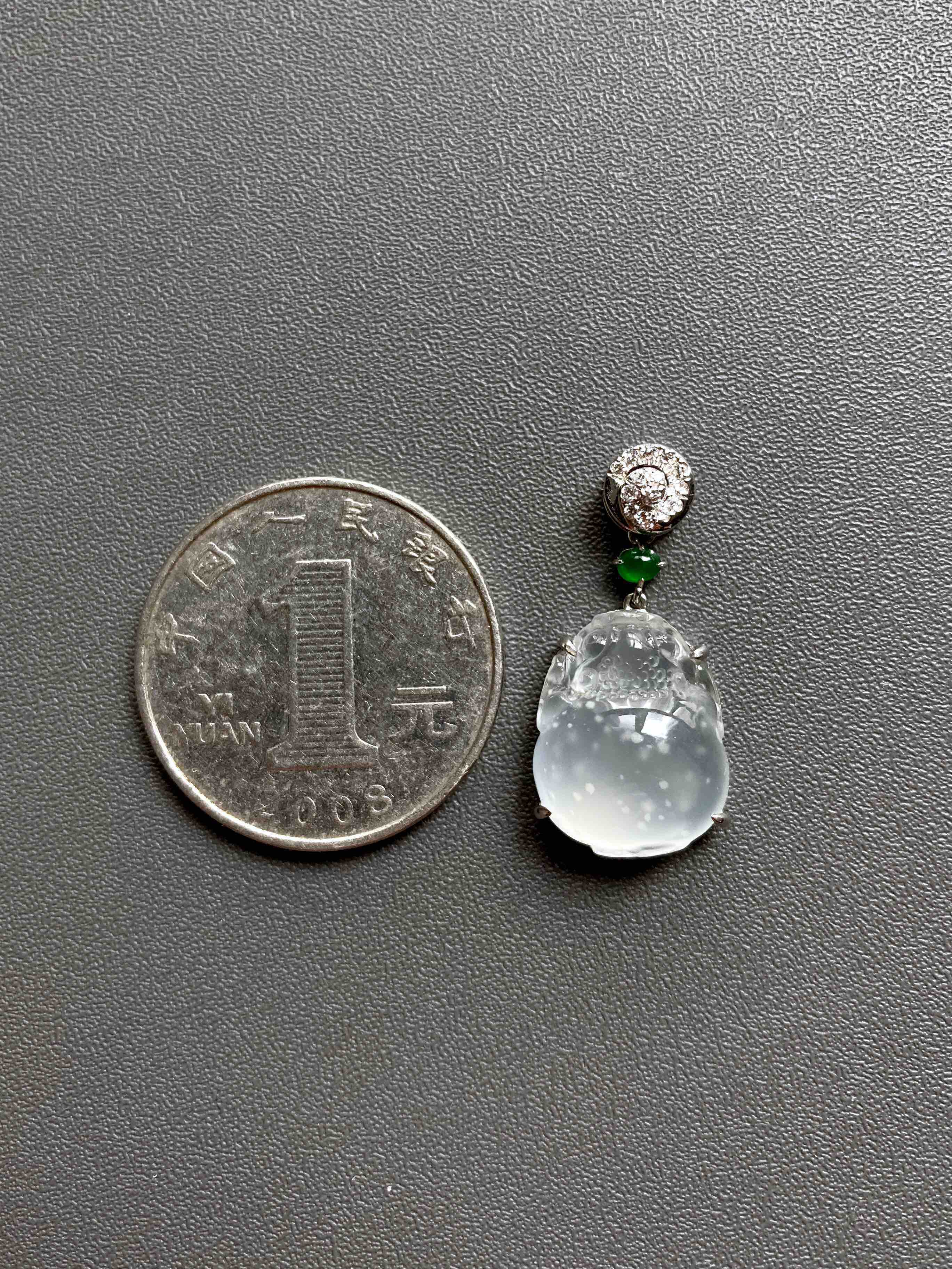 高冰到玻璃种雪花棉厚庄翡翠金蟾18k白金钻石镶嵌,当我们在玩翡翠金蟾的时候我们在玩什么?我们欣赏的是金蟾肚子光面无雕,光球一样的种水之美,一件集大成之作,裸石16×12.6×6.6mm,镶嵌后27.4×12.8×7mm,高冰到玻璃种雪花棉,种水实在太美,肚子里仿佛装着全宇宙,看头部肌肤的刻画,雕工令人惊叹,翡翠禄来原创设计镶嵌,18k白金钻石镶嵌,一颗高冰种帝王绿翡翠蛋面点睛