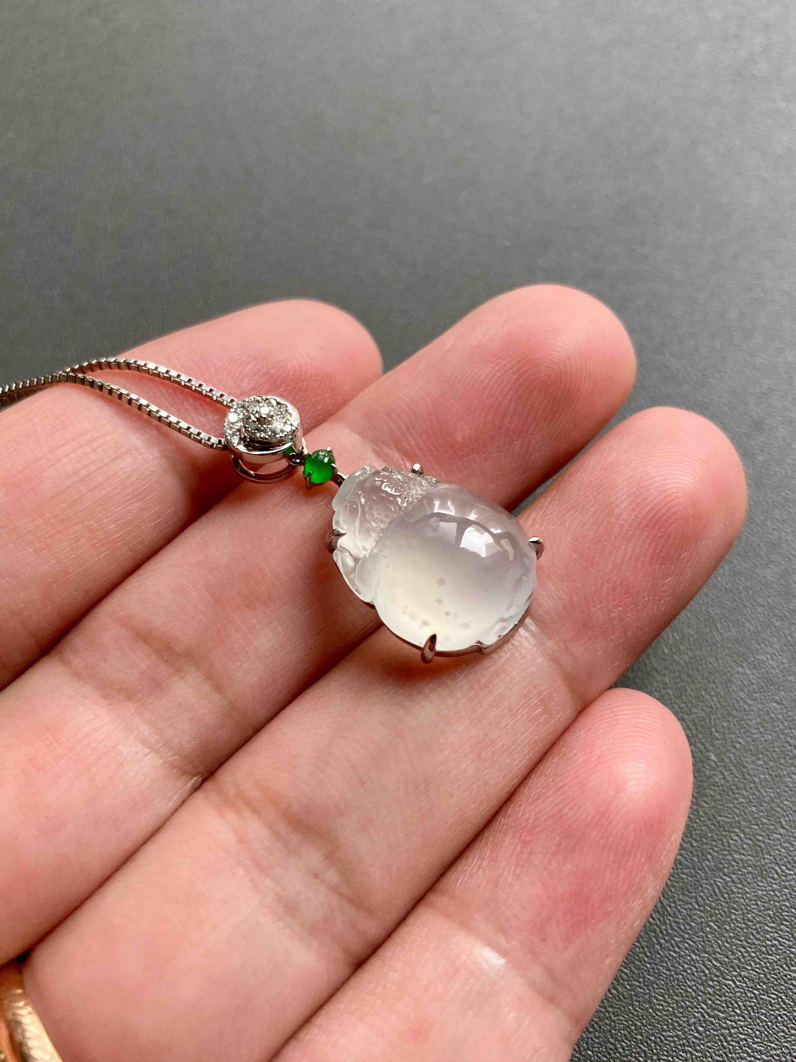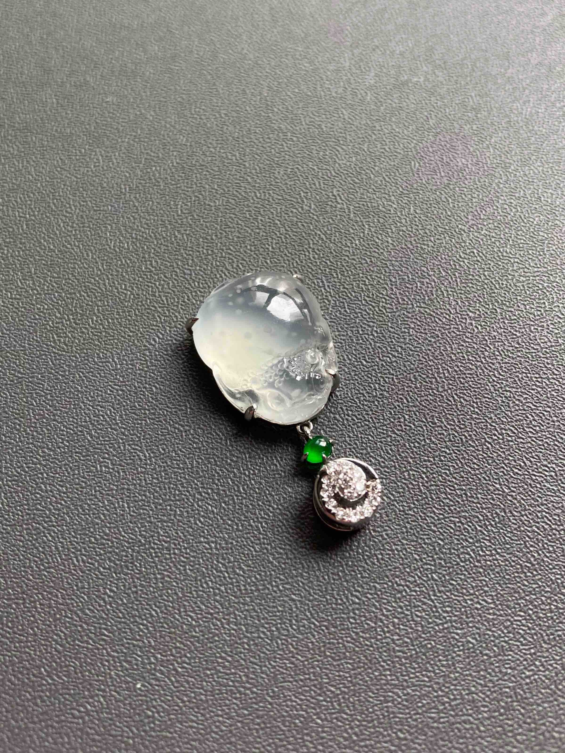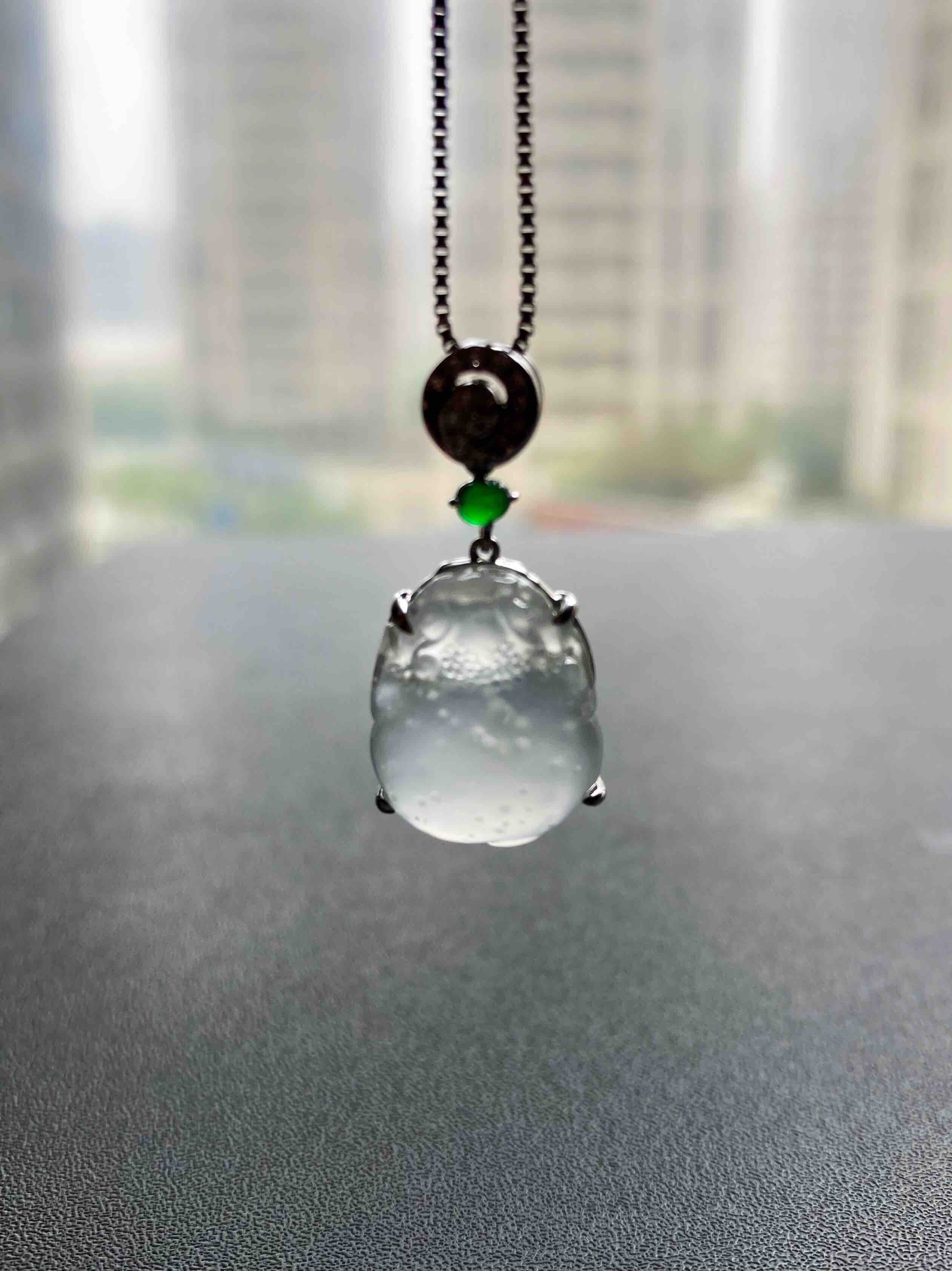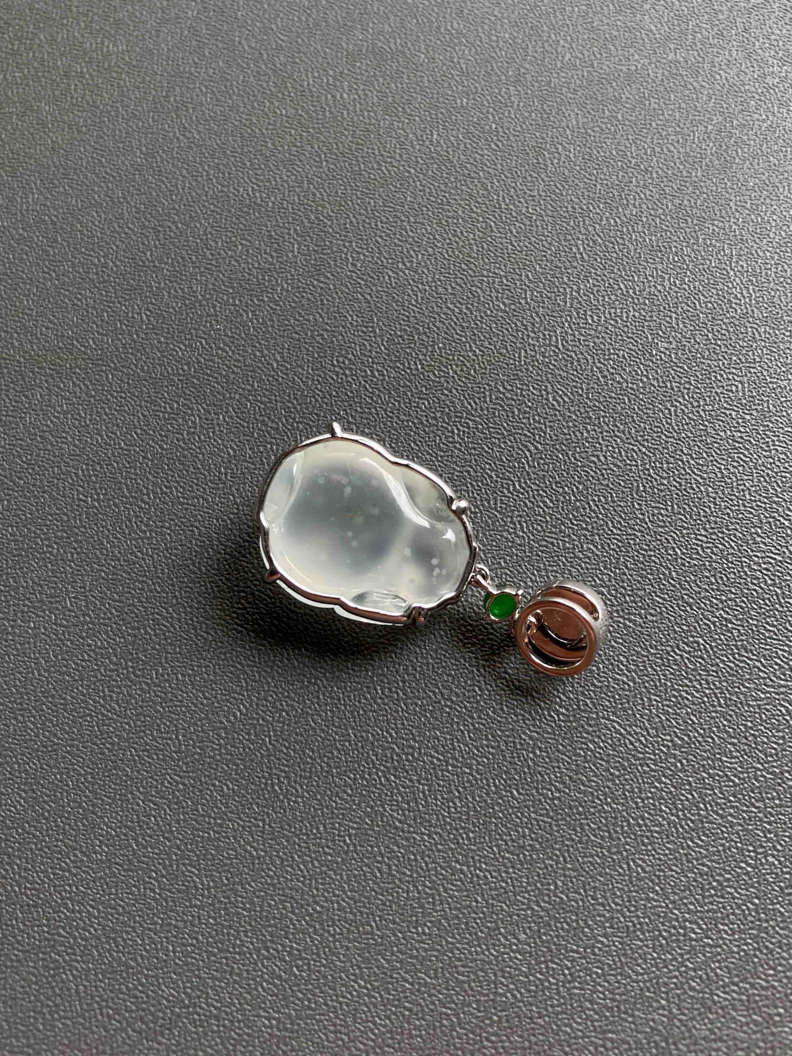 高冰到玻璃种雪花棉厚庄翡翠金蟾18k白金钻石镶嵌,当我们在玩翡翠金蟾的时候我们在玩什么?我们欣赏的是金蟾肚子光面无雕,光球一样的种水之美,一件集大成之作,裸石16×12.6×6.6mm,镶嵌后27.4×12.8×7mm,高冰到玻璃种雪花棉,种水实在太美,肚子里仿佛装着全宇宙,看头部肌肤的刻画,雕工令人惊叹,翡翠禄来原创设计镶嵌,18k白金钻石镶嵌,一颗高冰种帝王绿翡翠蛋面点睛