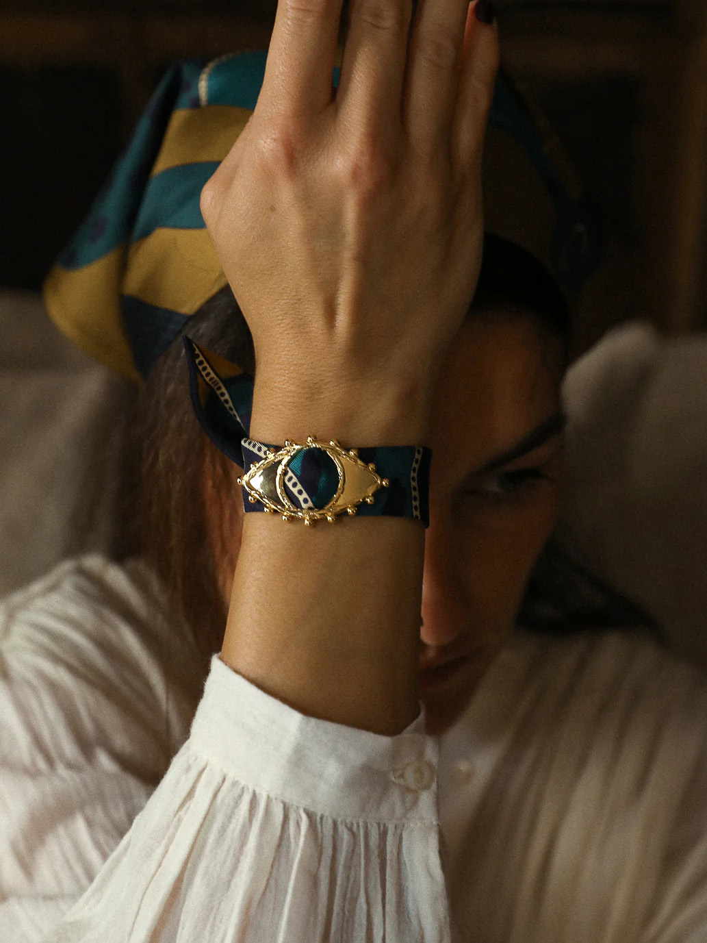订购14周到|AN-NEE-ONOEIL-棕绿色 夏帕诺瓦 4cm 丝巾装饰扣手镯[法国设计师]