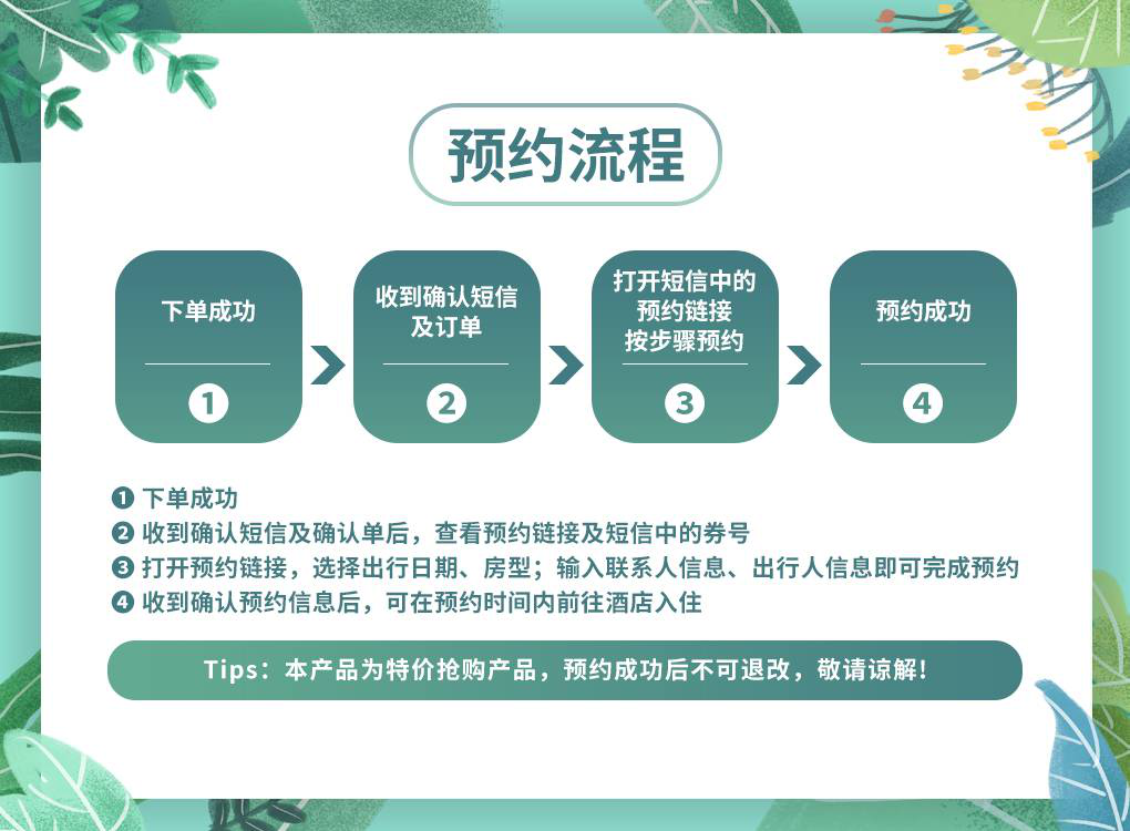 4.购买后请尽快确认出行时间并尽早预约,以免造成计划出游日满房导致无法预约。