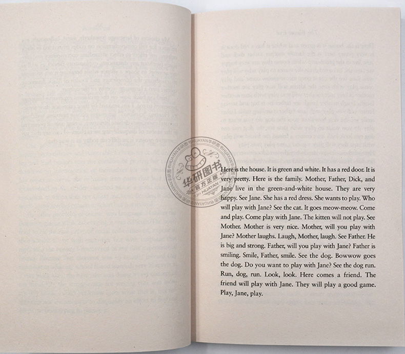 Here is the house. It is green and white. It has a red door. It is very pretty. Here is the family. Mother, Father, Dick, and Jane live in the green-and-white house. They are very happy. See Jane. She has a red dress. She wants to play. Who will play with Jane? See the cat. It goes meow-meow. Come and play. Come play with Jane. The kitten will not play. See Mother. Mother is very nice. Mother, will you play with Jane? Mother laughs. Laugh, Mother, laugh. See Father. He is big and strong. Father, will you play with Jane? Father is smiling. Smile, Father, smile. See the dog. Bowwow goes the dog. Do you want to play with Jane? See the dog run. Run, dog, run. Look, look. Here comes a friend. The friend will play with Jane. They will play a good game. Play, Jane, play.