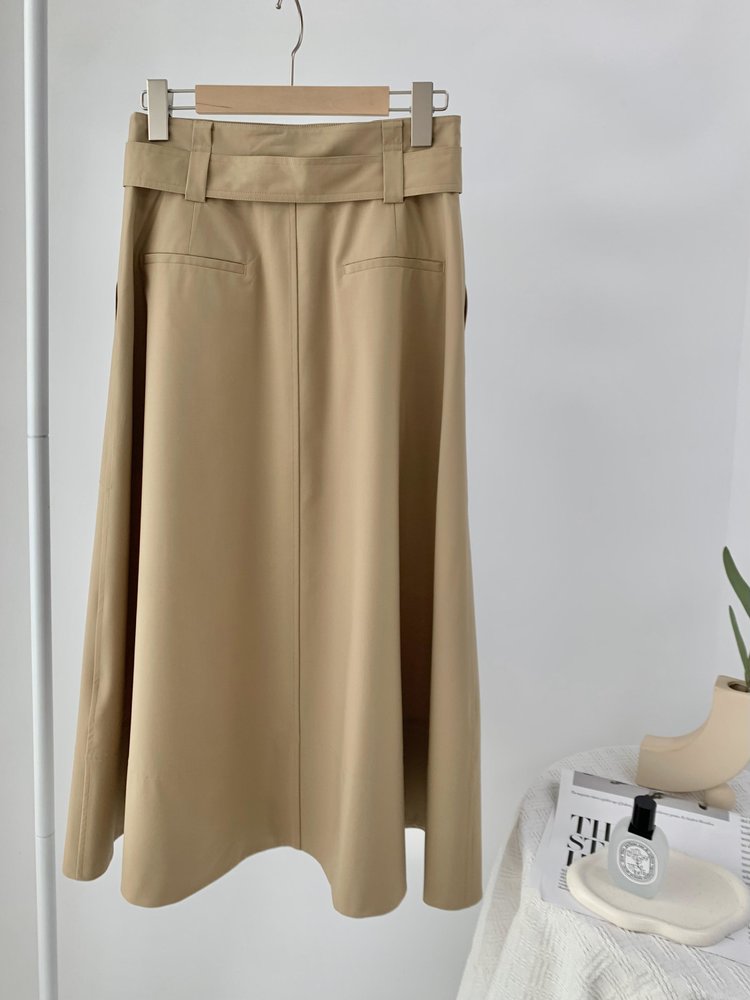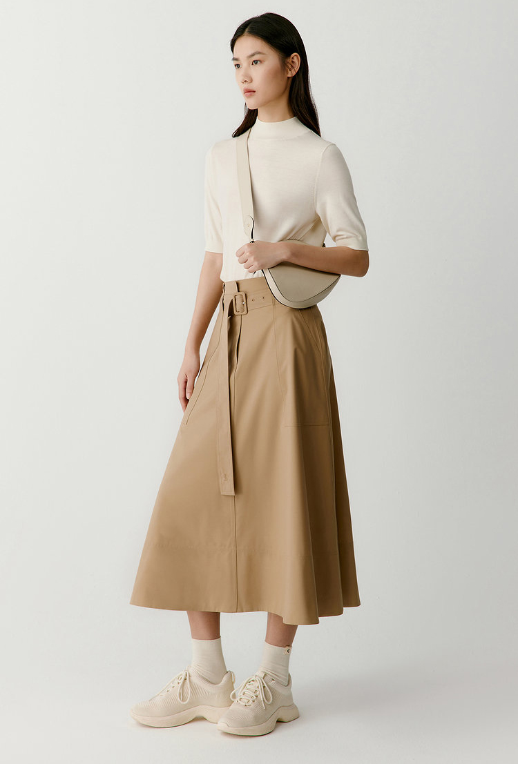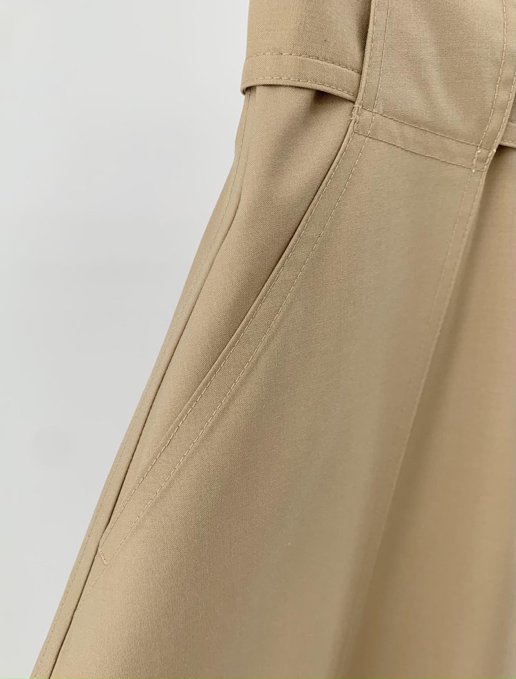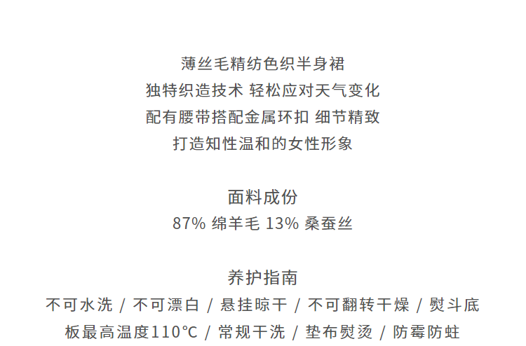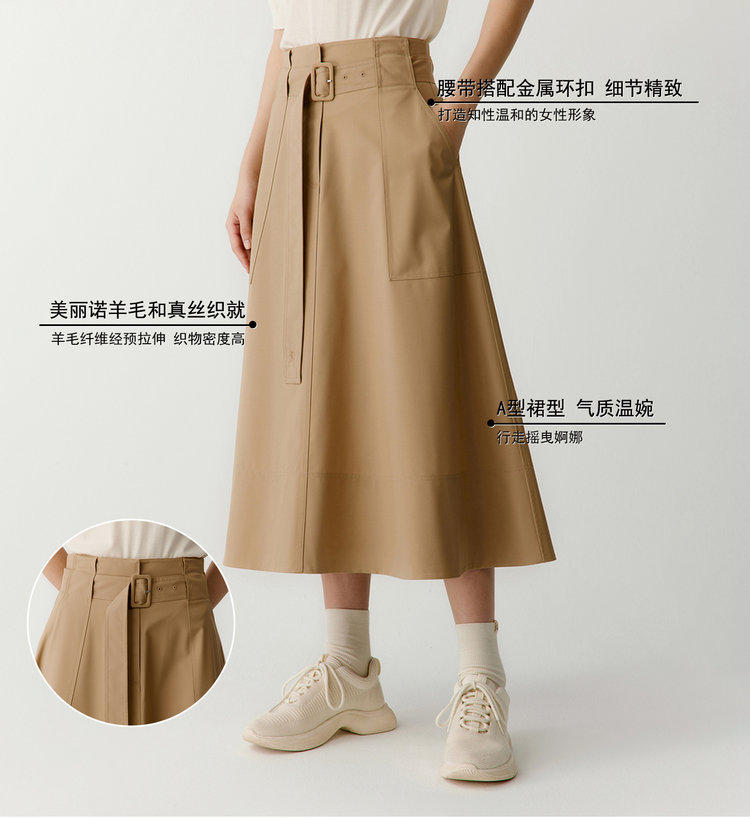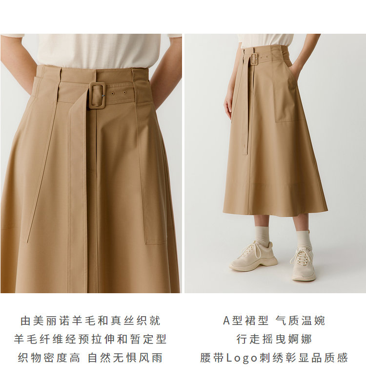 独家澳洲进口丝毛面料,A型裙型,气质温婉,行走摇曳婀娜,腰带Logo刺绣彰显品质感。