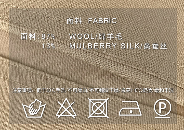 由美丽诺羊毛和真丝织就,羊毛纤维经预拉伸和暂定型,织物密度高,自然无惧风雨,上身自带优雅与浪漫。