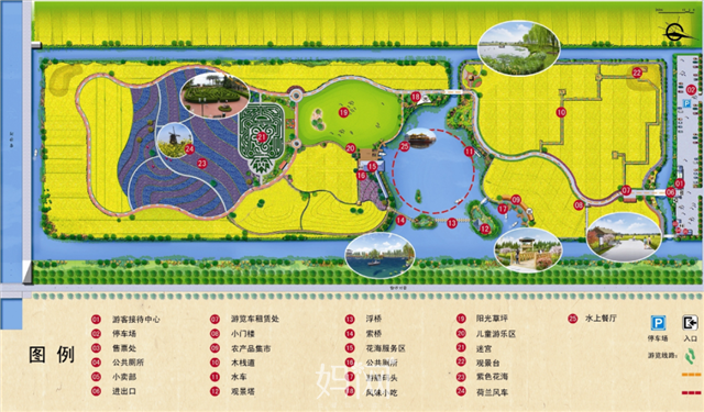 沿途还设置了农副产品集市、农家风味小吃、游船码头、迪士尼迷宫、儿童欢乐城堡、特色花海、水上餐厅等项目,享有“苏南第一花海”的美誉。