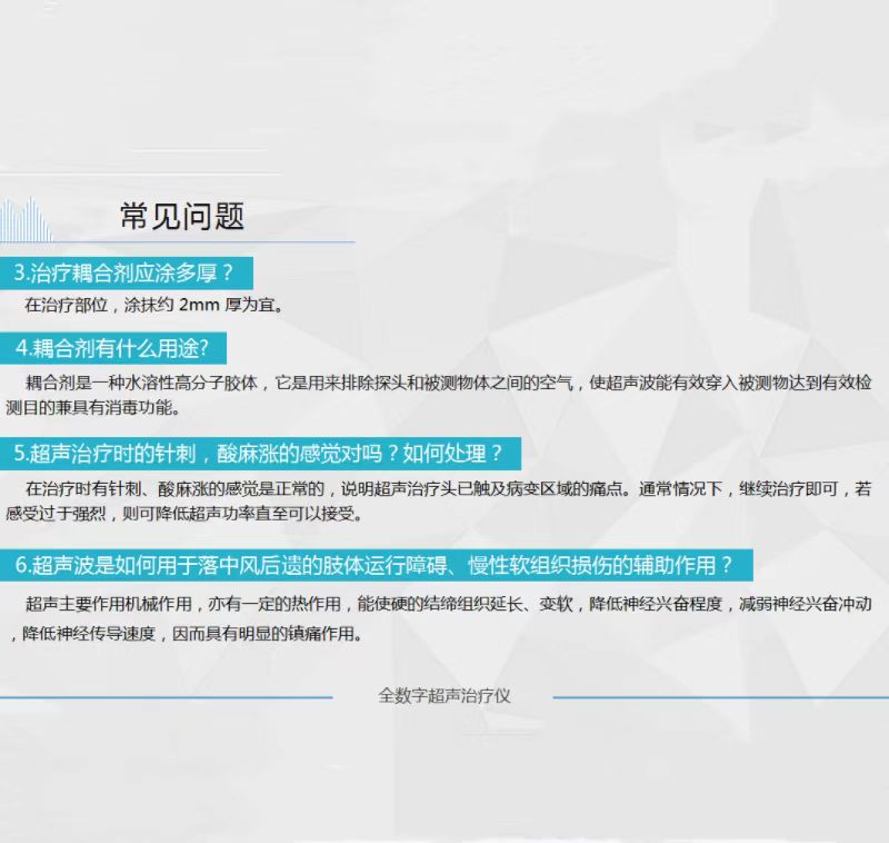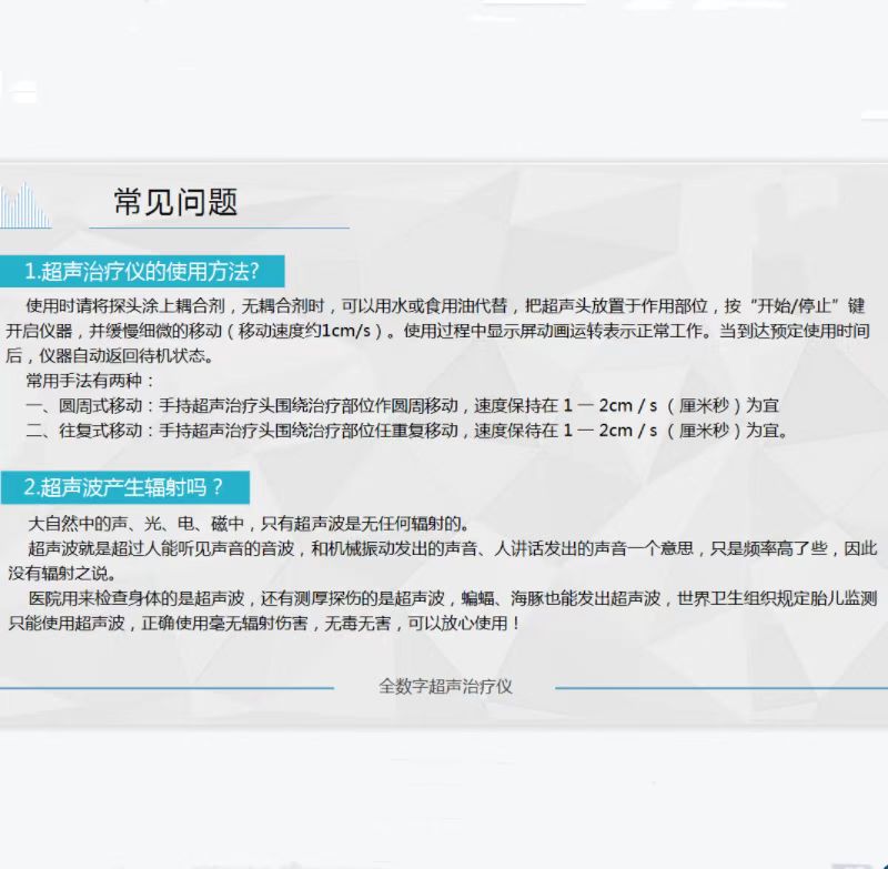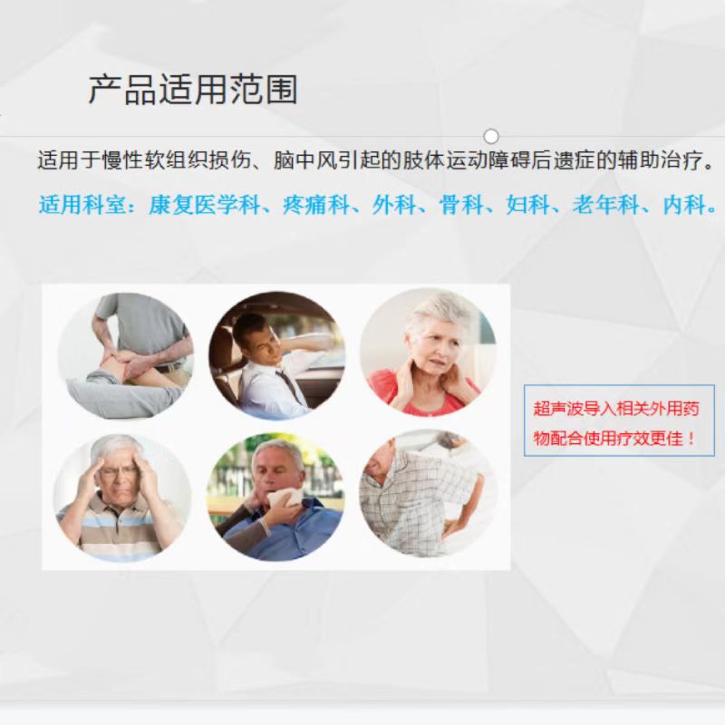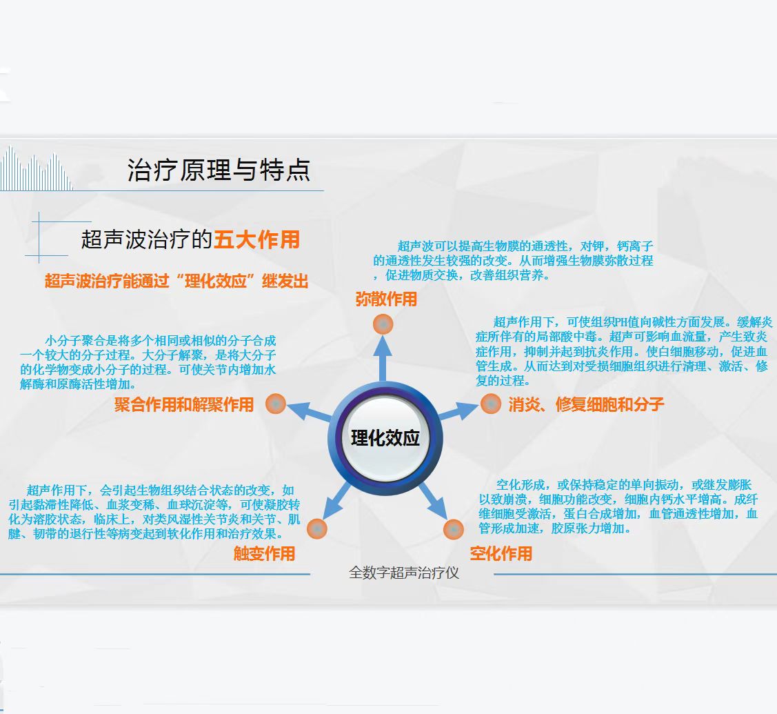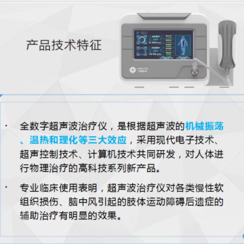 本产品全数字超声治疗仪是利用超声波三大效应对人体进行物理治疗的高科技产品。