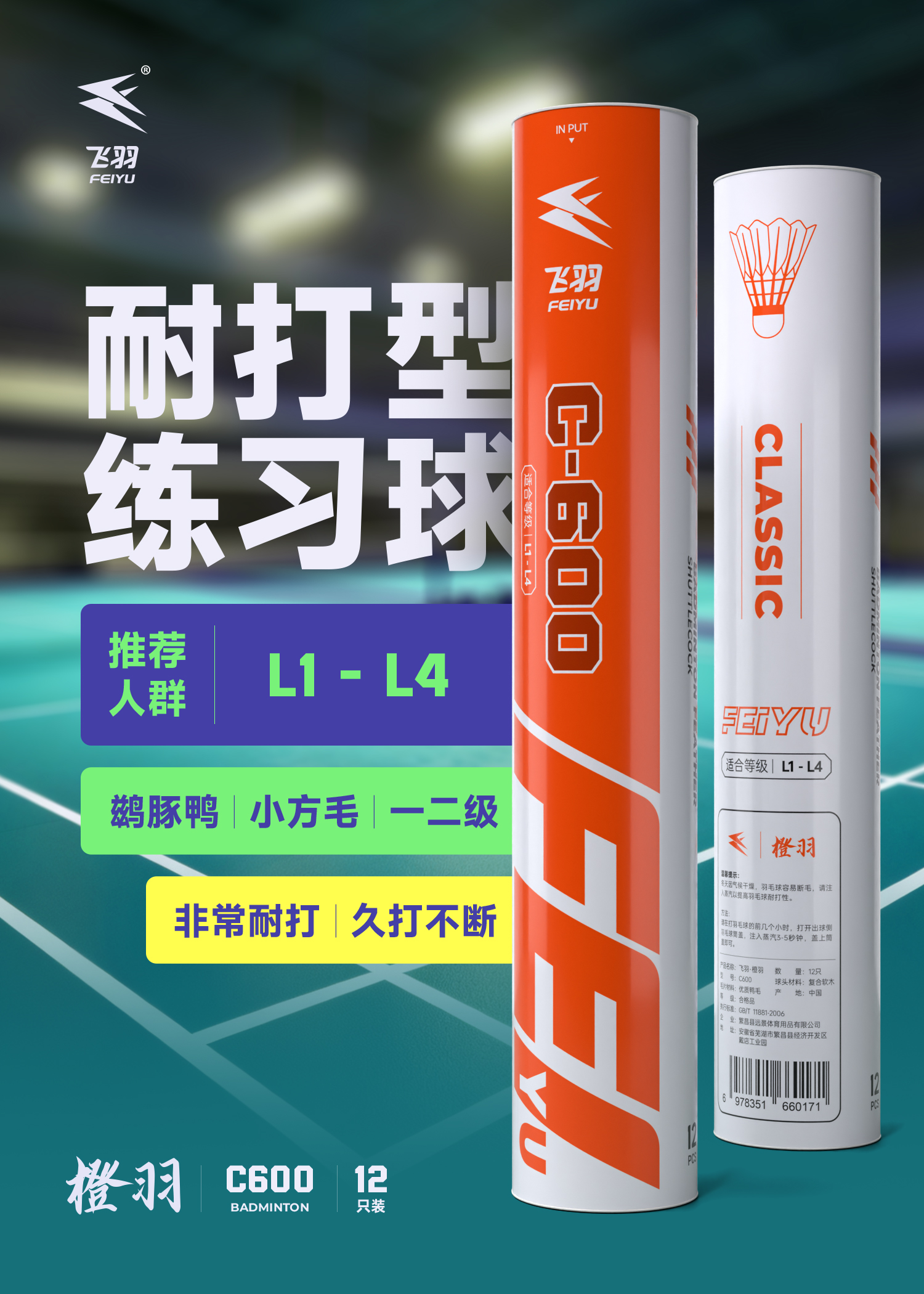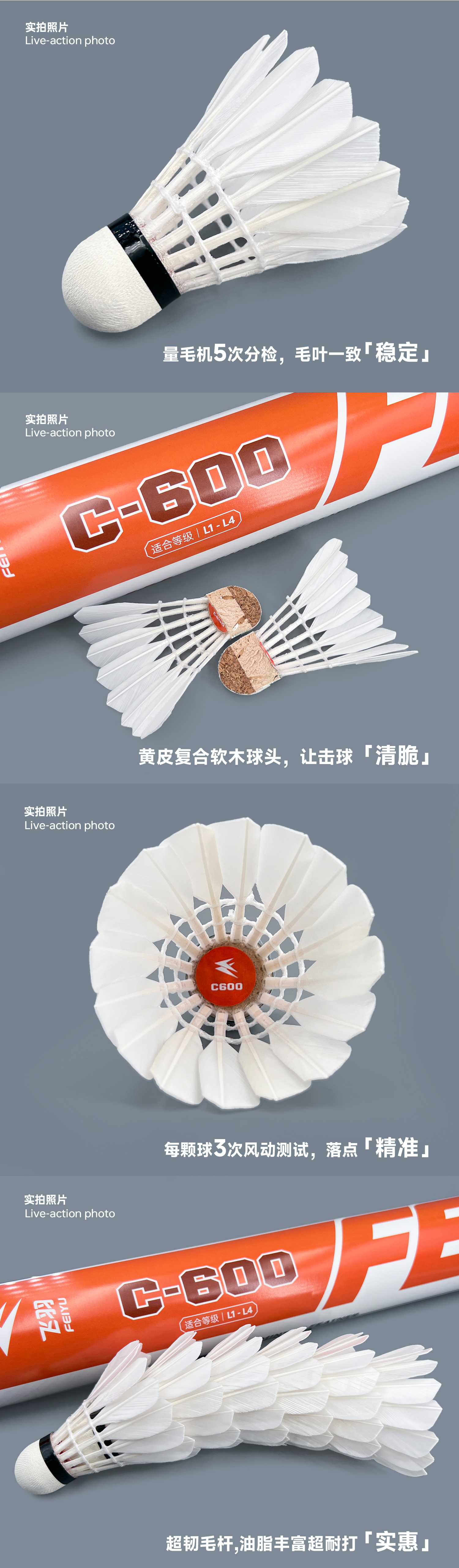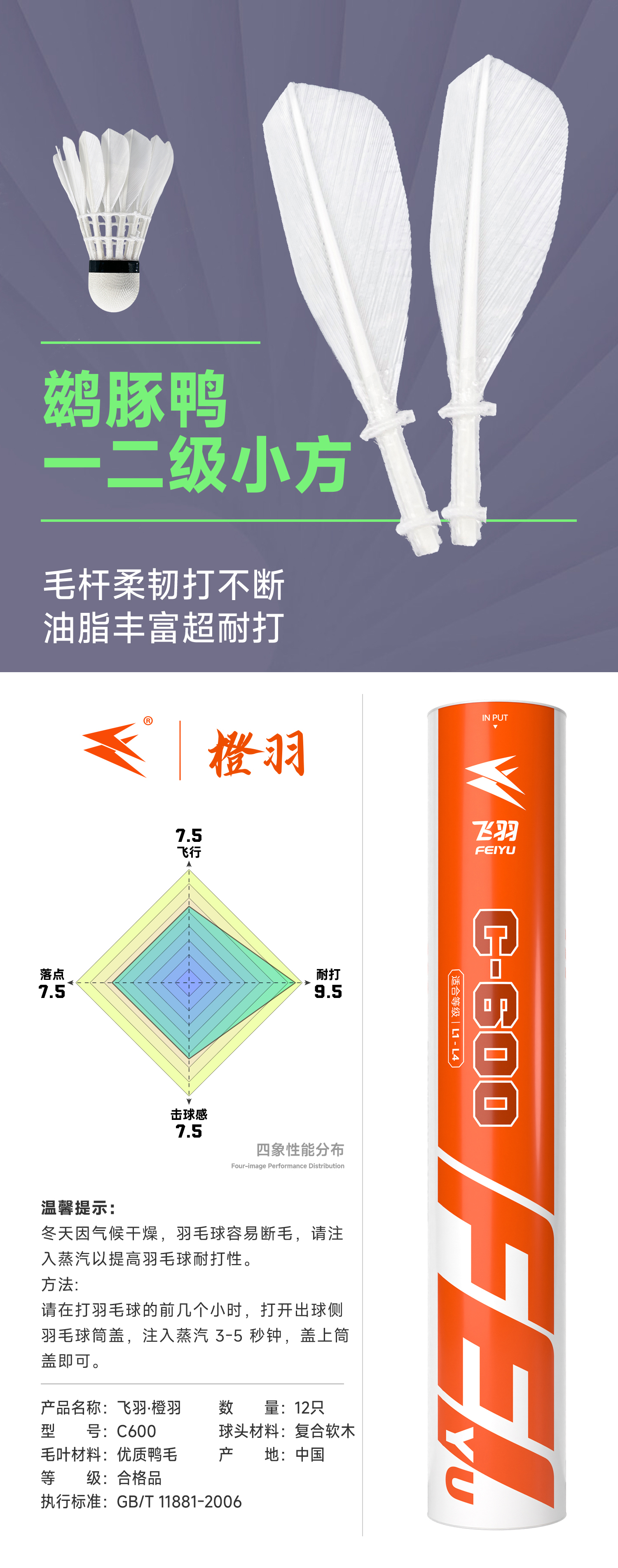 飞羽 羽毛球 训练级 优质鸭毛 橙羽-C600