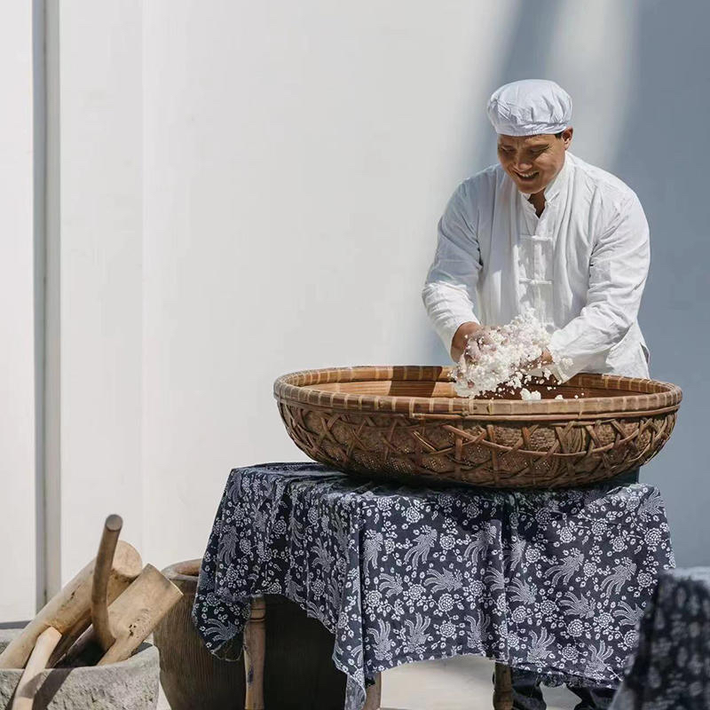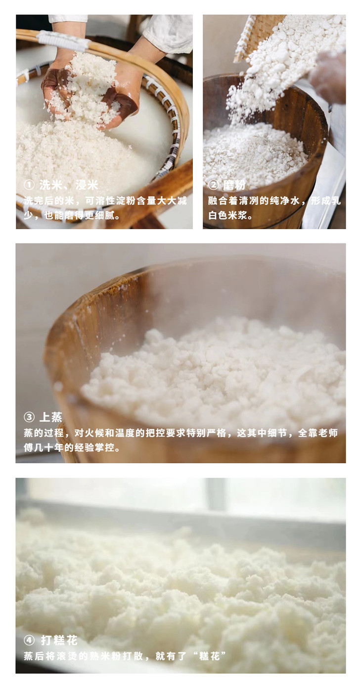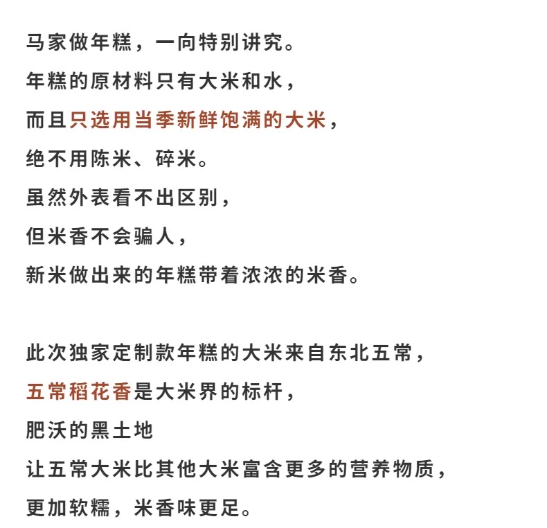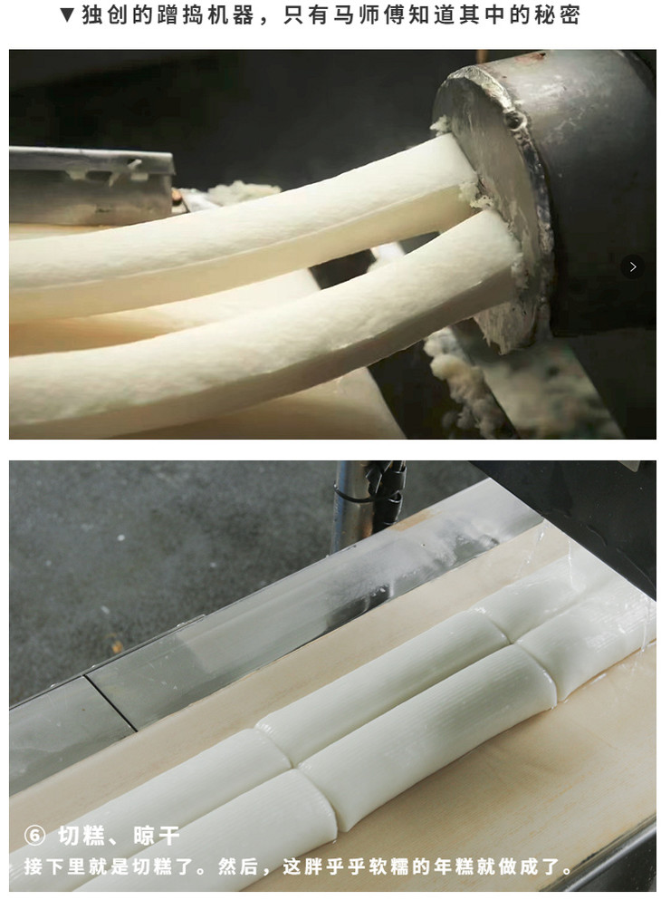 马家年糕,世代传承,始终坚守初心,严格挑选优质大米和纯净水,以当季五常稻花香大米为原材料,更是保证了年糕的品质与口感。而洗米、浸米、磨粉、上蒸、打糕花、蹭捣、切糕、晾干等繁琐工序,都是马家年糕独特工艺的体现。其中,蹭捣环节尤为特别。马师傅独创的蹭捣机器,以檀木为锤,模仿手工捶打的力度和频率,这也是马家年糕区别于其他普通年糕的关键所在和三十年来秘而不宣的独门手艺。配料表更是干净,大米和水,就没有了,放心吃!