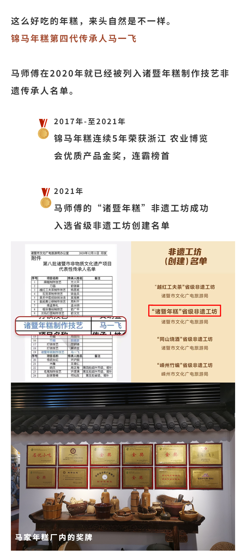 锦马年糕的第四代传承人马一飞马师傅在2020年就已经被列入诸暨年糕制作技艺非遗传承人名单。在马师傅的年糕工厂,有个博物馆,摆满了各种做年糕的老物件,以及获得的各种奖项。2015年至2021年,锦马年糕连续7年荣获浙江农业博览会销售金奖,连霸榜首。2021年,马师傅的“诸暨年糕”非遗工坊成功入选省级非遗工坊创建名单。