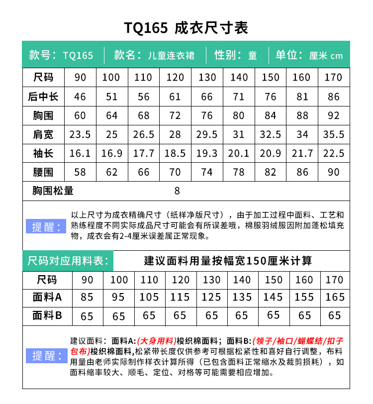 裁缝学苑TQ165 娃娃领泡泡袖连衣裙纸样儿童裙子样板图纸版型