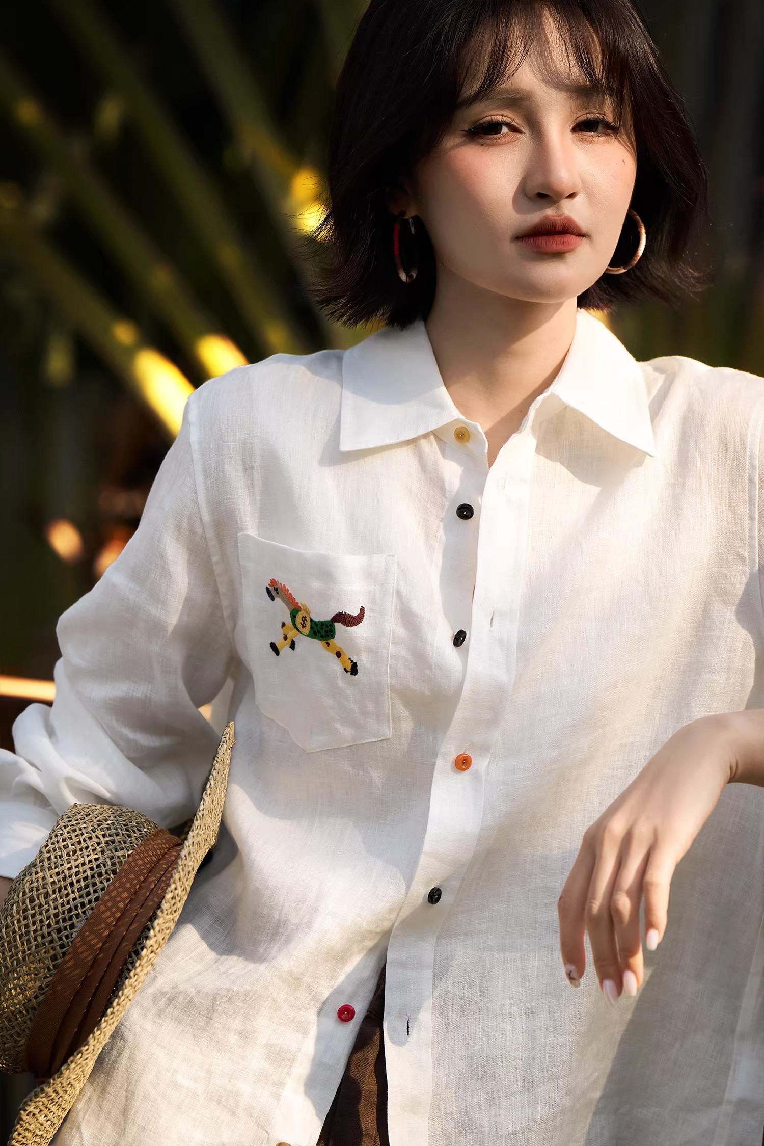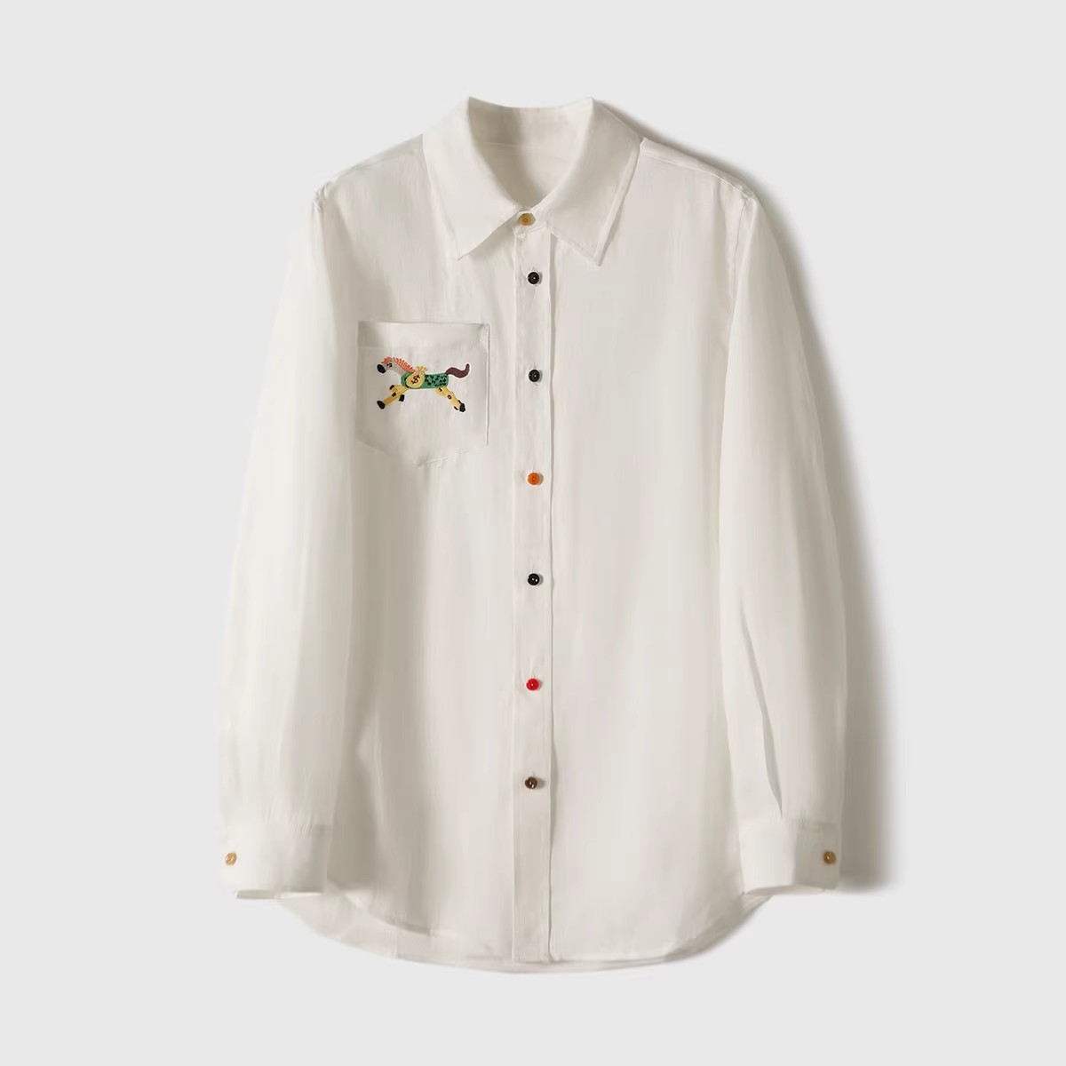 卷卷紫小马刺绣老钱风棉麻衬衣 棉麻混纺舒适亲肤透气 经典翻领修饰脖颈脸型 百搭时尚轻松打造老钱风既视感