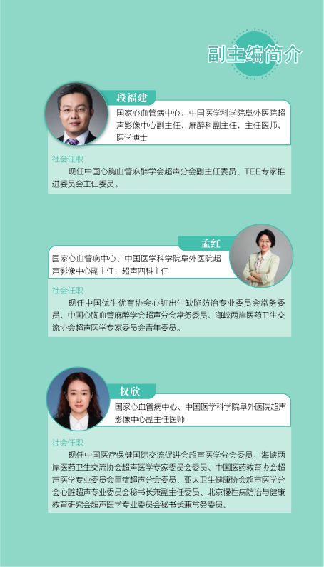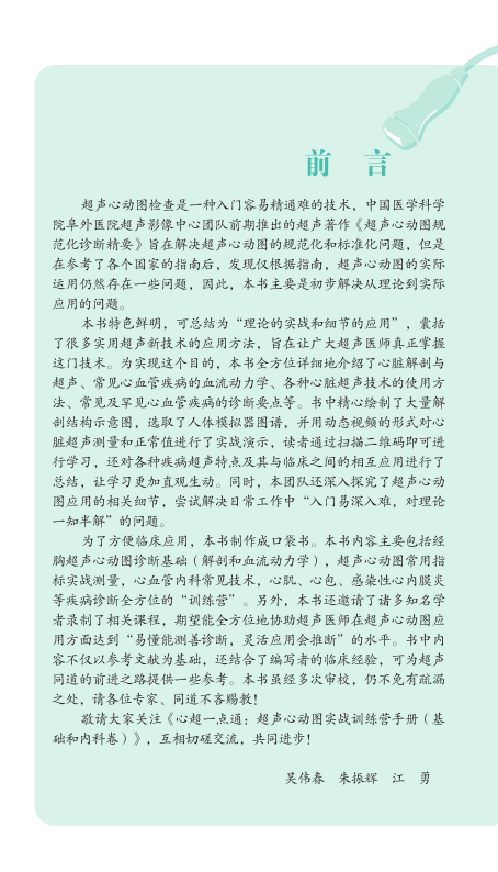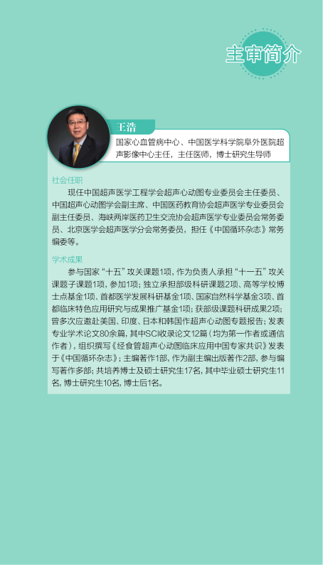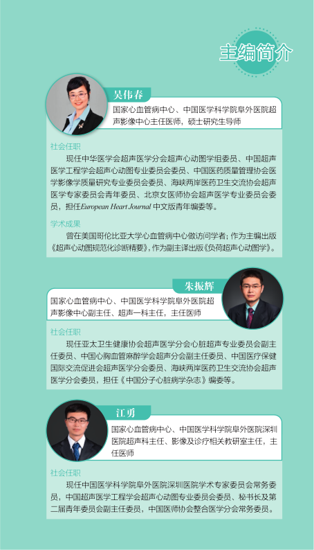 本书内容翔实、通俗易通、语言生动形象,是一本难得的超声心动图临床和科研用书。希望超声同道充分利用本书,精进超声诊疗水平,为心血管领域超声事业的发展及临床医学的长足进步贡献力量。