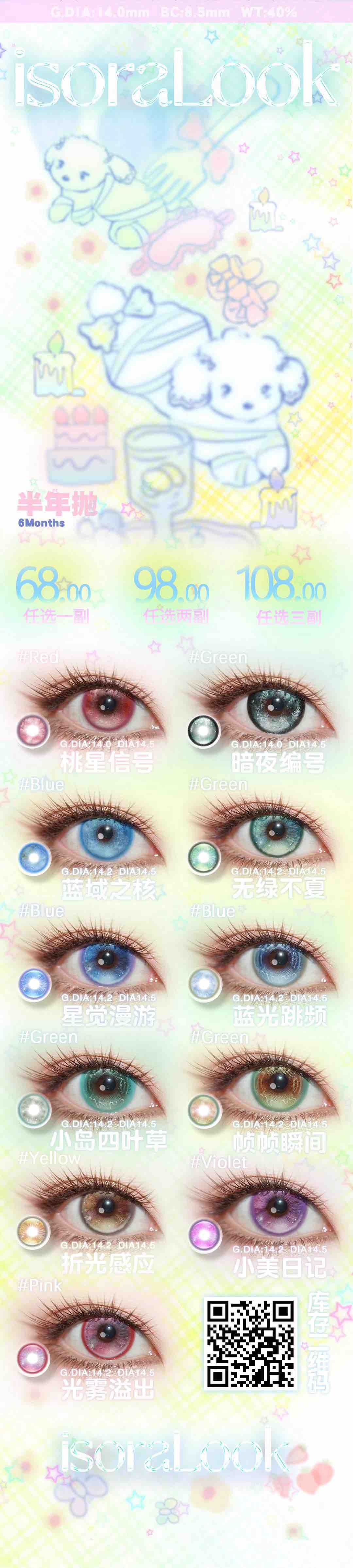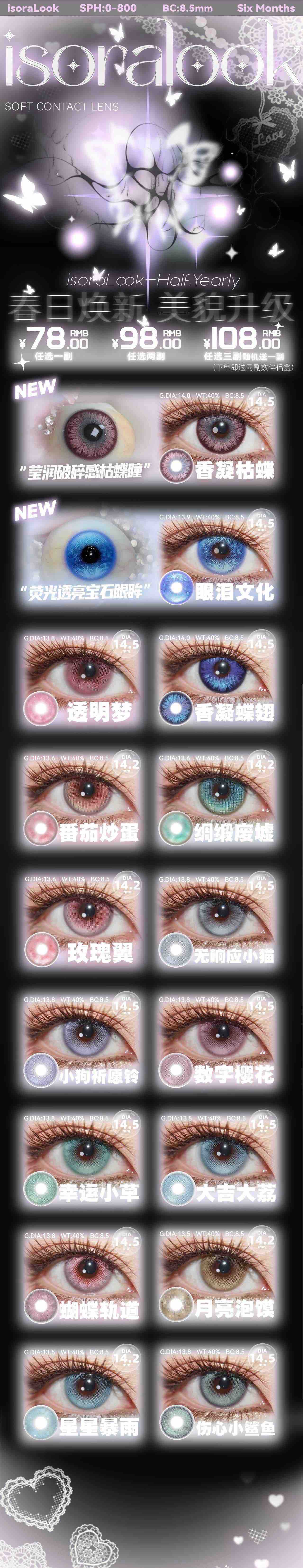 isoralook香凝蝶翅/小狗祈愿铃/大吉大荔/无响应小猫等半年抛美瞳 一副68 两副88 三副98
