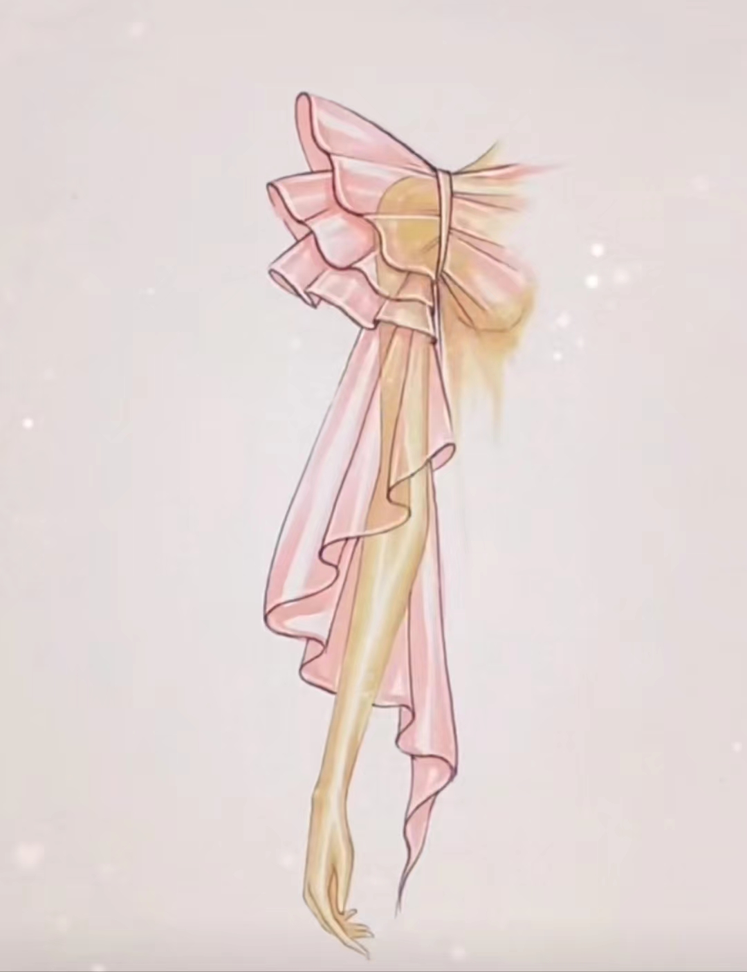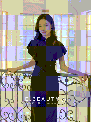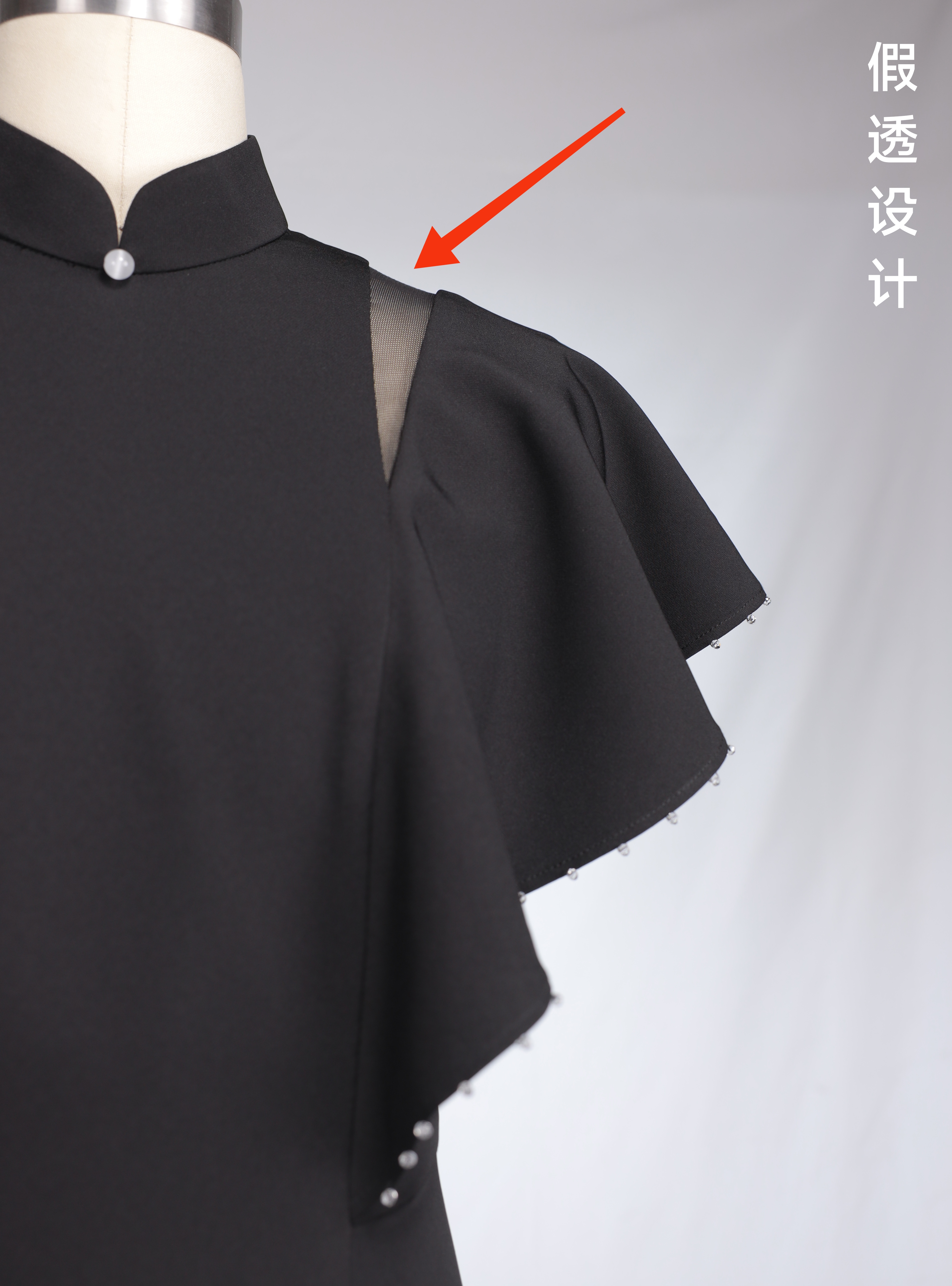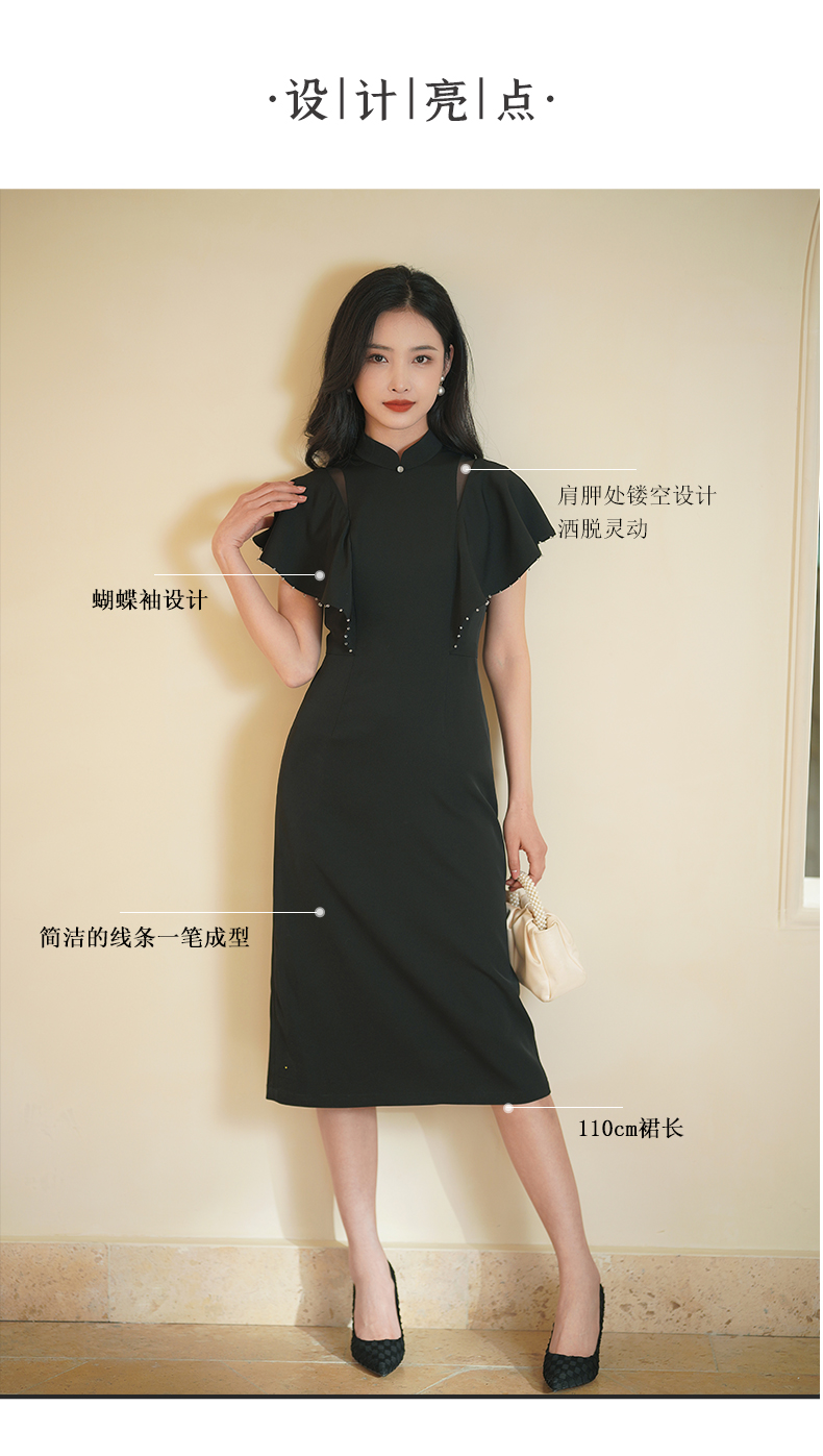 蝴蝶袖的造型好看,俏皮还带着那么点洒脱, 十分飘逸。 我把这个元素也应用到了咱们连衣裙上 。哈哈,怎么的也要给大家设计一个不一样的连衣裙啊 。 袖口边的水晶串珠,是老师傅一颗一颗缝上去的,匠心制作!