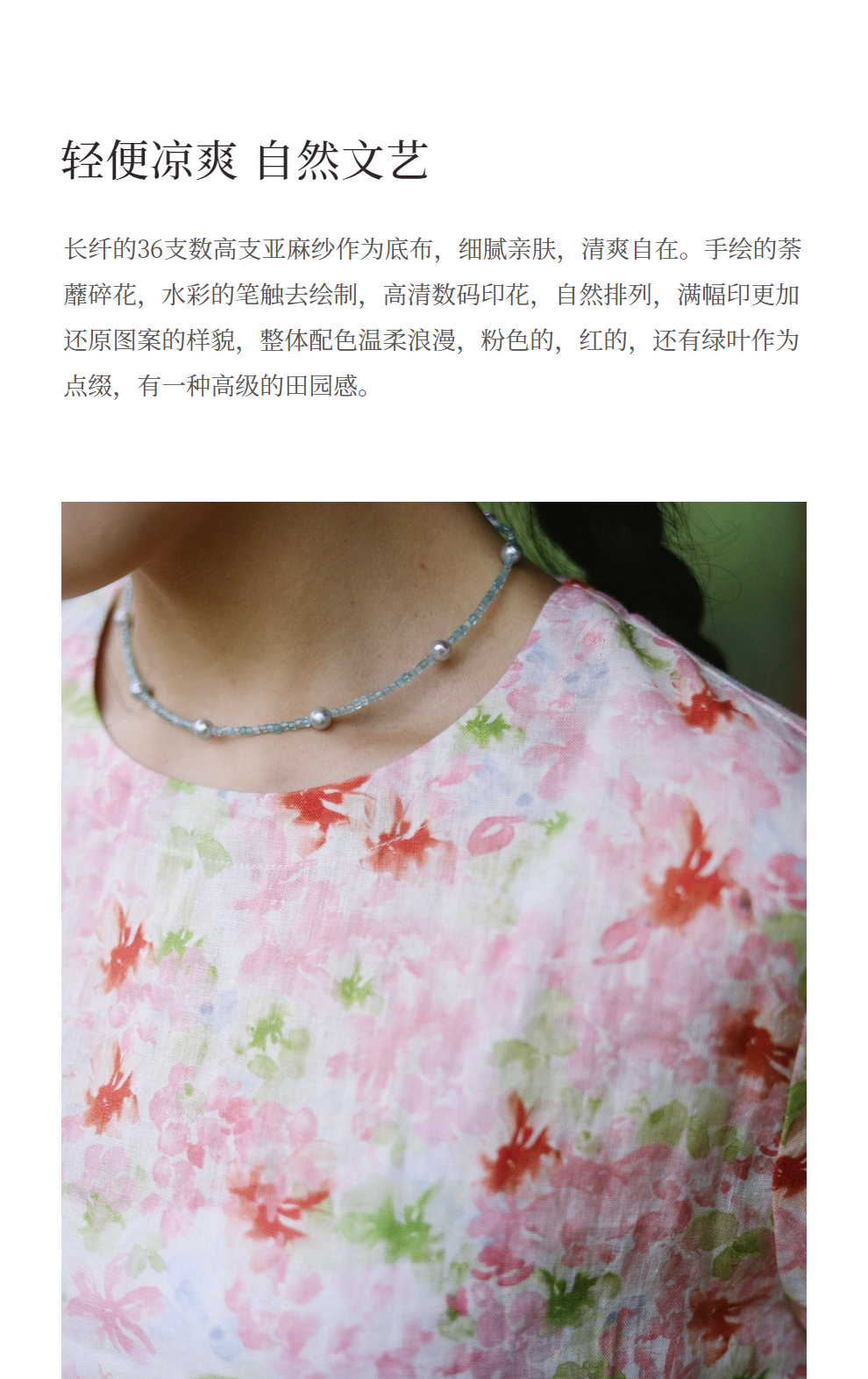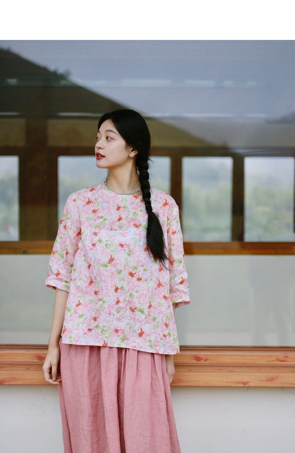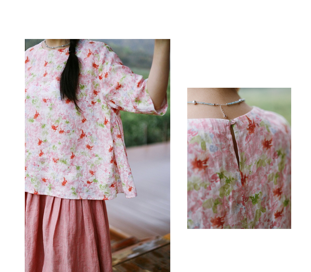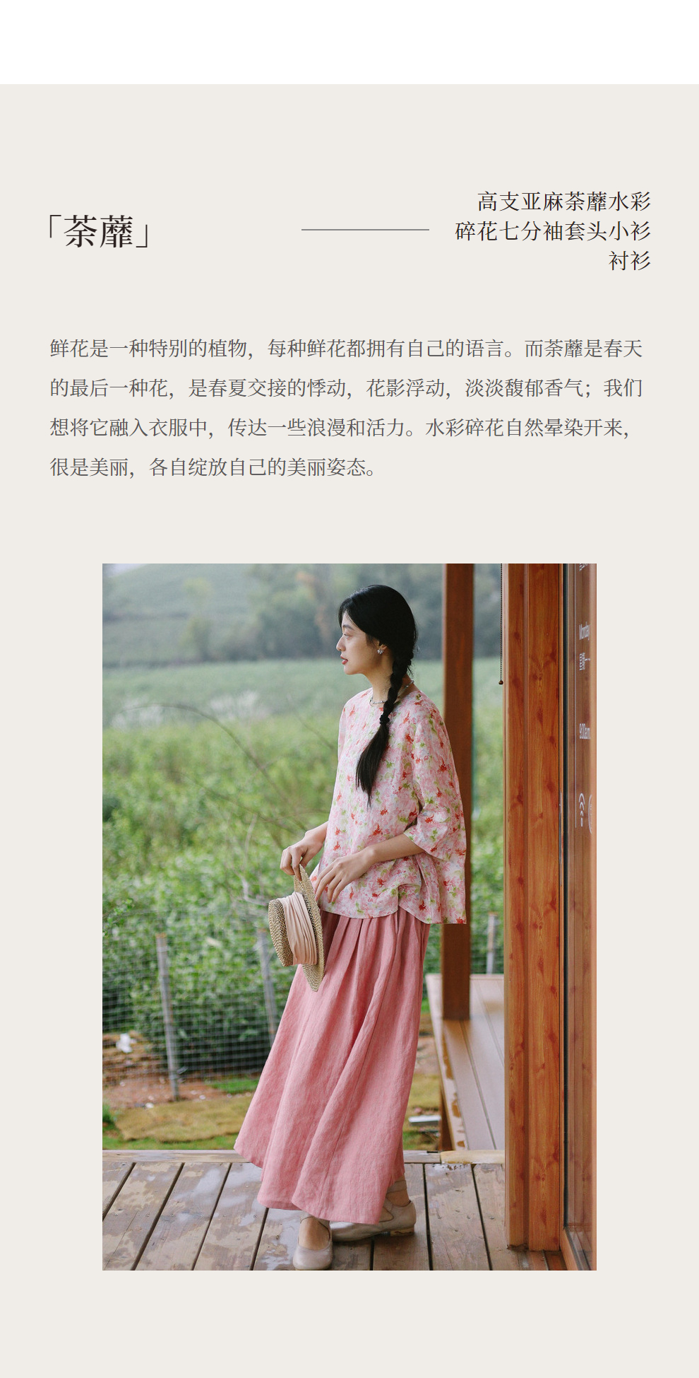 * 绽放252朵/荼蘼水彩碎花高支亚麻七分袖套头宽松休闲旅游穿搭衬衫