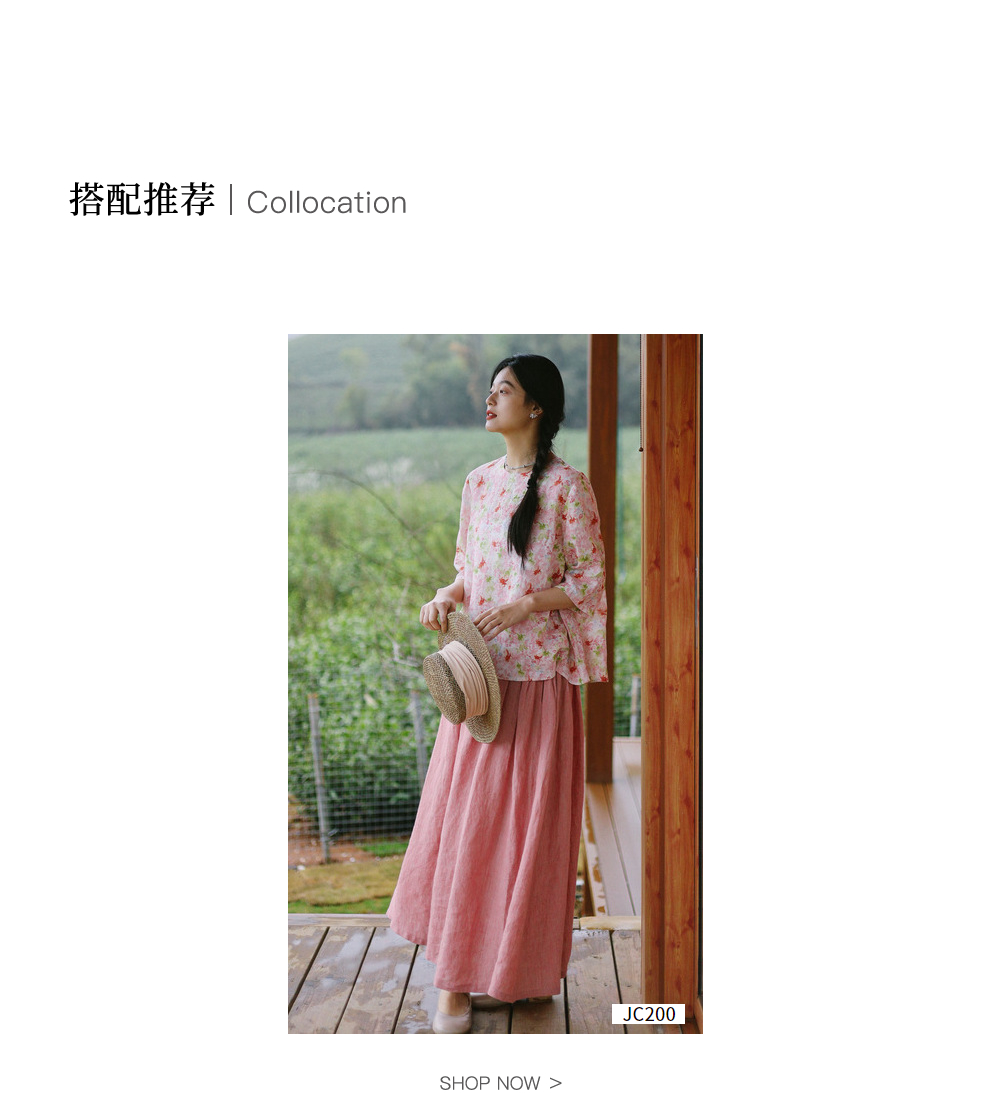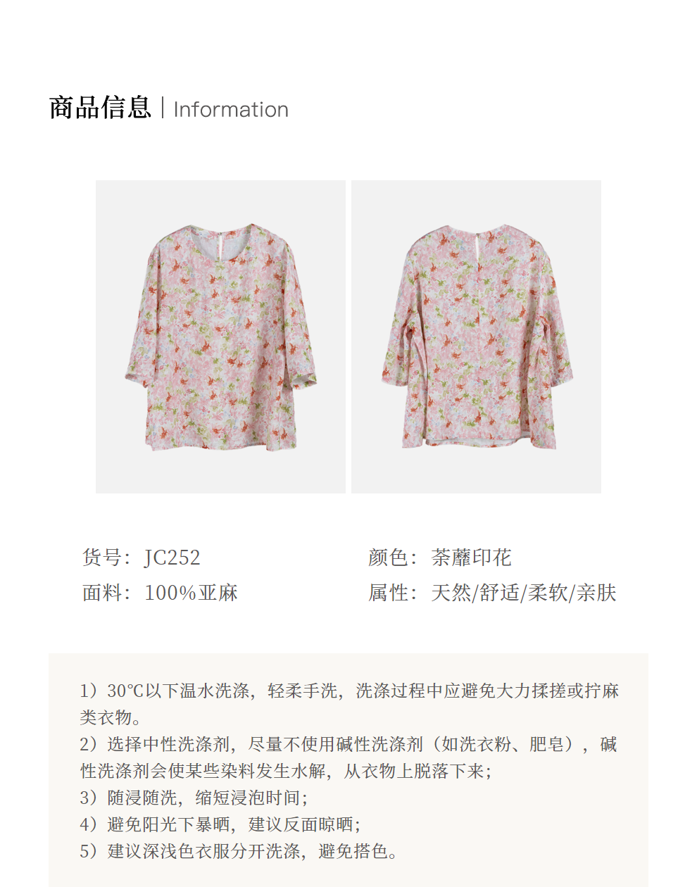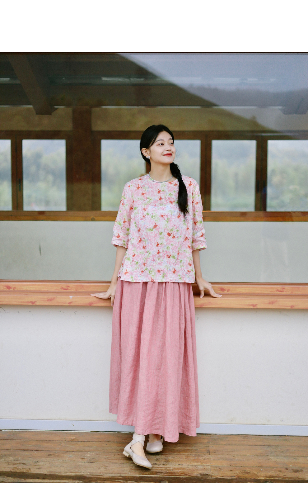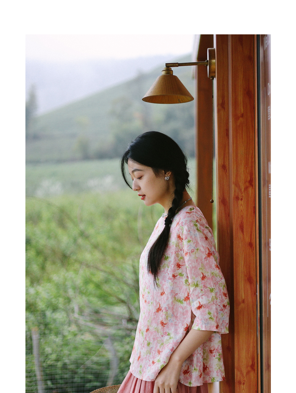 * 绽放252朵/荼蘼水彩碎花高支亚麻七分袖套头宽松休闲旅游穿搭衬衫