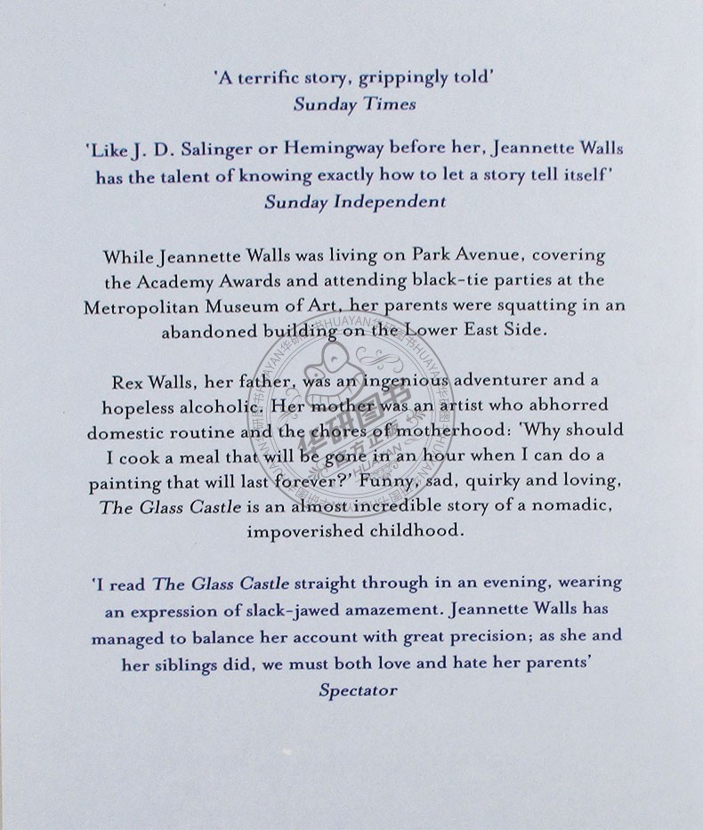 书名:The Glass Castle: A Memoir玻璃城堡:珍妮特·沃尔斯自传-英版