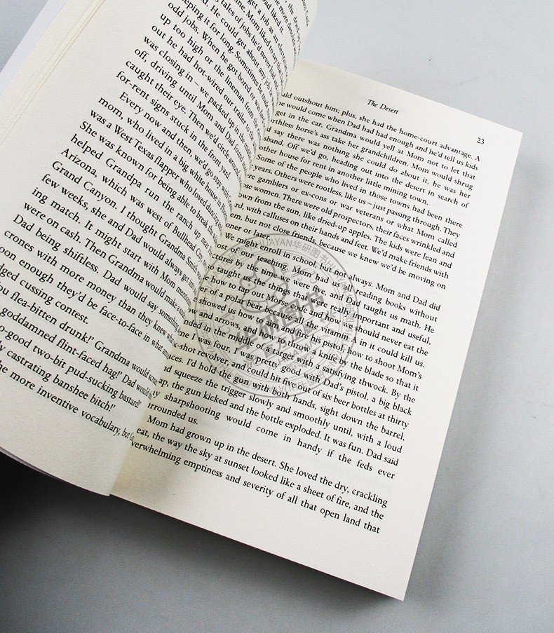 所以,珍妮特和她的兄弟姐妹从小就过着与众不同的生活:因为拖欠水电费,他们的父母经常深夜带着他们“落荒而逃”。有时车子正好开到了沙漠中央,他们就学印第安人以大地为床,以星空为被;圣诞节,他们的父亲因为丢了工作没钱买礼物,便带他们前往夜空下的亚利桑那沙漠,让他们各自认领一颗星星当礼物;日子拮据,没有钱交午餐费,孩子们便吃同学扔在垃圾桶里的残羹剩饭;衣服破了,他们便往身上涂颜色,好让破洞看不出来;有一次,他们的母亲躲在被窝里偷吃巧克力棒,被孩子们发现,可她竟然狡辩自己是牙龈不好,在运动下巴刺激血液循环……