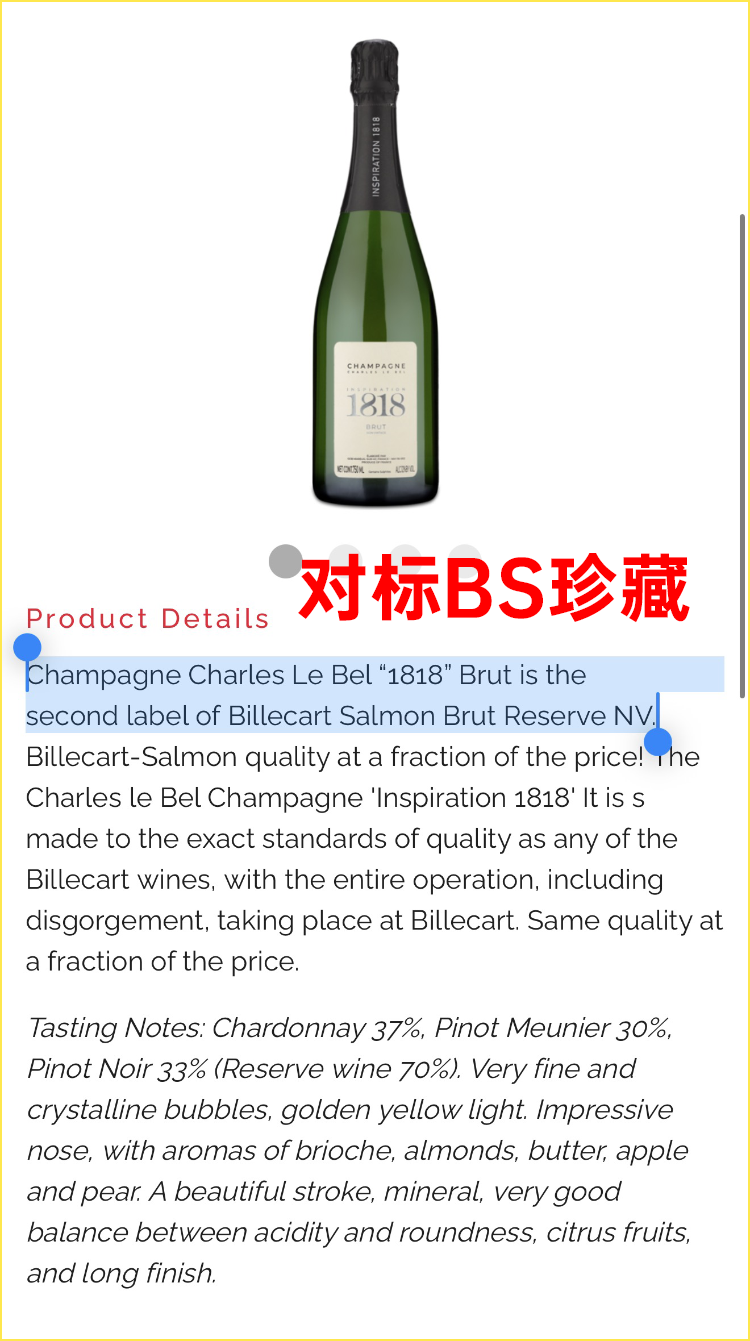 Charles Le Be Inspiration “1818”便是Billecart-Salmon按Brut Reserve NV标准酿造的另一个标(上述所说¥660那款)。