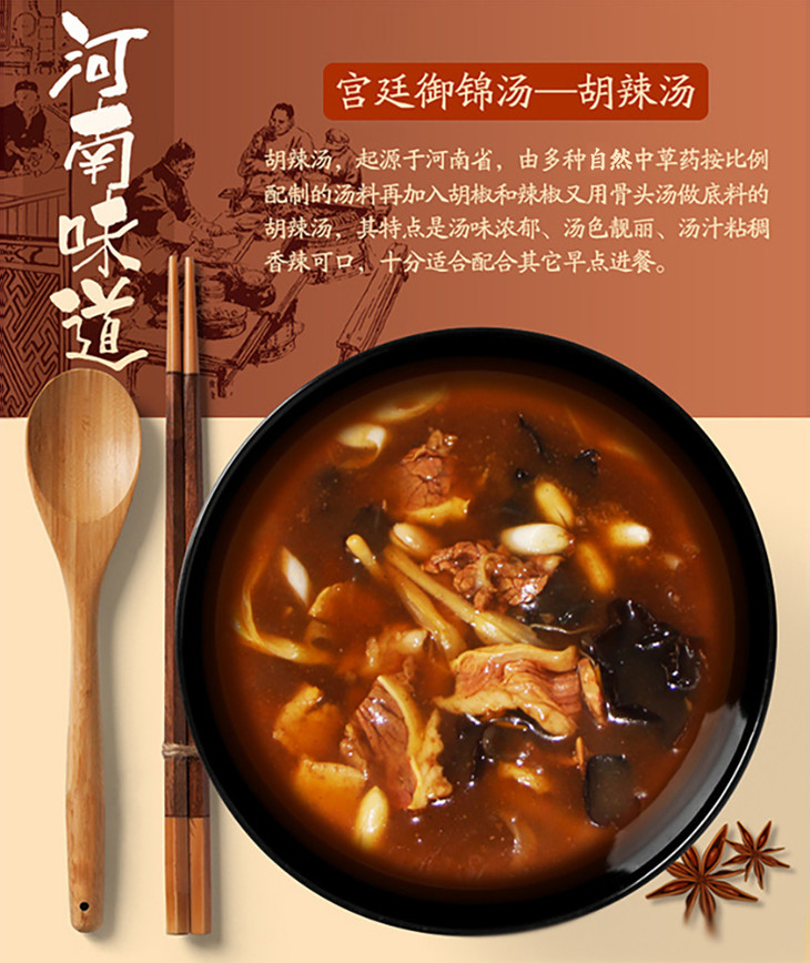 在河南,小到犄角旮旯里的小铺,大到装修奢华的星级餐厅,都有胡辣汤的身影。这碗占据90%河南人早餐桌的胡辣汤,还曾上过央视的《舌尖上的中国3》。不光河南人喜欢喝,去河南的游客,肯定也得喝上一碗胡辣汤,不留遗憾!河南胡辣汤分好几个派系,常见的有逍遥镇和北舞渡。逍遥镇的辣汤生猛,呛辣感直顶喉咙,快感十足;北舞渡则路数温柔,没有过分的辛辣刺激,喝的过程中各种滋味徐徐现之。郑知味速食胡辣汤,就是北舞渡系,是能99%还原店里味道的速食胡辣汤!