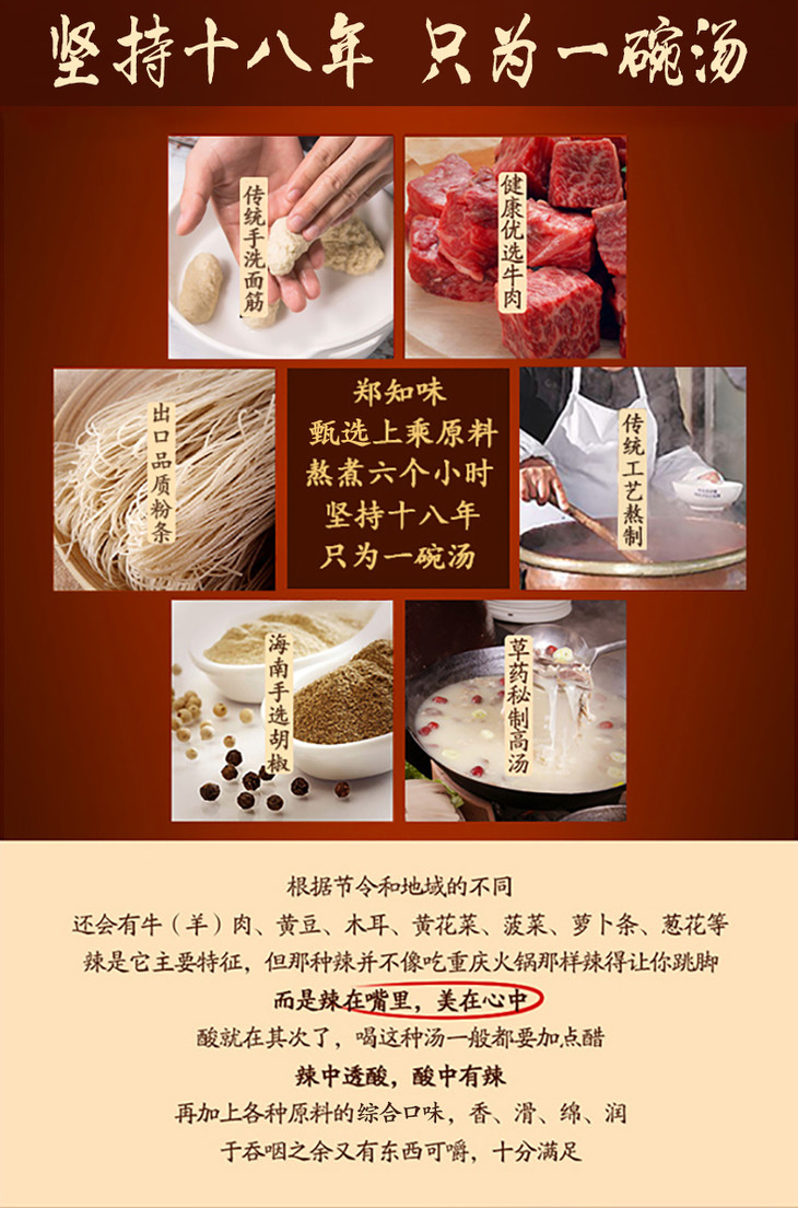 比起其他速食胡辣汤“方便面式的简单料包”,郑知味可以说是沉甸甸了。“牛肉+面筋+高汤”组成的主料包、淀粉包、红薯粉条包、木耳包、酱油包、香油包。它的汤底用旺火烧沸,放入牛棒骨,再加入胡椒等28种天然香料研磨成的调料粉,慢火熬煮6小时左右才熬出来的;面筋用的是地道的手工面筋,再加上南阳本地黄牛肉一起炒制,成就了胡辣汤的点睛之笔;淀粉包,采用精制小麦淀粉,混合海南黑胡椒和白胡椒粉等多种香辛料,轻轻一倒,芡就勾出来了;还有我爱的红薯粉条、黑木耳,都丰富了胡辣汤的口感层次。