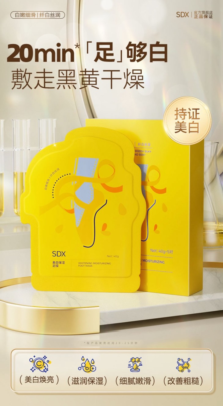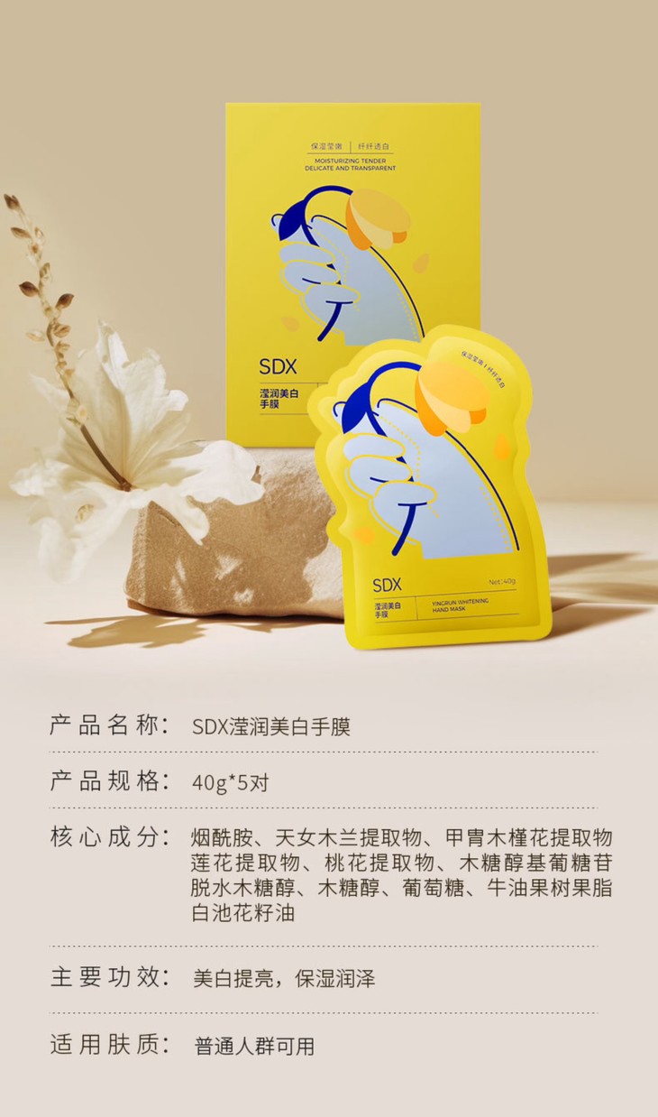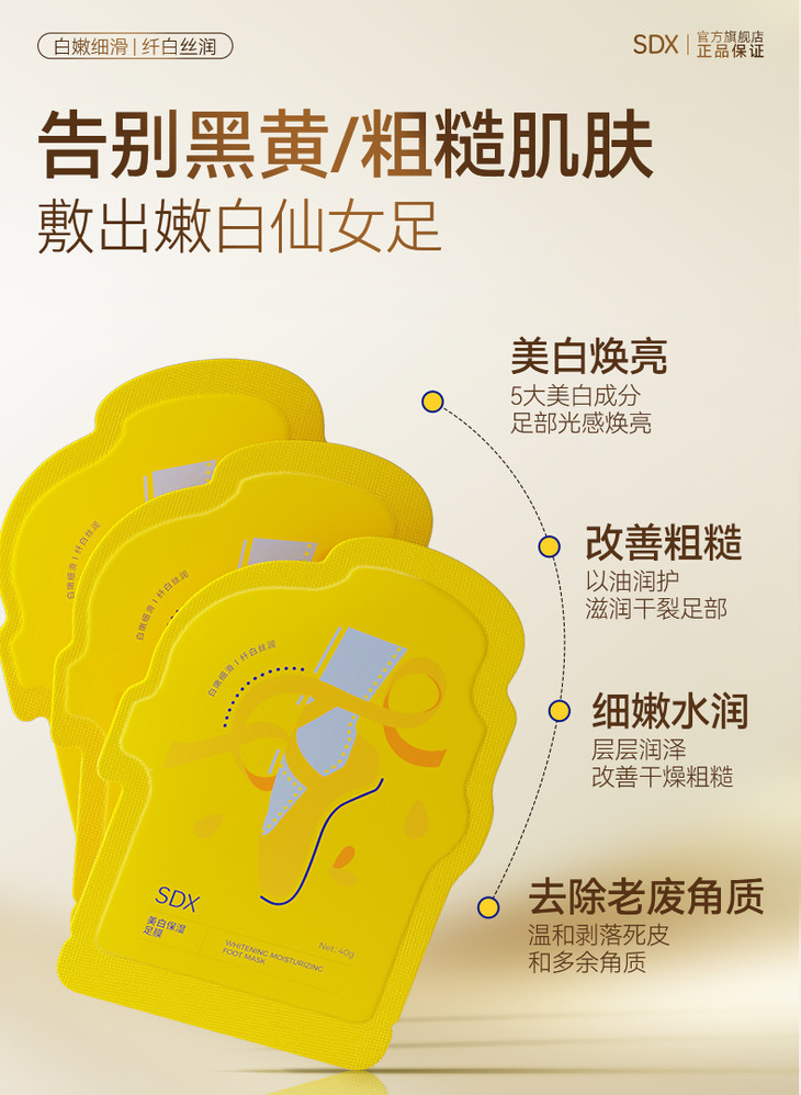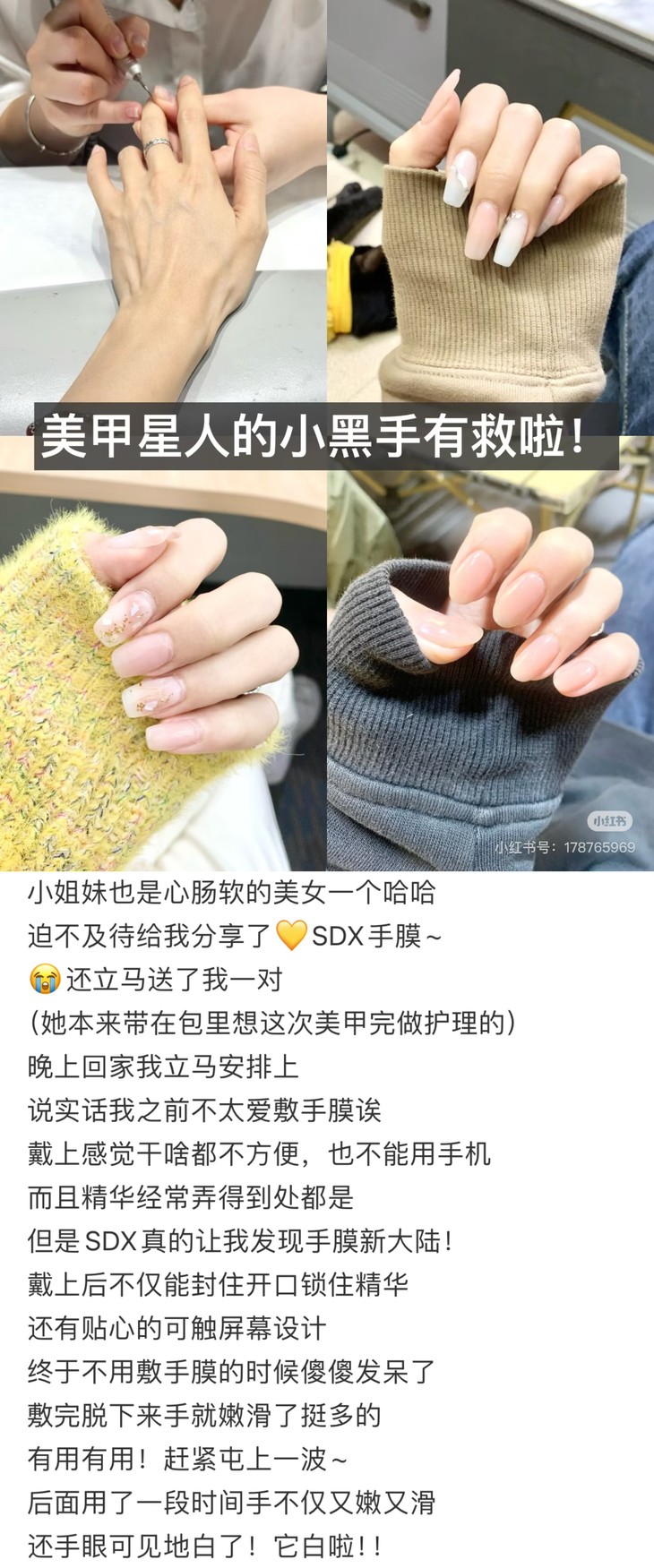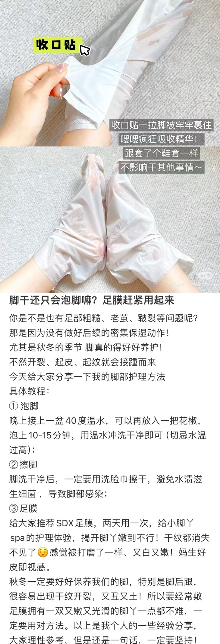 护理可别只盯着脸,手脚作为容易被忽视的部位,一旦变得粗糙,也很容易暴露年龄哦,夏天被晒黑晒干干的,手膜足膜安排上!SDX有国家药监局认证的美白特证的哦,真能让手脚变白,不是表面假白,效果经过专业检验,SDX还专门做了人体斑贴测试,确保不会有不良反应,敏肌也能放心用!而且,还不用特意挤时间:下班回家窝在沙发追剧时,顺手套上膜套,追剧的功夫就能完成护理,敷完不用费劲清洗,揭下来轻轻按摩,精华就能完全吸收,摸起来滑滑的,还不黏腻,体验感超棒!