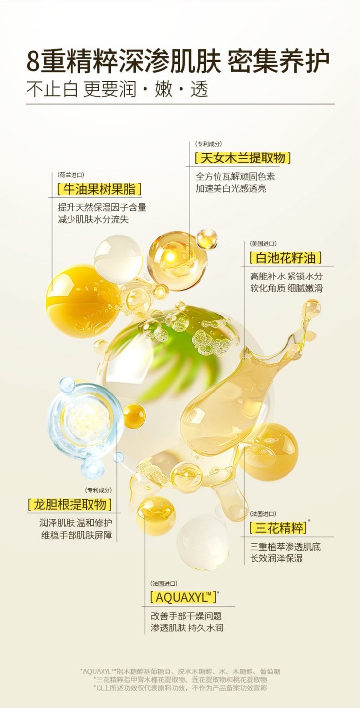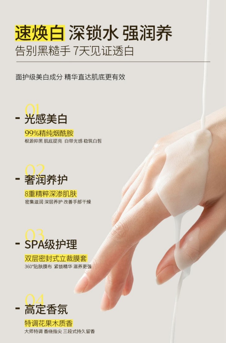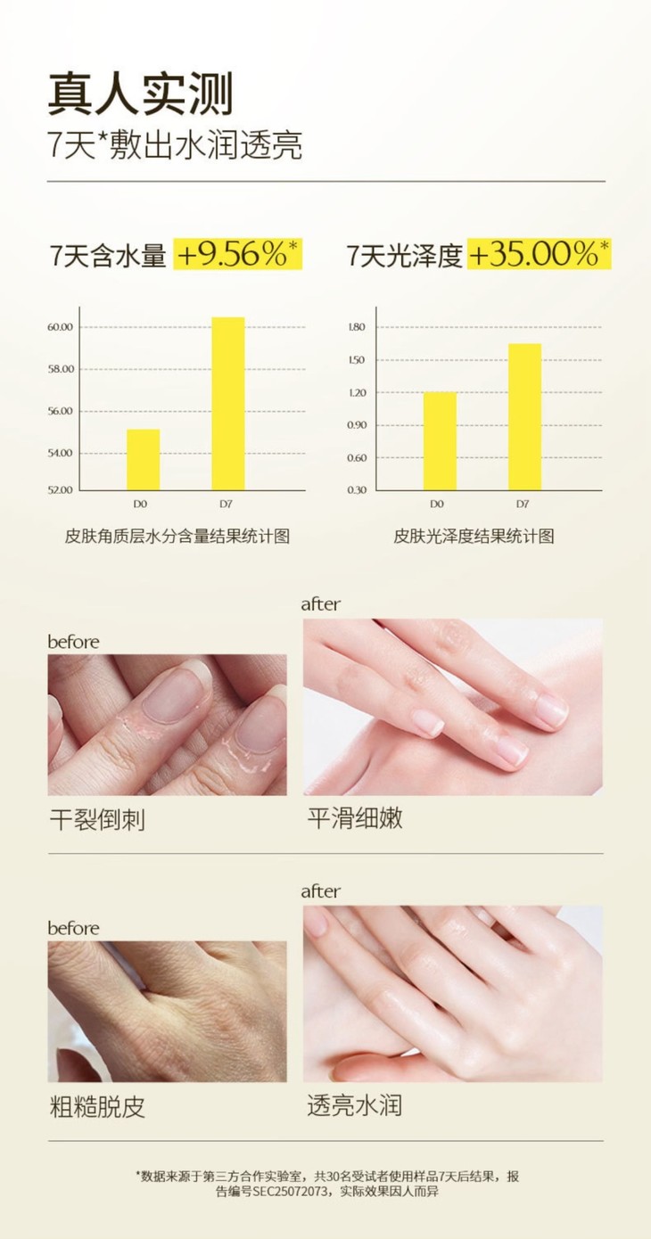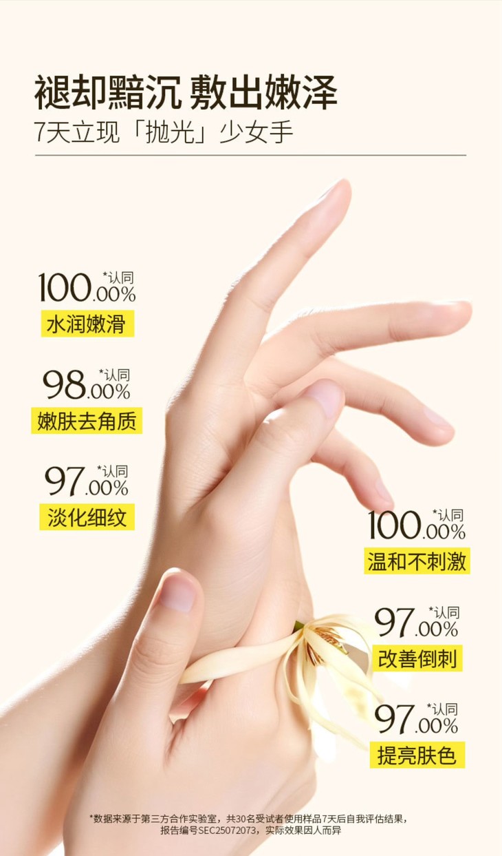 先说说它的成分有多实在,全是脸上护肤品才舍得用的好东西!手膜里添加了99%高纯度烟酰胺,能直击黑色素生成环节,阻断黑色素向表层转移,从源头提亮手部肤色;还有专利天女木兰和龙胆因子,前者抗暗沉、后者修护敏感;再搭配牛油果树果脂、法国AQUAXYL™等补水锁水成分,坚持敷几次,手上的倒刺、干纹就能缓解不少。