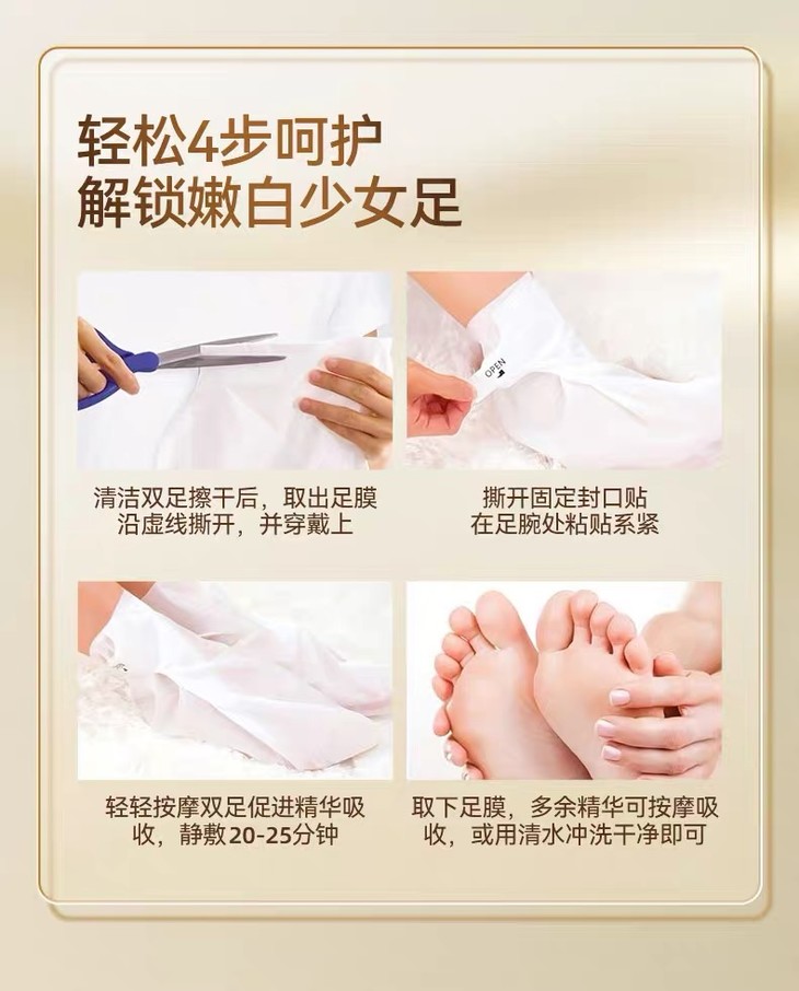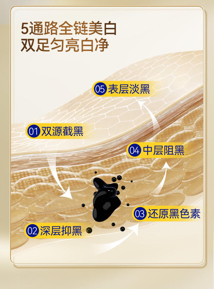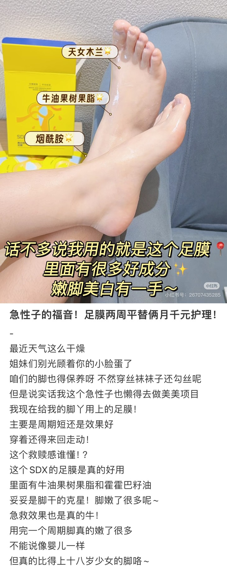 足膜同样有扛打,专门给脚丫子做精致SPA。除了99%高纯度烟酰胺,还搭配了377,一个拦着黑色素生成,一个阻止黑色素向皮肤表面跑,再加上5通路全链美白技术,能从深层到表层慢慢淡化暗沉,不只是涂白脚背,连脚趾缝、脚掌都能均匀提亮。而且还特别注重滋润,添加了深海两节荠籽油、美国霍霍巴籽油和荷兰牛油果果脂,敷完后脚后跟的硬皮轻轻一擦就能掉,连磨脚器都省了!