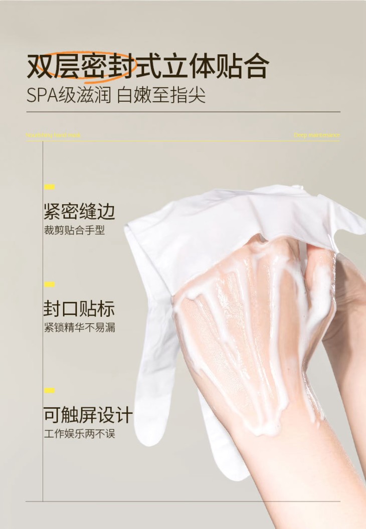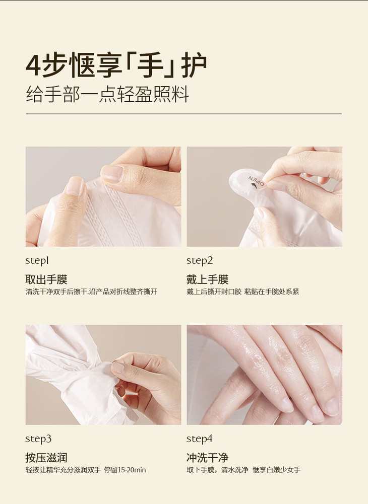 每片手膜/足膜都是40g大容量精华液,双层密封立裁膜套,软乎乎地贴上,能360°裹住精华不渗漏,15分钟取下后,粗糙的皮肤会变得柔软细腻,连顽固的老茧、角质都像被溶解了一样,手又嫩又香,连护手霜都省了,脚丫子又嫩又润,穿拖鞋、高跟鞋都能大方露脚!