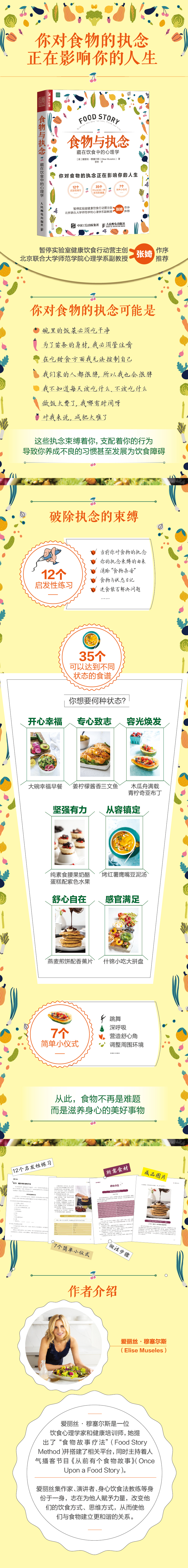 书中没有硬性的行动计划,而是充满了发人深省的问题、启发性的练习和切实可行的工具,此外还*含了35个让人垂涎欲滴且能帮助我们达到目标状态的食谱及7个养成良好习惯的小仪式。我们的最*目标*是控制食物,而是让食物帮我们过上更好的生活。