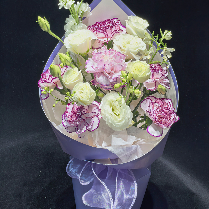 【母亲节】新鲜鲜花花束紫韵凝香·温婉之约(6朵康乃馨+1朵紫罗兰+配花)可备注送货时间