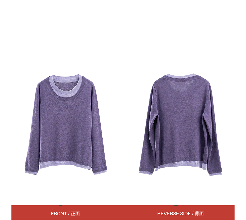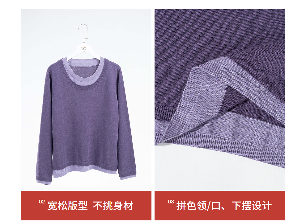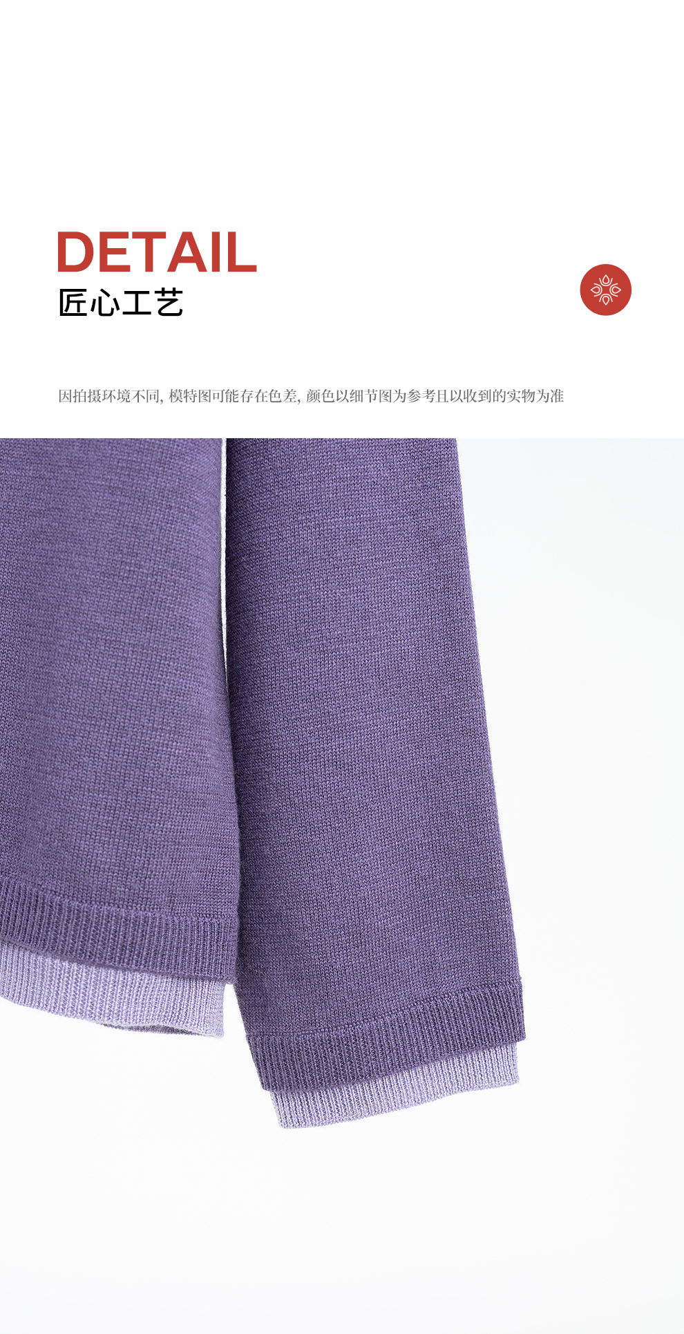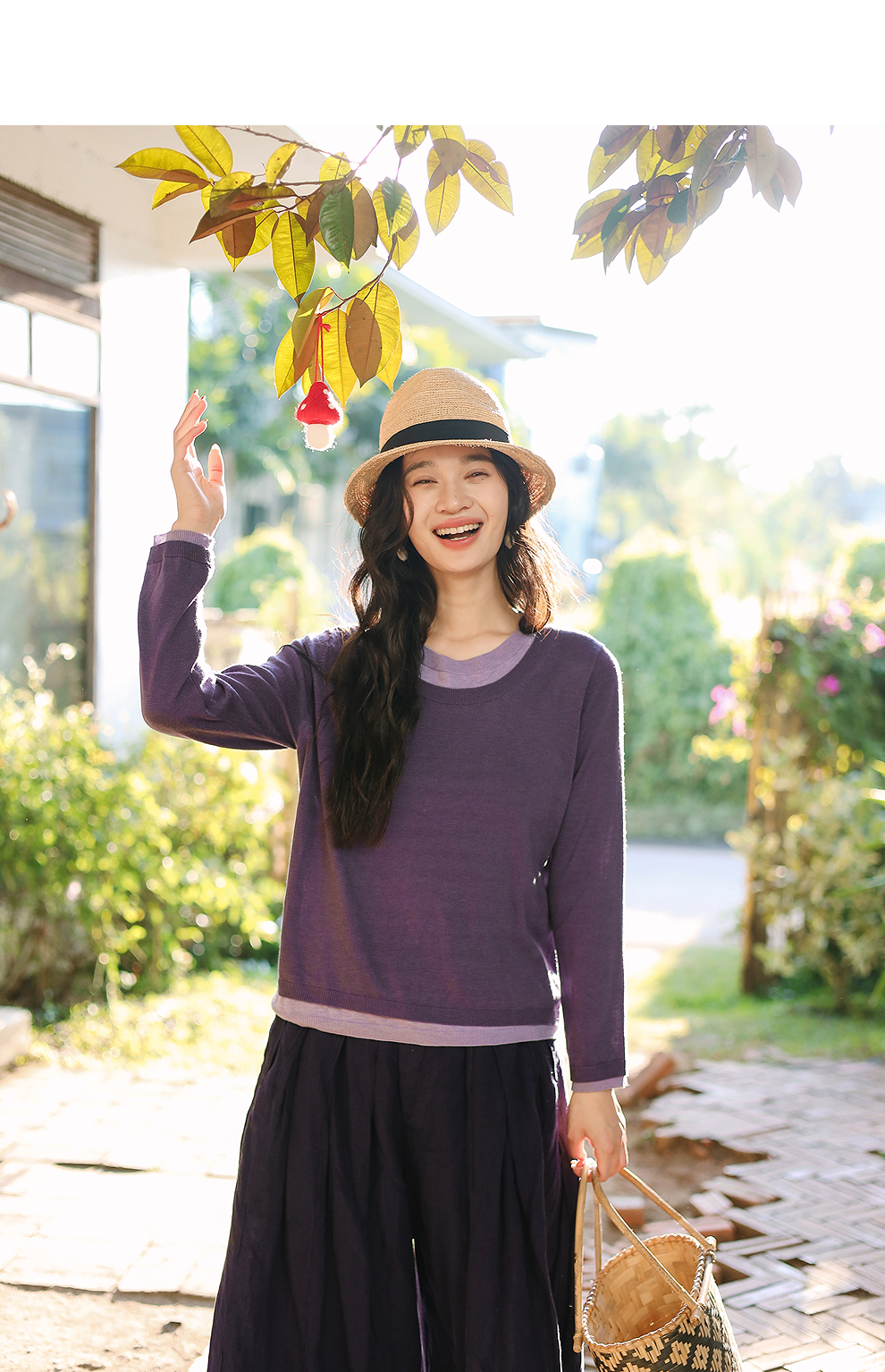 绽放旅行女装095朵/绢丝羊毛混纺拼色文艺精纺长袖套头毛织T恤