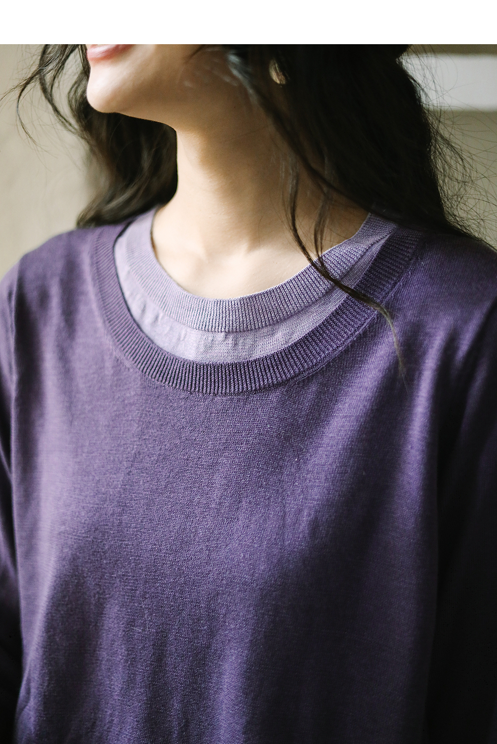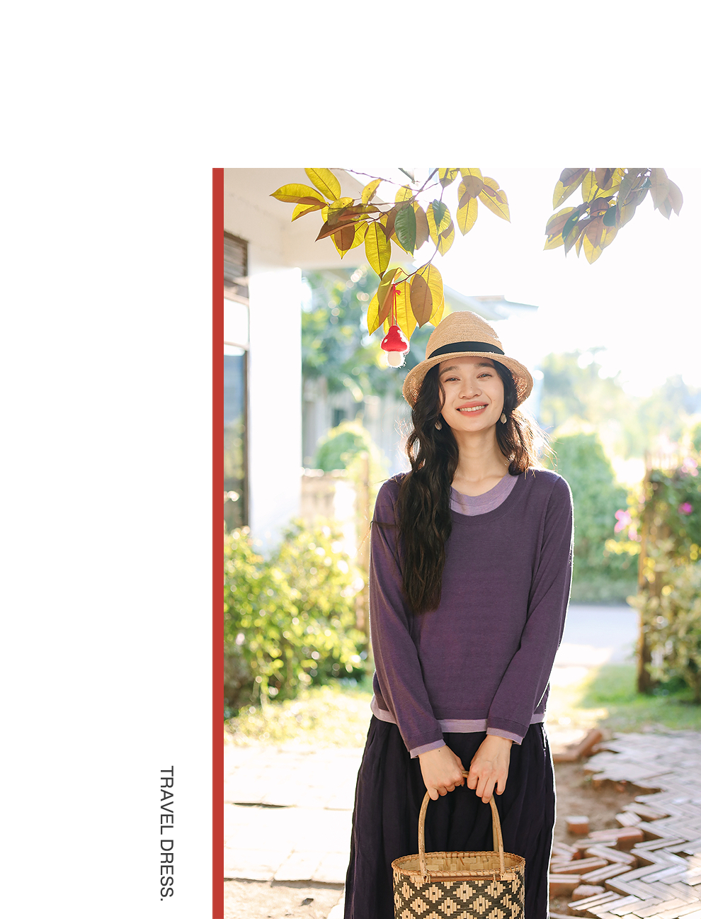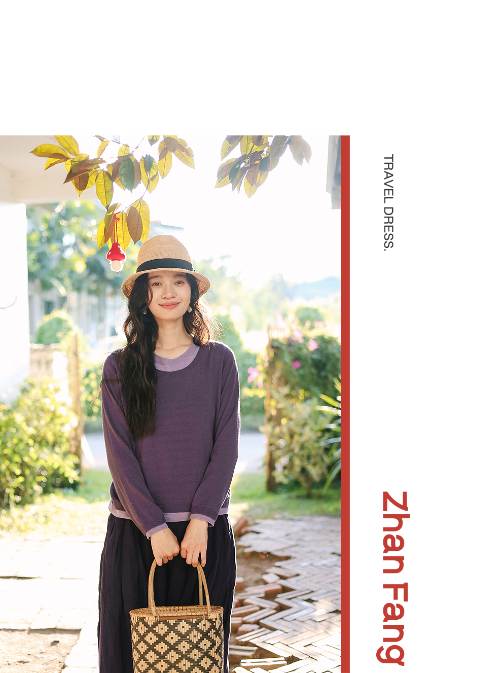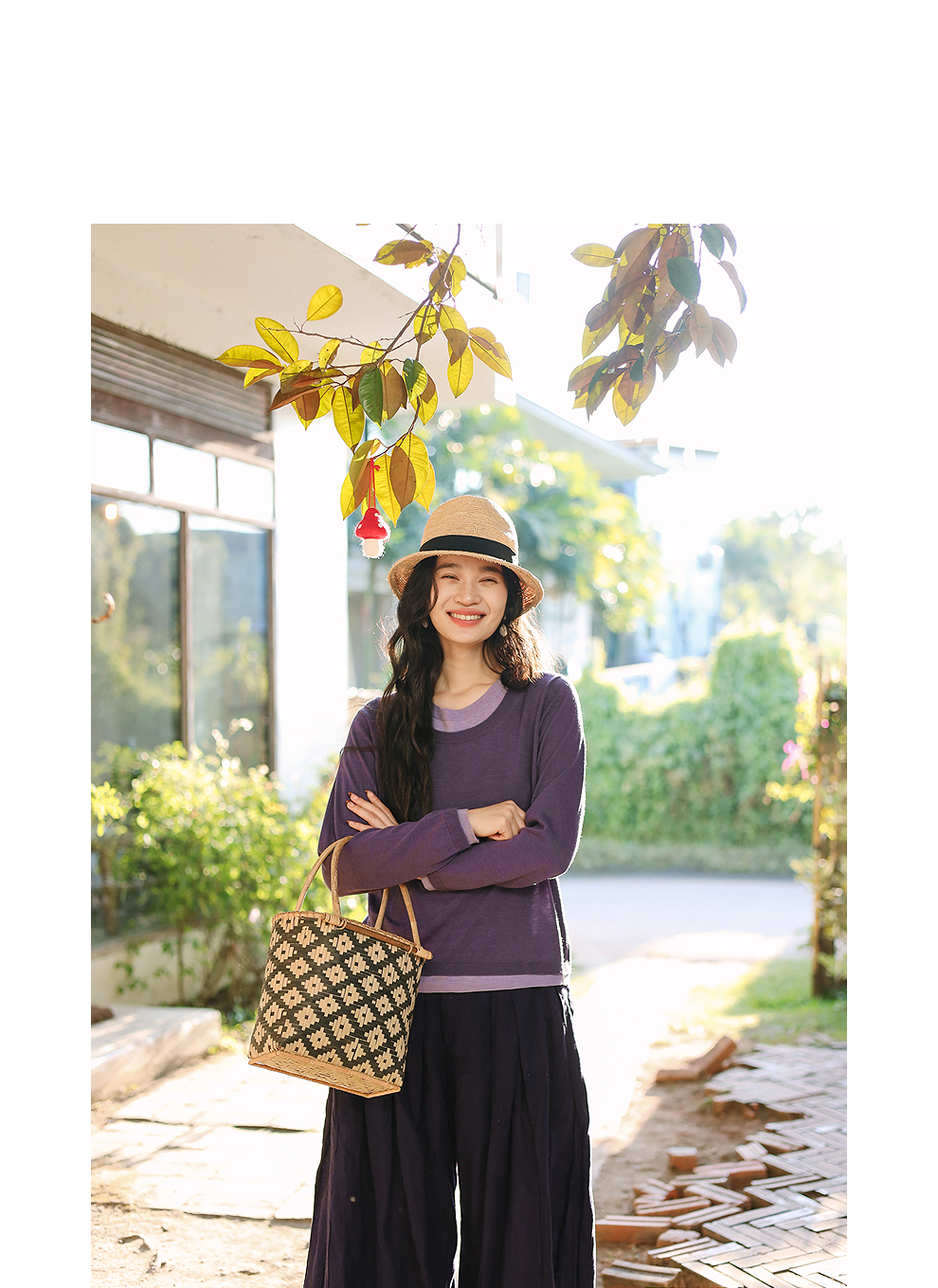 绽放旅行女装095朵/绢丝羊毛混纺拼色文艺精纺长袖套头毛织T恤