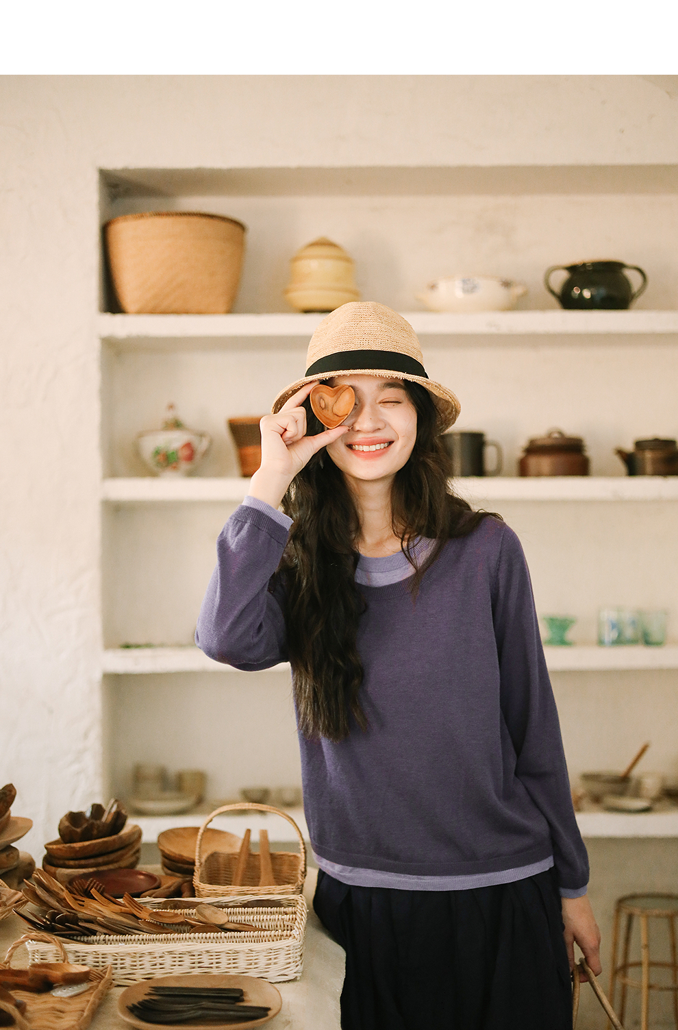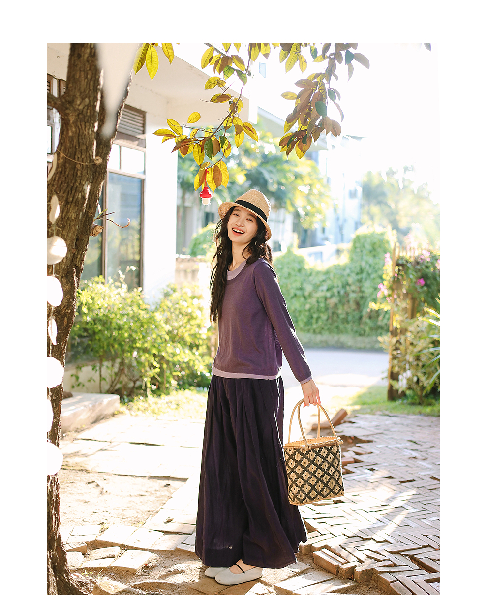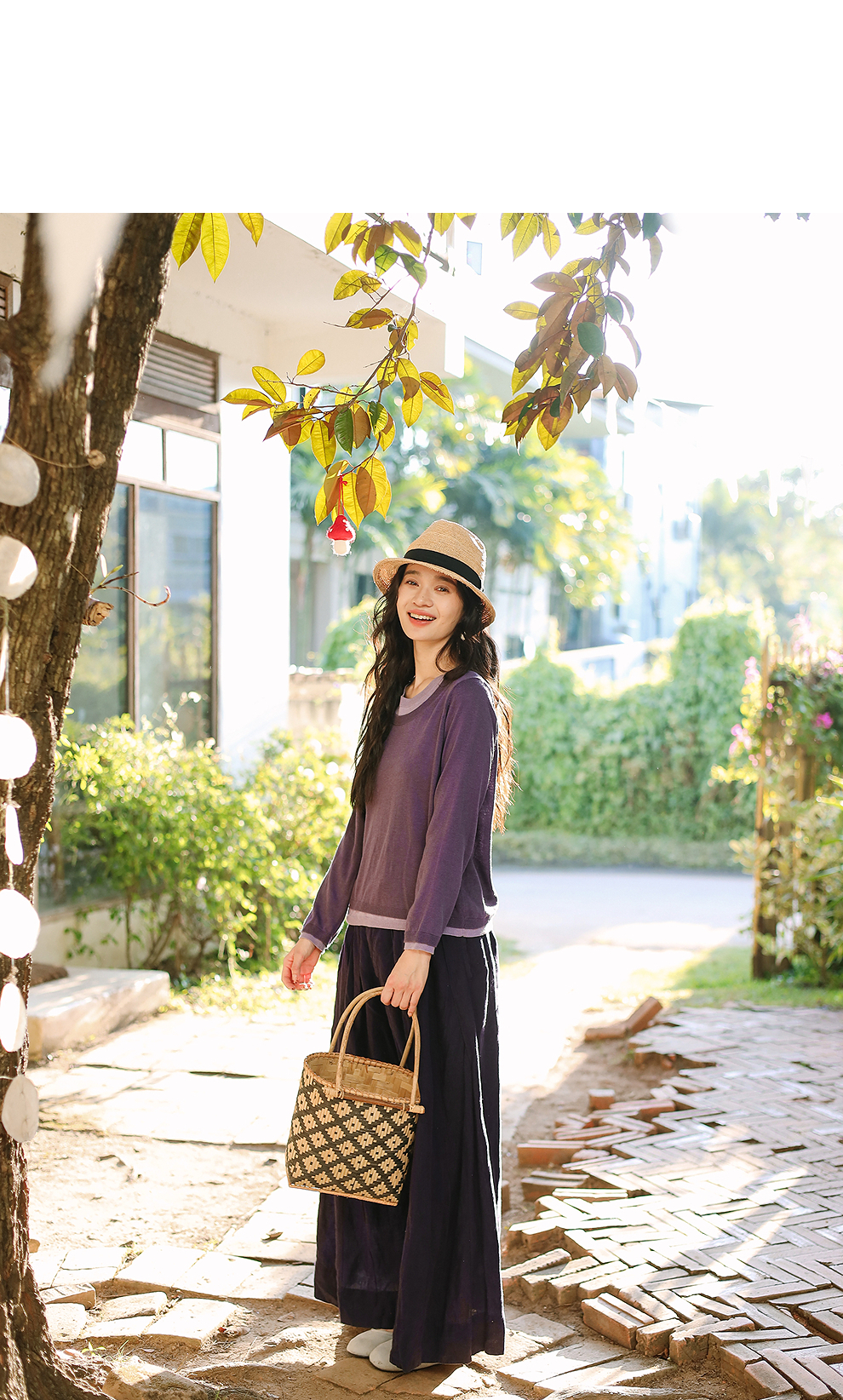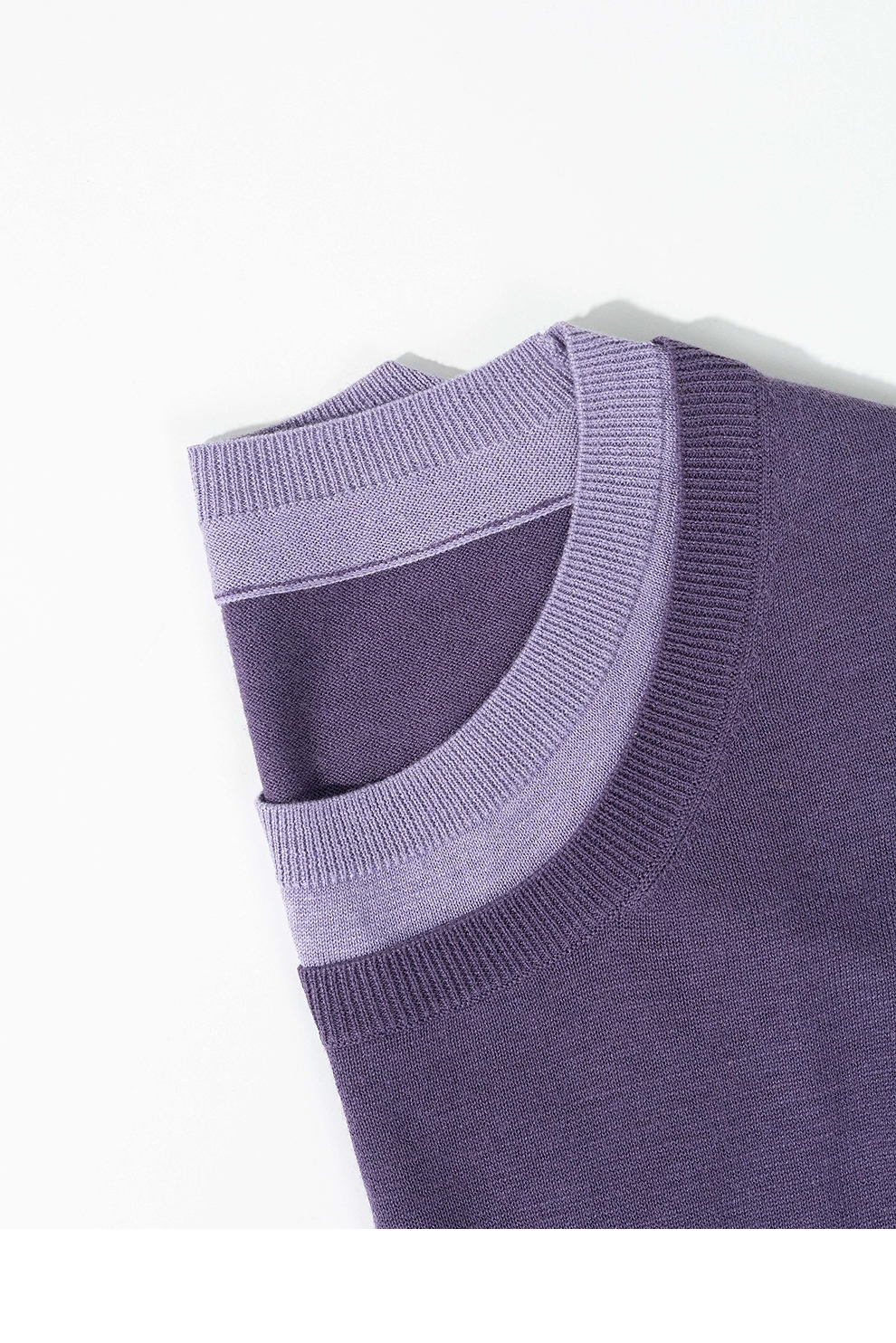 绽放旅行女装095朵/绢丝羊毛混纺拼色文艺精纺长袖套头毛织T恤
